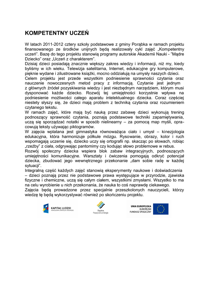KOMPETENTNY UCZEŃ W latach 2011-2012 cztery szkoły podstawowe z gminy Porąbka w ramach projektu finansowanego ze środków unijnych będą realizowały cykl zajęć „Kompetentny uczeń”. Bazę do tego projektu stanowią programy autorskie Akademii Nauki - ”Mądre Dziecko” oraz „Uczeń z charakterem”. Dzisiaj dzieci posiadają znacznie większy zakres wiedzy i informacji, niż my, kiedy byliśmy w ich wieku. Telewizja satelitarna, Internet, edukacyjne gry komputerowe, pięknie wydane i zilustrowane książki, mocno oddziałują na umysły naszych dzieci. Celem projektu jest przede wszystkim podniesienie sprawności czytania oraz nauczenie nowoczesnych metod pracy z informacją. Czytanie jest jednym z głównych źródeł pozyskiwania wiedzy i jest niezbędnym narzędziem, którym musi dysponować każde dziecko. Rozwój tej umiejętności korzystnie wpływa na podniesienie możliwości całego aparatu intelektualnego dziecka. Coraz częściej niestety słyszy się, że dzieci mają problem z techniką czytania oraz rozumieniem czytanego tekstu. W ramach zajęć, które mają być nauką przez zabawę dzieci wykonują trening podnoszący sprawność czytania, poznają podstawowe techniki zapamiętywania, uczą się sporządzać notatki w sposób nielinearny – za pomocą map myśli, opracowują teksty używając piktogramów. W zajęcia wplatana jest gimnastyka równoważąca ciało i umysł – kinezjologia edukacyjna, która harmonizuje półkule mózgu. Rysowanie, obrazy, kolor i ruch wspomagają uczenie się, dziecko uczy się ortografii np. skacząc po słowach, robiąc „rzeźby” z ciała, odgrywając pantomimy czy kodując słowo problemowe w rebus. Rozwój społeczny dziecka wspiera blok zabaw integracyjnych, podnoszących umiejętności komunikacyjne. Warsztaty i ćwiczenia pomogają odkryć potencjał dziecka, zbudować jego wewnętrznego przekonanie „dam sobie radę w każdej sytuacji”. Integralną część każdych zajęć stanowią eksperymenty naukowe i doświadczenia – dzieci poznają przez nie podstawowe prawa występujące w przyrodzie, zjawiska fizyczne i chemiczne, uczą się całym ciałem, wszystkimi zmysłami. Wszystko to ma na celu wyrobienie u nich przekonania, że nauka to coś naprawdę ciekawego. Zajęcia będą prowadzone przez specjalnie przeszkolonych nauczycieli, którzy wiedzę tę będą wykorzystywać również po skończeniu projektu.