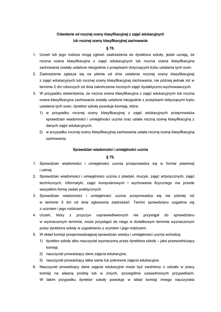 Odwołanie od rocznej oceny klasyfikacyjnej z zajęć edukacyjnych lub rocznej oceny klasyfikacyjnej zachowania § 78. 1. Uczeń lub jego rodzice mogą zgłosić zastrzeżenia do dyrektora szkoły, jeżeli uznają, że roczna ocena klasyfikacyjna z zajęć edukacyjnych lub roczna ocena klasyfikacyjna zachowania zostały ustalone niezgodnie z przepisami dotyczącymi trybu ustalania tych ocen. 2. Zastrzeżenia zgłasza się na piśmie od dnia ustalenia rocznej oceny klasyfikacyjnej z zajęć edukacyjnych lub rocznej oceny klasyfikacyjnej zachowania, nie później jednak niż w terminie 2 dni roboczych od dnia zakończenia rocznych zajęć dydaktyczno-wychowawczych. 3. W przypadku stwierdzenia, że roczna ocena klasyfikacyjna z zajęć edukacyjnych lub roczna ocena klasyfikacyjna zachowania zostały ustalone niezgodnie z przepisami dotyczącymi trybu ustalania tych ocen, dyrektor szkoły powołuje komisję, która: 1) w przypadku rocznej oceny klasyfikacyjnej z zajęć edukacyjnych przeprowadza sprawdzian wiadomości i umiejętności ucznia oraz ustala roczną ocenę klasyfikacyjną z danych zajęć edukacyjnych; 2) w przypadku rocznej oceny klasyfikacyjnej zachowania ustala roczną ocenę klasyfikacyjną zachowania. Sprawdzian wiadomości i umiejętności ucznia § 79. 1. Sprawdzian wiadomości i umiejętności ucznia przeprowadza się w formie pisemnej i ustnej. 2. Sprawdzian wiadomości i umiejętności ucznia z plastyki, muzyki, zajęć artystycznych, zajęć technicznych, informatyki, zajęć komputerowych i wychowania fizycznego ma przede wszystkim formę zadań praktycznych. 3. Sprawdzian wiadomości i umiejętności ucznia przeprowadza się nie później niż w terminie 5 dni od dnia zgłoszenia zastrzeżeń. Termin sprawdzianu uzgadnia się z uczniem i jego rodzicami. 4. Uczeń, który z przyczyn usprawiedliwionych nie przystąpił do sprawdzianu w wyznaczonym terminie, może przystąpić do niego w dodatkowym terminie wyznaczonym przez dyrektora szkoły w uzgodnieniu z uczniem i jego rodzicami. 5. W skład komisji przeprowadzającej sprawdzian wiedzy i umiejętności ucznia wchodzą: 1) dyrektor szkoły albo nauczyciel wyznaczony przez dyrektora szkoły – jako przewodniczący komisji; 2) nauczyciel prowadzący dane zajęcia edukacyjne; 3) nauczyciel prowadzący takie same lub pokrewne zajęcia edukacyjne. 6. Nauczyciel prowadzący dane zajęcia edukacyjne może być zwolniony z udziału w pracy komisji na własną prośbę lub w innych, szczególnie uzasadnionych przypadkach. W takim przypadku dyrektor szkoły powołuje w skład komisji innego nauczyciela prowadzącego takie same zajęcia edukacyjne, z tym że powołanie nauczyciela zatrudnionego w innej szkole następuje w porozumieniu z dyrektorem tej szkoły. 7. Ze sprawdzianu wiadomości i umiejętności ucznia sporządza się protokół, zawierający w szczególności: 1) nazwę zajęć edukacyjnych, z których był przeprowadzony sprawdzian; 2) imiona i nazwiska osób wchodzących w skład komisji; 3) termin sprawdzianu wiadomości i umiejętności; 4) imię i nazwisko ucznia; 5) zadania sprawdzające; 6) ustaloną ocenę klasyfikacyjną. 8. Do protokołu dołącza się odpowiednio pisemne prace ucznia, zwięzłą informację o ustnych odpowiedziach ucznia i zwięzłą informację o wykonaniu przez ucznia zadania praktycznego. 9. Protokół stanowi załącznik do arkusza ocen ucznia. Ustalanie rocznej oceny klasyfikacyjnej zachowania przez komisję § 80. 1. W skład komisji ustalającej roczną ocenę klasyfikacyjną zachowania wchodzą: 1) dyrektor szkoły albo nauczyciel wyznaczony przez dyrektora szkoły – jako przewodniczący komisji; 2) wychowawca oddziału; 3) nauczyciel prowadzący zajęcia edukacyjne w danym oddziale; 4) pedagog, jeżeli jest zatrudniony w szkole; 5) psycholog, jeżeli jest zatrudniony w szkole; 6) przedstawiciel samorządu uczniowskiego; 7) przedstawiciel rady rodziców. 2. Komisja ustala roczną ocenę klasyfikacyjną zachowania w terminie 5 dni od dnia zgłoszenia zastrzeżeń. Ocena jest ustalana w drodze głosowania zwykłą większością głosów, w obecności co najmniej 4/7 składu komisji. W przypadku równej liczby głosów decyduje głos przewodniczącego. 3. Z posiedzenia komisji sporządza się protokół, zawierający w szczególności: 1) imiona i nazwiska osób wchodzących w skład komisji; 2) termin posiedzenia komisji; 3) imię i nazwisko ucznia; 4) wynik głosowania; 5) ustaloną ocenę klasyfikacyjną zachowania wraz z uzasadnieniem. 4. Protokół z pracy komisji stanowi załącznik do arkusza ocen ucznia. 5. Ustalona przez komisję roczna ocena klasyfikacyjna z zajęć edukacyjnych oraz roczna ocena klasyfikacyjna zachowania nie może być niższa od ustalonej wcześniej oceny. 6. Ocena ustalona przez komisję jest ostateczna, z wyjątkiem negatywnej rocznej oceny klasyfikacyjnej z zajęć edukacyjnych, która może być zmieniona w wyniku egzaminu poprawkowego. 7. Przepisy dotyczące sprawdzianu wiadomości i umiejętności ucznia stosuje się odpowiednio w przypadku rocznej oceny klasyfikacyjnej z zajęć edukacyjnych ustalonej w wyniku egzaminu poprawkowego, z tym że termin do zgłoszenia zastrzeżeń wynosi 5 dni roboczych od dnia przeprowadzenia egzaminu poprawkowego. W tym przypadku ocena ustalona przez komisję jest ostateczna.