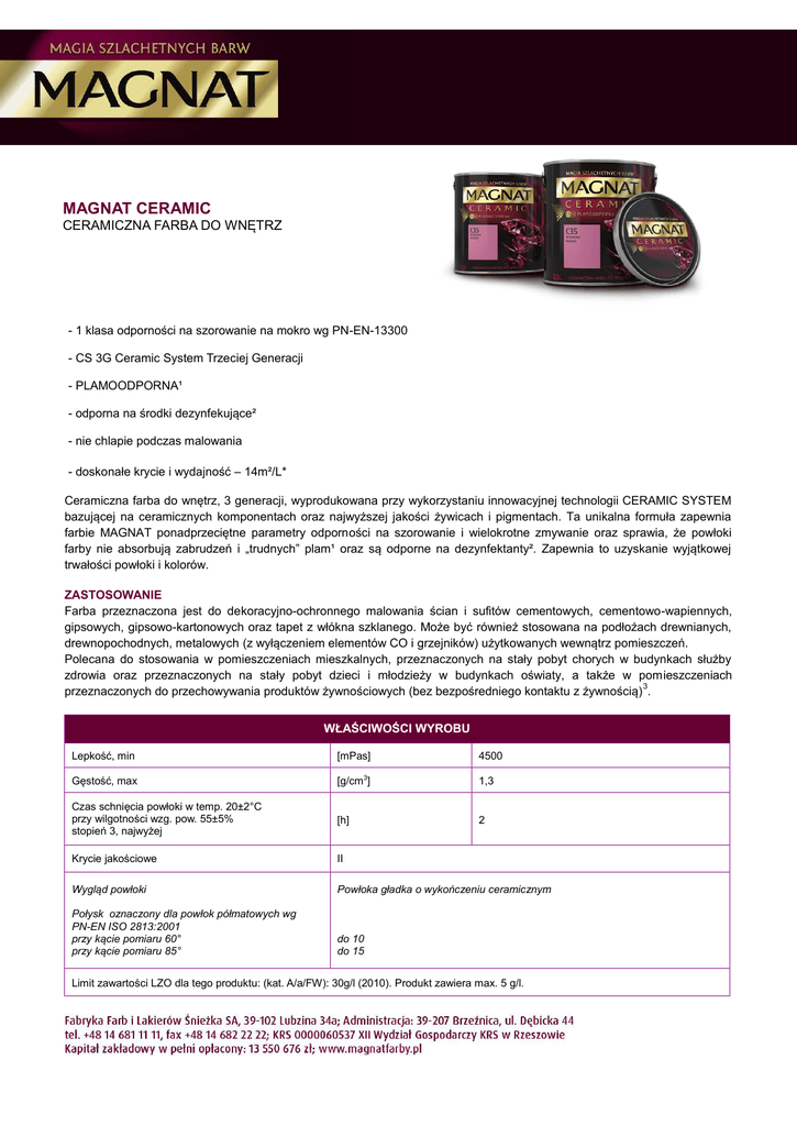 MAGNAT CERAMIC CERAMICZNA FARBA DO WNĘTRZ - 1 klasa odporności na szorowanie na mokro wg PN-EN-13300 - CS 3G Ceramic System Trzeciej Generacji - PLAMOODPORNA¹ - odporna na środki dezynfekujące² - nie chlapie podczas malowania - doskonałe krycie i wydajność – 14m²/L* Ceramiczna farba do wnętrz, 3 generacji, wyprodukowana przy wykorzystaniu innowacyjnej technologii CERAMIC SYSTEM bazującej na ceramicznych komponentach oraz najwyższej jakości żywicach i pigmentach. Ta unikalna formuła zapewnia farbie MAGNAT ponadprzeciętne parametry odporności na szorowanie i wielokrotne zmywanie oraz sprawia, że powłoki farby nie absorbują zabrudzeń i „trudnych” plam¹ oraz są odporne na dezynfektanty². Zapewnia to uzyskanie wyjątkowej trwałości powłoki i kolorów. ZASTOSOWANIE Farba przeznaczona jest do dekoracyjno-ochronnego malowania ścian i sufitów cementowych, cementowo-wapiennych, gipsowych, gipsowo-kartonowych oraz tapet z włókna szklanego. Może być również stosowana na podłożach drewnianych, drewnopochodnych, metalowych (z wyłączeniem elementów CO i grzejników) użytkowanych wewnątrz pomieszczeń. Polecana do stosowania w pomieszczeniach mieszkalnych, przeznaczonych na stały pobyt chorych w budynkach służby zdrowia oraz przeznaczonych na stały pobyt dzieci i młodzieży w budynkach oświaty, a także w pomieszczeniach 3 przeznaczonych do przechowywania produktów żywnościowych (bez bezpośredniego kontaktu z żywnością) . WŁAŚCIWOŚCI WYROBU Lepkość, min [mPas] 4500 Gęstość, max [g/cm ] 1,3 Czas schnięcia powłoki w temp. 20±2°C przy wilgotności wzg. pow. 55±5% stopień 3, najwyżej [h] 2 Krycie jakościowe II Wygląd powłoki Powłoka gładka o wykończeniu ceramicznym Połysk oznaczony dla powłok półmatowych wg PN-EN ISO 2813:2001 przy kącie pomiaru 60° przy kącie pomiaru 85° do 10 do 15 3 Limit zawartości LZO dla tego produktu: (kat. A/a/FW): 30g/l (2010). Produkt zawiera max. 5 g/l. SPOSÓB STOSOWANIA Przygotowanie podłoża Przygotowanie wyrobu Aplikacja Uwagi i odniesienia podłoże powinno być trwałe, suche, bez kurzu, zatłuszczeń i rdzy, świeże tynki mogą być malowane po 3-4 tygodniach sezonowania, tynki gipsowe po 2 tygodniach, tzw. „suche tynki” bezpośrednio po przeszlifowaniu, powierzchnie wykonane w systemie płyt gipsowo-kartonowych, wyszpachlowane lub podłoża pokryte bardzo intensywnym kolorem, pomalować FARBĄ GRUNTUJĄCĄ DO WNĘTRZ MAGNAT GRUNT, stare powłoki farb klejowych usunąć, zmyć i spłukać wodą z dodatkiem środków myjących, aż do odsłonięcia tynku, stare powłoki z farb emulsyjnych, źle przylegające do podłoża – usunąć. Jeśli trzymają się mocno przemyć wodą z dodatkiem mydła malarskiego i pozostawić do wyschnięcia, podłoża mocno chłonne, luźno związane, sypiące się i skredowane pomalować właściwym dla chłonności podłoża Gruntem Polimerowym ACRYL PUTZ®, miejsca zagrzybione, pokryte pleśnią, oczyścić mechanicznie i zdezynfekować Preparatem Grzybobójczym VIDARON, pamiętając o konieczności usunięcia przyczyn powstawania grzybów, nierówności podłoża zaleca się wyrównać gotową gładzią szpachlową ACRYL-PUTZ® FS20 FINISZ, spękania i ubytki uzupełnić gotową masą szpachlową ACRYL-PUTZ® FX23 FLEX, ACRYL-PUTZ® LT22 LIGHT, w przypadku większych nierówności ACRYL-PUTZ® ST10 START i pomalować farbą - MAGNAT GRUNT FARBA GRUNTUJĄCA DO WNĘTRZ, plamy po zaciekach wodnych, sadzy, nikotynie i oleju pomalować farbą Śnieżka ZACIEKI-PLAMY, tapety z włókna szklanego malować bezpośrednio farbą lub zastosować się do zaleceń ich producenta, nowe elementy metalowe zabezpieczyć farbą antykorozyjną Śnieżka UREKOR S. wyrób gotowy do użycia, przed malowaniem dokładnie, powoli wymieszać ręcznie, nie zaleca się rozcieńczać wodą, nie dodawać wapna, nie mieszać z farbami emulsyjnymi innego typu, w przypadku malowania tapet z włókna szklanego w zależności od ich struktury dopuszcza się rozcieńczenie farby wodą w ilości nieprzekraczającej 10% objętości opakowania, kolor z różnych partii produkcyjnych przed użyciem wymieszać w opakowaniu zbiorczym. malować wewnątrz pomieszczeń w temperaturze otoczenia i podłoża od +5°C do +30°C, nakładać pędzlem, wałkiem MAGNAT bądź innym naturalnym, sznurkowym (długość włosia 10-19 mm) lub przez natrysk, nanosić starannie i równomiernie - taką samą ilość farby na jednostkową powierzchnię ściany lub sufitu, ostatnie pociągnięcia wałkiem wykonywać w jednym kierunku, kolejną warstwę farby nanosić po min. 2 godz., po zakończeniu prac narzędzia malarskie umyć wodą, w czasie prac malarskich i po ich zakończeniu pomieszczenie wietrzyć do zaniku zapachu. właściwe przygotowanie podłoża, użycie zalecanych narzędzi i metod malowania przyczynia się do uzyskania właściwej, deklarowanej wydajności farby, powłoka farby uzyskuje pełne właściwości wytrzymałościowe (zmywanie/szorowanie) min. po 28 dniach od zakończenia prac malarskich. POWIERZCHNIA GŁADKA czyli podłoże bez wyraźnej struktury, w przypadku ścian przygotowane z wykorzystaniem gładzi szpachlowej zgodnie z jej głównym przeznaczeniem. USZKODZENIE MECHANICZNE POWŁOKI - widoczne i trwałe uszkodzenie powstałe w wyniku naruszenia struktury wyschniętej powłoki farby poprzez uszkodzenie narzędziem lub przedmiotem np. wgniecenie, zarysowanie itp. PLAMOODPORNOŚĆ - odporność wysezonowanej powłoki farby na wskazane przez producenta substancje wywołujące trwałe plamy, powstałe w wyniku zabrudzenia powłoki i usunięte we wskazanym przez producenta czasie. Usuwanie plam i „trudnych" zabrudzeń z podłoży chropowatych, nierównych może być utrudnione. DEZYNFEKCJA – postępowanie mające na celu niszczenie drobnoustrojów i ich przetrwalników. ¹nie absorbuje zabrudzeń i "trudnych" plam, takich jak: - ketchup, olej słonecznikowy, pisaki wodne, kre