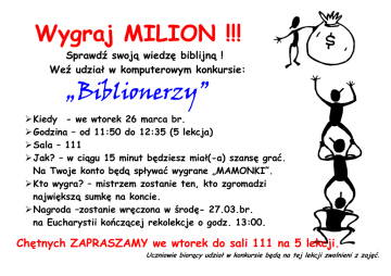 Wygraj MILION !!! Sprawdź swoją wiedzę biblijną ! Weź udział w komputerowym konkursie: „Biblionerzy” Kiedy - we wtorek 26 marca br. Godzina – od 11:50 do 12:35 (5 lekcja) Sala – 111 Jak? – w ciągu 15 minut będziesz miał(-a) szansę grać. Na Twoje konto będą spływać wygrane „MAMONKI”. Kto wygra? – mistrzem zostanie ten, kto zgromadzi największą sumkę na koncie. Nagroda –zostanie wręczona w środę- 27.03.br. na Eucharystii kończącej rekolekcje o godz. 13:00. Chętnych ZAPRASZAMY we wtorek do sali 111 na 5 lekcji. Uczniowie biorący udział w konkursie będą na tej lekcji zwolnieni z zajęć.
