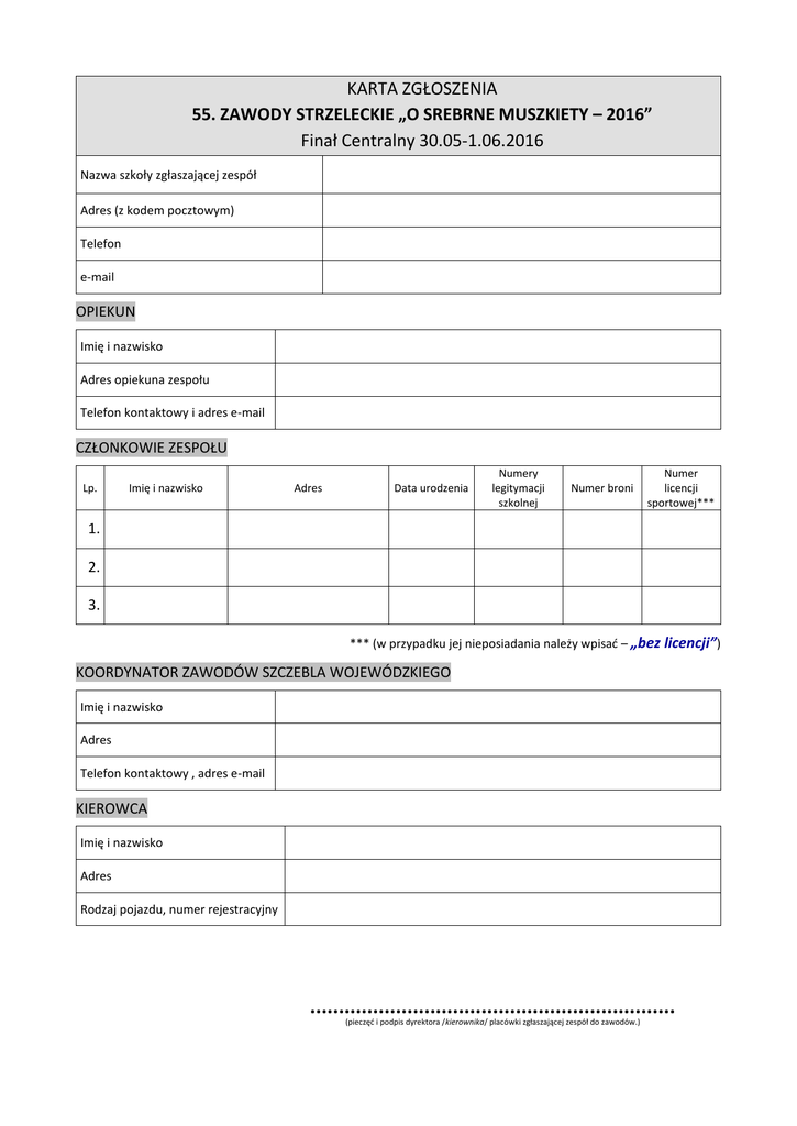KARTA ZGŁOSZENIA 55. ZAWODY STRZELECKIE „O SREBRNE MUSZKIETY – 2016” Finał Centralny 30.05-1.06.2016 Nazwa szkoły zgłaszającej zespół Adres (z kodem pocztowym) Telefon e-mail OPIEKUN Imię i nazwisko Adres opiekuna zespołu Telefon kontaktowy i adres e-mail CZŁONKOWIE ZESPOŁU Lp. Imię i nazwisko Adres Data urodzenia Numery legitymacji szkolnej Numer broni Numer licencji sportowej*** 1. 2. 3. *** (w przypadku jej nieposiadania należy wpisać – „bez licencji”) KOORDYNATOR ZAWODÓW SZCZEBLA WOJEWÓDZKIEGO Imię i nazwisko Adres Telefon kontaktowy , adres e-mail KIEROWCA Imię i nazwisko Adres Rodzaj pojazdu, numer rejestracyjny ................................................................ (pieczęć i podpis dyrektora /kierownika/ placówki zgłaszającej zespół do zawodów.)