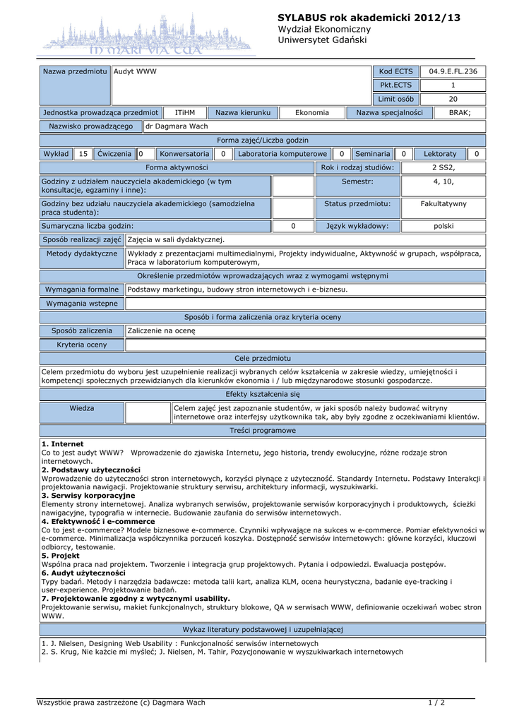 SYLABUS rok akademicki 2012/13 Wydział Ekonomiczny Uniwersytet Gdański Nazwa przedmiotu Audyt WWW Jednostka prowadząca przedmiot Nazwisko prowadzącego ITiHM Nazwa kierunku Ekonomia Kod ECTS 04.9.E.FL.236 Pkt.ECTS 1 Limit osób 20 Nazwa specjalności BRAK; dr Dagmara Wach Forma zajęć/Liczba godzin Wykład 15 Ćwiczenia 0 Konwersatoria 0 Laboratoria komputerowe Forma aktywności 0 Sumaryczna liczba godzin: 0 0 Lektoraty Rok i rodzaj studiów: 2 SS2, Semestr: 4, 10, Status przedmiotu: Fakultatywny Język wykładowy: polski Godziny z udziałem nauczyciela akademickiego (w tym konsultacje, egzaminy i inne): Godziny bez udziału nauczyciela akademickiego (samodzielna praca studenta): Seminaria 0 Sposób realizacji zajęć Zajęcia w sali dydaktycznej. Metody dydaktyczne Wykłady z prezentacjami multimedialnymi, Projekty indywidualne, Aktywność w grupach, współpraca, Praca w laboratorium komputerowym, Określenie przedmiotów wprowadzających wraz z wymogami wstępnymi Wymagania formalne Podstawy marketingu, budowy stron internetowych i e-biznesu. Wymagania wstepne Sposób i forma zaliczenia oraz kryteria oceny Sposób zaliczenia Zaliczenie na ocenę Kryteria oceny Cele przedmiotu Celem przedmiotu do wyboru jest uzupełnienie realizacji wybranych celów kształcenia w zakresie wiedzy, umiejętności i kompetencji społecznych przewidzianych dla kierunków ekonomia i / lub międzynarodowe stosunki gospodarcze. Efekty kształcenia się Wiedza Celem zajęć jest zapoznanie studentów, w jaki sposób należy budować witryny internetowe oraz interfejsy użytkownika tak, aby były zgodne z oczekiwaniami klientów. Treści programowe 1. Internet Co to jest audyt WWW? Wprowadzenie do zjawiska Internetu, jego historia, trendy ewolucyjne, różne rodzaje stron internetowych. 2. Podstawy użyteczności Wprowadzenie do użyteczności stron internetowych, korzyści płynące z użyteczność. Standardy Internetu. Podstawy Interakcji i projektowania nawigacji. Projektowanie struktury serwisu, architektury informacji, wyszukiwarki. 3. Serwisy korporacyjne Elementy strony internetowej. Analiza wybranych serwisów, projektowanie serwisów korporacyjnych i produktowych, ścieżki nawigacyjne, typografia w internecie. Budowanie zaufania do serwisów internetowych. 4. Efektywność i e-commerce Co to jest e-commerce? Modele biznesowe e-commerce. Czynniki wpływające na sukces w e-commerce. Pomiar efektywności w e-commerce. Minimalizacja współczynnika porzuceń koszyka. Dostępność serwisów internetowych: główne korzyści, kluczowi odbiorcy, testowanie. 5. Projekt Wspólna praca nad projektem. Tworzenie i integracja grup projektowych. Pytania i odpowiedzi. Ewaluacja postępów. 6. Audyt użyteczności Typy badań. Metody i narzędzia badawcze: metoda talii kart, analiza KLM, ocena heurystyczna, badanie eye-tracking i user-experience. Projektowanie badań. 7. Projektowanie zgodny z wytycznymi usability. Projektowanie serwisu, makiet funkcjonalnych, struktury blokowe, QA w serwisach WWW, definiowanie oczekiwań wobec stron WWW. Wykaz literatury podstawowej i uzupełniającej 1. J. Nielsen, Designing Web Usability : Funkcjonalność serwisów internetowych 2. S. Krug, Nie każcie mi myśleć; J. Nielsen, M. Tahir, Pozycjonowanie w wyszukiwarkach internetowych Wszystkie prawa zastrzeżone (c) Dagmara Wach 1/2 SYLABUS rok akademicki 2012/13 Wydział Ekonomiczny Uniwersytet Gdański 3. Janmedia Interactive, Raport z badania funkcjonalności polskich sklepów inernetowych 4. Tomasz Krawatka, Kurs usability (http://www.kursusability.pl) Kontakt [email protected], Wszystkie prawa zastrzeżone (c) Dagmara Wach 2/2
