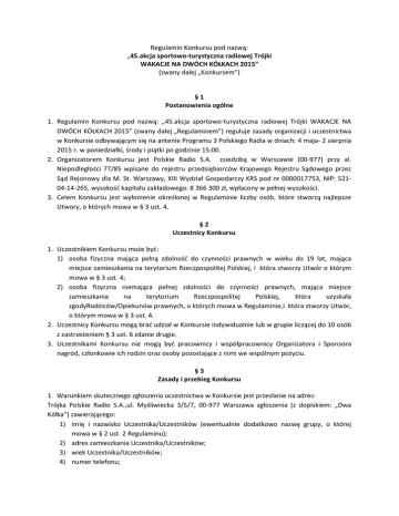 Regulamin Konkursu pod nazwą: „45.akcja sportowo-turystyczna radiowej Trójki WAKACJE NA DWÓCH KÓŁKACH 2015” (zwany dalej „Konkursem”) §1 Postanowienia ogólne 1. Regulamin Konkursu pod nazwą: „45.akcja sportowo-turystyczna radiowej Trójki WAKACJE NA DWÓCH KÓŁKACH 2015” (zwany dalej „Regulaminem”) reguluje zasady organizacji i uczestnictwa w Konkursie odbywającym się na antenie Programu 3 Polskiego Radia w dniach: 4 maja- 2 sierpnia 2015 r. w poniedziałki, środy i piątki po godzinie 15:00. 2. Organizatorem Konkursu jest Polskie Radio S.A. zsiedzibą w Warszawie (00-977) przy al. Niepodległości 77/85 wpisane do rejestru przedsiębiorców Krajowego Rejestru Sądowego przez Sąd Rejonowy dla M. St. Warszawy, XIII Wydział Gospodarczy KRS pod nr 0000017753, NIP: 52104-14-265, wysokość kapitału zakładowego: 8 366 300 zł, wpłacony w pełnej wysokości. 3. Celem Konkursu jest wyłonienie określonej w Regulaminie liczby osób, które stworzą najlepsze Utwory, o których mowa w § 3 ust. 4. §2 Uczestnicy Konkursu 1. Uczestnikiem Konkursu może być: 1) osoba fizyczna mająca pełną zdolność do czynności prawnych w wieku do 19 lat, mająca miejsce zamieszkania na terytorium Rzeczpospolitej Polskiej, i która stworzy Utwór o którym mowa w § 3 ust. 4; 2) osoba fizyczna niemająca pełnej zdolności do czynności prawnych, mająca miejsce zamieszkania na terytorium Rzeczpospolitej Polskiej, która uzyskała zgodyRodziców/Opiekunów prawnych, o których mowa w Regulaminie,i która stworzy Utwór, o którym mowa w § 3 ust. 4. 2. Uczestnicy Konkursu mogą brać udział w Konkursie indywidualnie lub w grupie liczącej do 10 osób z zastrzeżeniem § 3 ust. 6 zdanie drugie. 3. Uczestnikami Konkursu nie mogą być pracownicy i współpracownicy Organizatora i Sponsora nagród, członkowie ich rodzin oraz osoby pozostające z nimi we wspólnym pożyciu. §3 Zasady i przebieg Konkursu 1. Warunkiem skutecznego zgłoszenia uczestnictwa w Konkursie jest przesłanie na adres: Trójka Polskie Radio S.A.,ul. Myśliwiecka 3/5/7, 00-977 Warszawa zgłoszenia (z dopiskiem: „Dwa Kółka”) zawierającego: 1) imię i nazwisko Uczestnika/Uczestników (ewentualnie dodatkowo nazwę grupy, o której mowa w § 2 ust. 2 Regulaminu); 2) adres zamieszkania Uczestnika/Uczestników; 3) wiek Uczestnika/Uczestników; 4) numer telefonu; 5) w przypadku Uczestnika, o którym mowa w § 2 ust. 1 pkt 2 Regulaminu podpisany załącznik nr 1 do Regulaminu. 6) Utwór, o którym mowaw § 3 ust. 4. 2. Każdy Uczestnik (w tym grupa, o której mowa w § 2 ust. 2) może zgłosić do Konkursu 1 Utwór. 3. Termin nadsyłania zgłoszeń rozpoczyna się 4 maja 2015 r. i upływa 2 sierpnia 2015 r. Zgłoszenia dostarczone na adres, o którym mowa w ust. 1 po 2 sierpnia 2015 r. nie będą brane pod uwagę w Konkursie. 4. Utworem jest opis z odbytej przez Uczestnika/ów - w okresie od maja do sierpnia 2015 r.wycieczki lub wycieczek rowerowychpo Polsce nadystansie co najmniej 30 km łącznie,zawierającyopis lub mapę trasy, opis wycieczki (wycieczek), najciekawszych krajobrazowo zwiedzonych miejsc, zabytków, śladów kultury ludowej, miejsc pamięci itp. Utwór może mieć dowolną formę (kroniki, albumu ze zdjęciami, rysunkami itp.). 5. Informacje i relacje z przebiegu Konkursu będą podawane na antenie Programu 3 Polskiego Radia od dnia4 maja do dnia11 września w poniedziałki, środy i piątki po godzinie 15:00. 6. Jury wybiera dziesięć najlepszych Utworów. W przypadku Utworu nadesłanego od grupy Uczestników, o której mowa w § 2 ust. 2 Regulaminu, nagrodę wygrywa jeden Uczestnik z tej grupy wybrany przez całą grupę. 7. Zwycięzcy zostaną ogłoszeni na antenie Programu 3 Polskiego Radia najpóźniej do 14 sierpnia 2015 r. 8. W skład Jury wchodzą: Henryk Sytner, Elżbieta Walendzik, Grażyna Orłowska. 9. Jury wyłoni najlepsze Utwory. Dokonując oceny Jury weźmie pod uwagę oryginalność, pomysłowość, wartość artystycznąoraz poprawność gramatyczno-ortograficzną Utworu. 10.Uczestnik Konkursu, Rodzic/Opiekun prawny Uczestnika, o którym mowa w § 2 ust. 1 pkt. 2 wyraża zgodę na publiczne podanie na antenie Programu 3 Polskiego Radia oraz na stronach internetowych Organizatora imienia i nazwiska Uczestnika (ewentualnie dodatkowo nazwę grupy, o której mowa w § 2 ust. 2 Regulaminu) oraz miejsce zamieszkania Uczestnika. §4 Nagrody i podatek od wygranej 1. Każdy z dziesięciorga Zwycięzców otrzyma nagrodę, w której skład wchodzi: 1) czternastodniowy pobyt w Hiszpanii (Costa Blanca) w dniach 26.08 - 09.09.2015 roku. Każdy pobyt zawiera: przelot na trasie Warszawa - Alicante - Warszawa, obowiązkową opłatę lotniskową (300 zł) i dopłatę transferową (190 zł), transfery lotnisko – hotel-lotnisko komfortowym autokarem, transport lotniczy rowerów, transport lotniczy 50 kg nadbagażu (części rowerowe, leki), transfer rowerów na trasie lotnisko – hotel - lotnisko, zakwaterowanie: 14 noclegów w ***hotelu Magic Aqua Monica Holidays, 5 x pokój dwuosobowy standard i 2 x pokój jednoosobowy, świadczenia all inclusive, opiekę wykwalifikowanego pilota z ramienia BP Itaka , sześć wycieczek lokalnych (opis wycieczek w załączniku 4 do umowy), ubezpieczenie KL i NW Itaka Simple –15.000€/osoba, warunki rezerwacji grupowych. Wartość jednostkowa pobytu wynosi 6275 zł brutto (słownie: sześć tysięcy dwieście siedemdziesiąt pięć). 2) kask szosowy UVEX Race New, wartość jednostkowa wynosi 374,95 (słownie: trzysta siedemdziesiąt cztery i 95/100) zł brutto. 3) okulary rowerowe UVEX SGL RACE VARIO PRO, wartość jednostkowa wynosi 339,95 (słownie: trzysta trzydzieści dziewięć i 95/100) PLN brutto. 4) dwa komplety odzieży kolarskiej (koszulka i spodenki) o łącznej wartości 150,00 (słownie: sto pięćdziesiąt) złotych brutto. oraz 5) pobyt w INTERFERIE Sport Hotel Bornit w Szklarskiej Porębie w dniach od 13 do 24 sierpnia 2015r. Pobyt obe