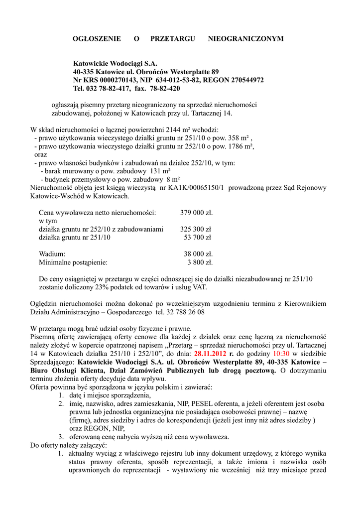 OGŁOSZENIE O PRZETARGU NIEOGRANICZONYM Katowickie Wodociągi S.A. 40-335 Katowice ul. Obrońców Westerplatte 89 Nr KRS 0000270143, NIP 634-012-53-82, REGON 270544972 Tel. 032 78-82-417, fax. 78-82-420 ogłaszają pisemny przetarg nieograniczony na sprzedaż nieruchomości zabudowanej, położonej w Katowicach przy ul. Tartacznej 14. W skład nieruchomości o łącznej powierzchni 2144 m² wchodzi: - prawo użytkowania wieczystego działki gruntu nr 251/10 o pow. 358 m² , - prawo użytkowania wieczystego działki gruntu nr 252/10 o pow. 1786 m², oraz - prawo własności budynków i zabudowań na działce 252/10, w tym: - barak murowany o pow. zabudowy 131 m² - budynek przemysłowy o pow. zabudowy 8 m² Nieruchomość objęta jest księgą wieczystą nr KA1K/00065150/1 prowadzoną przez Sąd Rejonowy Katowice-Wschód w Katowicach. Cena wywoławcza netto nieruchomości: w tym działka gruntu nr 252/10 z zabudowaniami działka gruntu nr 251/10 Wadium: Minimalne postąpienie: 379 000 zł. 325 300 zł 53 700 zł 38 000 zł. 3 800 zł. Do ceny osiągniętej w przetargu w części odnoszącej się do działki niezabudowanej nr 251/10 zostanie doliczony 23% podatek od towarów i usług VAT. Oględzin nieruchomości można dokonać po wcześniejszym uzgodnieniu terminu z Kierownikiem Działu Administracyjno – Gospodarczego tel. 32 788 26 08 W przetargu mogą brać udział osoby fizyczne i prawne. Pisemną ofertę zawierającą oferty cenowe dla każdej z działek oraz cenę łączną za nieruchomość należy złożyć w kopercie opatrzonej napisem „Przetarg – sprzedaż nieruchomości przy ul. Tartacznej 14 w Katowicach działka 251/10 i 252/10”, do dnia: 28.11.2012 r. do godziny 10:30 w siedzibie Sprzedającego: Katowickie Wodociągi S.A. ul. Obrońców Westerplatte 89, 40-335 Katowice – Biuro Obsługi Klienta, Dział Zamówień Publicznych lub drogą pocztową. O dotrzymaniu terminu złożenia oferty decyduje data wpływu. Oferta powinna być sporządzona w języku polskim i zawierać: 1. datę i miejsce sporządzenia, 2. imię, nazwisko, adres zamieszkania, NIP, PESEL oferenta, a jeżeli oferentem jest osoba prawna lub jednostka organizacyjna nie posiadająca osobowości prawnej – nazwę (firmę), adres siedziby i adres do korespondencji (jeżeli jest inny niż adres siedziby ) oraz REGON, NIP, 3. oferowaną cenę nabycia wyższą niż cena wywoławcza. Do oferty należy załączyć: 1. aktualny wyciąg z właściwego rejestru lub inny dokument urzędowy, z którego wynika status prawny oferenta, sposób reprezentacji, a także imiona i nazwiska osób uprawnionych do reprezentacji - wystawiony nie wcześniej niż trzy miesiące przed 2. 3. 4. 5. 6. 7. upływem terminu składania ofert (dot. przedsiębiorców), przy spółkach z ograniczona odpowiedzialnością udokumentowanie spełnienia wymogów Art. 228, a w przypadku spółek akcyjnych udokumentowanie spełnienia wymogów Art. 393 kodeksu spółek handlowych, kopię przelewu lub potwierdzenie wpłaty w kasie sprzedającego, wskazanie nr rachunku, na który należy zwrócić wadium w przypadku nie przyjęcia oferty, oświadczenie oferenta o tym, że zapoznał się z treścią ogłoszenia prasowego, przedmiotem i warunkami przetargu i przyjmuje je bez zastrzeżeń, oświadczenie oferenta, że zapoznał się z regulaminem sposobu i trybu organizowania przetargu na sprzedaż składników majątkowych przez Katowickie Wodociągi S.A., który jest dostępny na stronie internetowej Katowickich Wodociągów S.A. http://www.wodociagi.katowice.pl w dziale aktualności, oświadczenie oferenta, że zapoznał się z przedmiotem przetargu, jego stanem prawnym i nie wnosi do nich zastrzeżeń. Komisyjne otwarcie ofert nastąpi w siedzibie Katowickich Wodociągów S.A. w Katowicach ul. Obrońców Westerplatte 89, I piętro sala konferencyjna w dniu 28.11.2012 r. o godzinie 12:15. W razie stwierdzenia, iż kilku oferentów zaproponowało tę sama cenę, sprzedający przeprowadzi dodatkowy przetarg ustny w terminie przez siebie wskazanym. Wadium w formie pieniężnej należy wpłacić na konto bankowe Katowickich Wodociągów S.A.: ING Bank Śląski S.A. O/Regionalny Katowice nr 95 1050 1214 1000 0007 0005 3994 lub w kasie Sprzedającego do dnia 27.11.2012 r., z zaznaczeniem „Przetarg nieograniczony - działka 251/10 i 252/10 Tartaczna”. Za zachowanie terminu wpłaty wadium uważa się datę wpływu środków pieniężnych na rachunek Spółki. Sprzedający odrzuci ofertę złożoną przez uczestnika przetargu, który nie wniósł wadium lub wniósł je w niewłaściwej kwocie lub innej niż wskazana przez sprzedającego formie. Wpłacone wadium: - podlega zaliczeniu na poczet ceny nabycia nieruchomości zaoferowanej przez oferenta, który wygra przetarg, - przepada na rzecz sprzedającego, jeśli oferent, który wygra przetarg nie uiści ceny nabycia lub uchyli się od zawarcia umowy notarialnej, - wpłacone przez pozostałych oferentów zostanie zwrócone 14 dni po ostatecznym rozstrzygnięciu przetargu. Oferent, którego oferta zostanie przyjęta jest zobowiązany do dokonania wpłaty pełnej ceny (pomniejszonej o wpłacone wadium) wynikającej z przetargu, przed zawarciem notarialnej umowy sprzedaży nieruchomości ze skutkiem rozporządzającym. Wszelkie koszty związane z zawarciem umowy ponosi nabywca nieruchomości. Spółka zastrzega sobie prawo odstąpienia od przeprowadzenia przetargu lub unieważnienia przetargu dotyczącego zbycia przedmiotu sprzedaży bez podania przyczyny i ponoszenia jakichkolwiek skutków prawnych i finansowych.