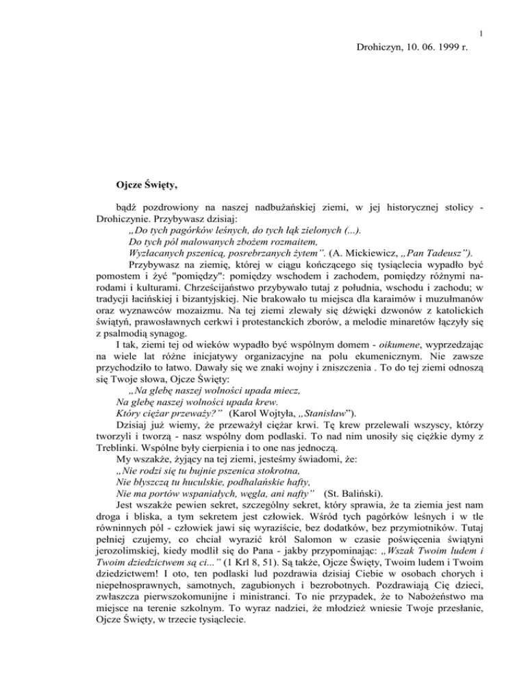 1 Drohiczyn, 10. 06. 1999 r. Ojcze Święty, bądź pozdrowiony na naszej nadbuŜańskiej ziemi, w jej historycznej stolicy Drohiczynie. Przybywasz dzisiaj: „Do tych pagórków leśnych, do tych łąk zielonych (...). Do tych pól malowanych zboŜem rozmaitem, Wyzłacanych pszenicą, posrebrzanych Ŝytem”. (A. Mickiewicz, „Pan Tadeusz”). Przybywasz na ziemię, której w ciągu kończącego się tysiąclecia wypadło być pomostem i Ŝyć "pomiędzy": pomiędzy wschodem i zachodem, pomiędzy róŜnymi narodami i kulturami. Chrześcijaństwo przybywało tutaj z południa, wschodu i zachodu; w tradycji łacińskiej i bizantyjskiej. Nie brakowało tu miejsca dla karaimów i muzułmanów oraz wyznawców mozaizmu. Na tej ziemi zlewały się dźwięki dzwonów z katolickich świątyń, prawosławnych cerkwi i protestanckich zborów, a melodie minaretów łączyły się z psalmodią synagog. I tak, ziemi tej od wieków wypadło być wspólnym domem - oikumene, wyprzedzając na wiele lat róŜne inicjatywy organizacyjne na polu ekumenicznym. Nie zawsze przychodziło to łatwo. Dawały się we znaki wojny i zniszczenia . To do tej ziemi odnoszą się Twoje słowa, Ojcze Święty: „Na glebę naszej wolności upada miecz, Na glebę naszej wolności upada krew. Który cięŜar przewaŜy?” (Karol Wojtyła, „Stanisław”). Dzisiaj juŜ wiemy, Ŝe przewaŜył cięŜar krwi. Tę krew przelewali wszyscy, którzy tworzyli i tworzą - nasz wspólny dom podlaski. To nad nim unosiły się cięŜkie dymy z Treblinki. Wspólne były cierpienia i to one nas jednoczą. My wszakŜe, Ŝyjący na tej ziemi, jesteśmy świadomi, Ŝe: „Nie rodzi się tu bujnie pszenica stokrotna, Nie błyszczą tu huculskie, podhalańskie hafty, Nie ma portów wspaniałych, węgla, ani nafty” (St. Baliński). Jest wszakŜe pewien sekret, szczególny sekret, który sprawia, Ŝe ta ziemia jest nam droga i bliska, a tym sekretem jest człowiek. Wśród tych pagórków leśnych i w tle równinnych pól - człowiek jawi się wyraziście, bez dodatków, bez przymiotników. Tutaj pełniej czujemy, co chciał wyrazić król Salomon w czasie poświęcenia świątyni jerozolimskiej, kiedy modlił się do Pana - jakby przypominając: „Wszak Twoim ludem i Twoim dziedzictwem są ci...” (1 Krl 8, 51). Są takŜe, Ojcze Święty, Twoim ludem i Twoim dziedzictwem! I oto, ten podlaski lud pozdrawia dzisiaj Ciebie w osobach chorych i niepełnosprawnych, samotnych, zagubionych i bezrobotnych. Pozdrawiają Cię dzieci, zwłaszcza pierwszokomunijne i ministranci. To nie przypadek, Ŝe to NaboŜeństwo ma miejsce na terenie szkolnym. To wyraz nadziei, Ŝe młodzieŜ wniesie Twoje przesłanie, Ojcze Święty, w trzecie tysiąclecie. 2 Pozdrawia Cię młodzieŜ: nowobierzmowani, ruch oazowy "Światło-śycie", Katolickie Stowarzyszenie MłodzieŜy, harcerki i harcerze. Widzisz przed sobą: nowoŜeńców, rodziców, matki i ojców, Katolickie Stowarzyszenie Rodzin, Domowy Kościół, Rodziny Nazaretańskie, Kółka śywego RóŜańca, Franciszkański Zakon Świeckich, StraŜ Honorową, Legion Maryi, Drogę Neokatechumenalną, Odnowę w Duchu Świętym i Akcję Katolicką. Z pokłonem Cię wita podlaska wieś, często ubiedzona, ale zawsze z godnością słuŜąca swemu powołaniu, stojąca na straŜy tej ziemi, wierna Bogu, Kościołowi i przodkom. Pozdrawiają Cię nasze nieliczne miasta, z niepokojem, ale teŜ i z ufnością patrzące w przyszłość. Z Twojej obecności cieszą się nauczyciele, wychowawcy; słuŜba zdrowia; ludzie róŜnych inicjatyw społecznych i gospodarczych; wojsko i policja oraz straŜ graniczna z naszych niewielkich stanic. Z ufnością witają przedstawiciele władz samorządowych i państwowych; szczebla lokalnego, powiatowego i wojewódzkiego. A Ŝe „do tych pagórków leśnych” dociera Puszcza Białowieska, wyjątkowo serdecznie Następcę św. Piotra pozdrawiają wszystkie słuŜby leśne. Od dziesiątków lat nad bezpieczeństwem ludzi i dóbr materialnych czuwa StraŜ PoŜarna. Nie mogło jej dzisiaj zabraknąć, skoro jest zawsze przy Zmartwychwstaniu Pańskim, chętnie bierze udział w procesji BoŜego Ciała. Przybyła razem ze swymi naczelnymi Władzami. Drohiczyńska StraŜ dziękuje za krzyŜ „Pro Ecclesia et Pontifice”, ofiarowany w stulecie powstania. Niezwykle gorąco witają siostry zakonne i bracia, przełoŜeni, alumni WyŜszego Seminarium Duchownego Drohiczyńskiego, Archidiecezjalnego z Białegostoku i Kapucyńskiego z Lublina, studenci Kolegiów Teologicznych i Uniwersytetów Ludowych, kurie biskupie, parafie, chóry parafialne i rady, wszyscy kapłani całej naszej Metropolii, jej kapituły oraz pasterze Diecezji ŁomŜyńskiej i Archidiecezji Białostockiej z Księdzem Arcybiskupem Metropolitą na czele. To jest nasze dzisiaj. A co otrzymaliśmy od wczoraj? W poszukiwaniu odpowiedzi pomaga nam poezja „Mickiewicz nam tę ziemię odkrył. Potem rzucił, Ale nie mógł Ŝyć bez niej i z powrotem wrócił, I na zawsze tam został... Zbyt cięŜka rozłąka. I teraz po jej ścieŜkach nocami się błąka (S. Baliński). Wśród księŜycowych sosen...” Nasze wczoraj - to ludzie, którzy tu Ŝyli i tworzyli. Są nam bliscy. To na tej ziemi spotykały się pióra ks. bpa Adama Naruszewicza i Juliana Ursyna Niemcewicza. Odczuwamy tu obecność ducha nie tylko Wieszcza, ale teŜ Franciszka Karpińskiego, Cypriana Kamila Norwida, który pisał listy do pobliskiego Korczewa, Marii Rodziewiczówny, Stanisława Moniuszki, Tadeusza Kościuszki, Romualda Traugutta, ks. Krzysztofa Kluka - polskiego Linneusza, ks. gen. Stanisława Brzóski, ks. Ignacego Skorupki. To stąd wyruszył ksiąŜę Jan do Krakowa, aby zostać drugim rektorem Wszechnicy Jagiellońskiej, a ks. Wojciech Szweykowski, aby być pierwszym rektorem Uniwersytetu Warszawskiego oraz ks. Jakub Falkowski, który załoŜył pierwszy na ziemiach polskich Instytut dla Głuchoniemych. Wśród tych, którzy kształtowali podlaską