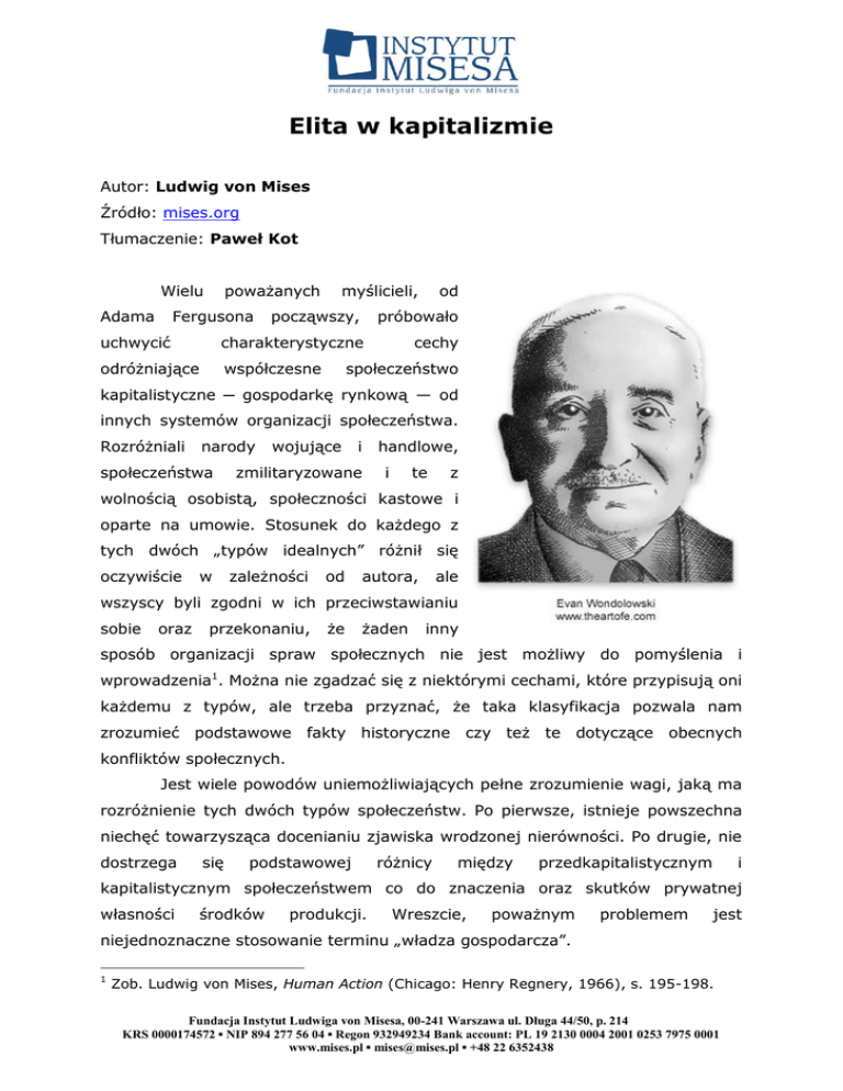 Elita w kapitalizmie Autor: Ludwig von Mises Źródło: mises.org Tłumaczenie: Paweł Kot Wielu Adama poważanych Fergusona myślicieli, od począwszy, próbowało uchwycić charakterystyczne cechy odróżniające współczesne społeczeństwo kapitalistyczne ─ gospodarkę rynkową — od innych systemów organizacji społeczeństwa. Rozróżniali narody społeczeństwa wojujące i zmilitaryzowane handlowe, i te z wolnością osobistą, społeczności kastowe i oparte na umowie. Stosunek do każdego z tych dwóch „typów idealnych” różnił się oczywiście w zależności od autora, ale wszyscy byli zgodni w ich przeciwstawianiu sobie oraz przekonaniu, że żaden inny sposób organizacji spraw społecznych nie jest możliwy do pomyślenia i wprowadzenia1. Można nie zgadzać się z niektórymi cechami, które przypisują oni każdemu z typów, ale trzeba przyznać, że taka klasyfikacja pozwala nam zrozumieć podstawowe fakty historyczne czy też te dotyczące obecnych konfliktów społecznych. Jest wiele powodów uniemożliwiających pełne zrozumienie wagi, jaką ma rozróżnienie tych dwóch typów społeczeństw. Po pierwsze, istnieje powszechna niechęć towarzysząca docenianiu zjawiska wrodzonej nierówności. Po drugie, nie dostrzega się podstawowej różnicy między przedkapitalistycznym i kapitalistycznym społeczeństwem co do znaczenia oraz skutków prywatnej własności środków produkcji. Wreszcie, poważnym problemem jest niejednoznaczne stosowanie terminu „władza gospodarcza”. 1 Zob. Ludwig von Mises, Human Action (Chicago: Henry Regnery, 1966), s. 195-198. Fundacja Instytut Ludwiga von Misesa, 00-241 Warszawa ul. Długa 44/50, p. 214 KRS 0000174572 ▪ NIP 894 277 56 04 ▪ Regon 932949234 Bank account: PL 19 2130 0004 2001 0253 7975 0001 www.mises.pl ▪ [email protected] ▪ +48 22 6352438 Wrodzona nierówność Doktryna przypisująca wszystkie różnice między osobami wpływom środowiska jest nie do utrzymania. Fakt, iż istoty ludzkie rodzą się nierówne pod względem fizycznym i umysłowym, nie może być zaprzeczony przez żadnego rozsądnego człowieka, w tym nie przez pediatrów. Niektórzy ludzie przewyższają swoich bliźnich zdrowiem i witalnością, siłą i pojętnością umysłu, energią i umiejętnością podejmowania decyzji. Niektórzy są lepiej przysposobieni do ziemskich spraw, a inni mniej. Z tego punktu widzenia możemy ─ nie pozwalając sobie na sądy wartościujące ─ rozróżnić lepszych i gorszych ludzi. Karol Marks pisał o „nierównościach w uzdolnieniach jednostek,a przez to w zdolności produkcyjnej (Leistungsfähigkeit), jako naturalnych przywilejach” i był w pełni świadomy, że ludzie: „nie byliby indywidualnymi jednostkami, gdyby nie różnili się w uzdolnieniach”2. W czasach przedkapitalistycznych „lepsi” ludzie korzystali ze swojego uprzywilejowania, przejmując władzę nad masami słabszych, „gorszych”. Zwycięscy wojownicy pozyskiwali dla siebie wszystkie ziemie zdatne do polowań i połowów, hodowli i upraw. Reszcie ludzi pozostawało tylko służyć książętom i ich świtom. Byli sługami i niewolnikami, podwładnymi bez ziemi i pieniędzy. Taki był, ogólnie rzecz biorąc, stan rzeczy w większej części świata, gdy rządzili „bohaterowie”3, a „komercjalizm” nie istniał. Z drugiej strony, w procesie, który chociaż przerywany nawrotami przemocy, trwał przez wieki, duch przedsiębiorczości ─ tzn. pokojowej współpracy bazującej na podziale pracy ─ podważył mentalność „starych dobrych czasów”. Kapitalizm — gospodarka rynkowa — radykalnie przekształcił gospodarczą i polityczną organizację ludzkości. W społeczeństwie przedkapitalistycznym ludzie hojniej obdarowani przez los nie znali innej metody wykorzystywania swojej przewagi poza zniewalaniem mas. Natomiast w kapitalizmie jednostki bardziej zdolne i utalentowane mogą uzyskać korzyści, służąc potrzebom większości mniej utalentowanych ludzi. 2 Karl Marx, Critique of the Social-Democratic Program of Gotha (Letter to Bracke, May 5, 1875). 3 Werner Sombart, Händler und Helden (Hucksters and Heroes) (Munich, 1915). Fundacja Instytut Ludwiga von Misesa, 00-241 Warszawa ul. Długa 44/50, p. 214 KRS 0000174572 ▪ NIP 894 277 56 04 ▪ Regon 932949234 Bank account: PL 19 2130 0004 2001 0253 7975 0001 www.mises.pl ▪ [email protected] ▪ +48 22 6352438 W gospodarce rynkowej rządzą konsumenci. Konsumenci decydują poprzez swoje zakupy lub powstrzymywanie się od zakupów, co powinno być produkowane, przez kogo, jak, jakiej jakości i w jakiej ilości. Przedsiębiorcy, kapitaliści i posiadacze ziemscy, którzy nie potrafią w najlepszy i najtańszy sposób zaspokoić najbardziej naglących z jeszcze niezaspokojonych potrzeb konsumentów, zostają zmuszeni do pożegnania się z biznesem. W biurach i laboratoriach najbłyskotliwsze umysły przekuwają najbardziej skomplikowane rezultaty badań naukowych w produkcję coraz lepszych urządzeń dla ludzi, którzy ani trochę nie interesują się teoriami naukowymi umożliwiającymi ich wytwarzanie. Im większe przedsiębiorstwo, tym bardziej jest zmuszone do dostosowywania się względem zmieniających się mód i kaprysów mas — jego panów. Naczelną zasadą kapitalizmu jest masowa produkcja dla mas. Zwykły człowiek jest najważniejszy w gospodarce rynkowej. Jest klientem, „który ma zawsze rację”. W sferze politycznej władza przedstawicielska jest następstwem supremacji konsumentów na rynku. Osoby zajmujące stanowiska publiczne zależą od głosujących w podobny sposób, jak przedsiębiorcy i inwestorzy zależą od konsumentów. Ten sam proces historyczny, który wprowadził system kapitalistyczny na miejsce przedkapitalistycznego, wprowadził także system rządów powszechnych — demokrację — w miejsce absolutyzmu królewskiego i innych form „rządów niewielu”. Gdziekolwiek tylko gospodarkę rynkową zastąpił socj