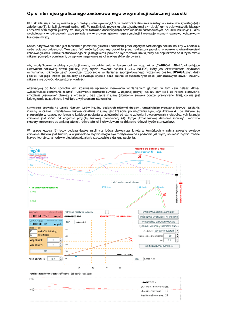 Opis interfejsu graficznego zastosowanego w symulacji sztucznej trzustki GUI składa się z pól wyświetlających bieżący stan symulacji(1,2,3), zależności działania insuliny w czasie rzeczywistego(4) i założonego(5), funkcji glukoza(insulina) (6). Po naciśnięciu przycisku „startuj/zatrzymaj symulację” górne pole wyświetla bieżący i przeszły stan stężeń glukozy we krwi(2), w tkankach docelowych(3) oraz wielkość zastosowanych bolusów insuliny(1). Czas wyskalowany w jednostkach czas pojawia się w prawym górnym rogu symulacji i wskazuje moment czasowy wskazywany kursorem myszy. Każde odrysowanie okna jest tożsame z pomiarem glikemii i podaniem przez algorytm wirtualnego bolusa insuliny w oparciu o wyżej opisane zależności. Ten czas (∆t) może być dobrany dowolnie przez realizatora projektu w oparciu o charakterystyki czasowe glikemii i rodzaj zastosowanego czujnika glikemii, powinien być możliwie krótki, żeby nie dopuszczać do dużych różnic glikemii pomiędzy pomiarami, co wpłynie negatywnie na charakterystykę sterowania. Aby modyfikować przebieg symulacji należy wypełnić pola w lewym dolnym rogu okna „CARBOH. MEAL”, określające ekwiwalent całkowitej dawki glukozy, jaką będzie zawierał posiłek i „GLC INDEX”, który jest ekwiwalentem szybkości wchłaniania. Kliknięcie „eat” powoduje rozpoczęcie wchłaniania zaprojektowanego wcześniej posiłku. UWAGA Zbyt duży posiłek, lub jego indeks glikemiczny spowoduje wyjście poza zakres dopuszczalnych ilości jednorazowych dawek insuliny, glikemia nie powróci do założonej wartości. Alternatywą do tego sposobu jest stosowanie ręcznego sterowania wchłanianiem glukozy. W tym celu należy kliknąć „wlacz/wylacz sterowanie ręczne” i ustawienie czarnego suwaka w żądanej pozycji. Należy pamiętać, że ręczne sterowanie umożliwia „usuwanie” glukozy z organizmu beż użycia insuliny (obniżenie suwaka poniżej przerywanej linii), co nie jest fizjologicznie uzasadnione i koliduje z wyliczeniami sterownika. Symulacja pozwala na użycie różnych typów insuliny podanych różnymi drogami, umożliwiając rysowanie krzywej działania insuliny w czasie. Przykładowa krzywa działania insuliny jest kreślona po włączeniu symulacji (krzywa 4 i 5). Krzywe są przesunięte w czasie, ponieważ u każdego pacjenta w zależności od stanu zdrowia i uwarunkowań metabolicznych latencja działania jest różna od odgórnie przyjętej krzywej teoretycznej (4). Opcja „kreśl krzywą działania insuliny” umożliwia eksperymentowanie ze zmianą latencji, różnic latencji i ich wpływem na działanie różnych typów sterowników. W reszcie krzywa (6) łączy podaną dawkę insuliny z ilością glukozy zamkniętą w komórkach w całym zakresie swojego działania. Krzywa jest liniowa, a w przyszłości będzie mogła być modyfikowalna i podobnie jak wyżej nakreślić będzie można krzywą teoretyczną i odzwierciedlającą działanie rzeczywiste u danego pacjenta.