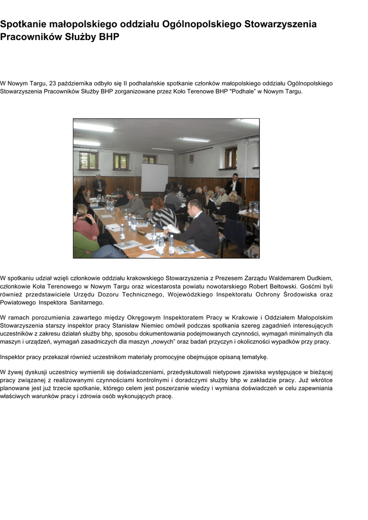 Spotkanie małopolskiego oddziału Ogólnopolskiego Stowarzyszenia Pracowników Służby BHP W Nowym Targu, 23 października odbyło się II podhalańskie spotkanie członków małopolskiego oddziału Ogólnopolskiego Stowarzyszenia Pracowników Służby BHP zorganizowane przez Koło Terenowe BHP "Podhale” w Nowym Targu. W spotkaniu udział wzięli członkowie oddziału krakowskiego Stowarzyszenia z Prezesem Zarządu Waldemarem Dudkiem, członkowie Koła Terenowego w Nowym Targu oraz wicestarosta powiatu nowotarskiego Robert Bełtowski. Gośćmi byli również przedstawiciele Urzędu Dozoru Technicznego, Wojewódzkiego Inspektoratu Ochrony Środowiska oraz Powiatowego Inspektora Sanitarnego. W ramach porozumienia zawartego między Okręgowym Inspektoratem Pracy w Krakowie i Oddziałem Małopolskim Stowarzyszenia starszy inspektor pracy Stanisław Niemiec omówił podczas spotkania szereg zagadnień interesujących uczestników z zakresu działań służby bhp, sposobu dokumentowania podejmowanych czynności, wymagań minimalnych dla maszyn i urządzeń, wymagań zasadniczych dla maszyn „nowych” oraz badań przyczyn i okoliczności wypadków przy pracy. Inspektor pracy przekazał również uczestnikom materiały promocyjne obejmujące opisaną tematykę. W żywej dyskusji uczestnicy wymienili się doświadczeniami, przedyskutowali nietypowe zjawiska występujące w bieżącej pracy związanej z realizowanymi czynnościami kontrolnymi i doradczymi służby bhp w zakładzie pracy. Już wkrótce planowane jest już trzecie spotkanie, którego celem jest poszerzanie wiedzy i wymiana doświadczeń w celu zapewniania właściwych warunków pracy i zdrowia osób wykonujących pracę.