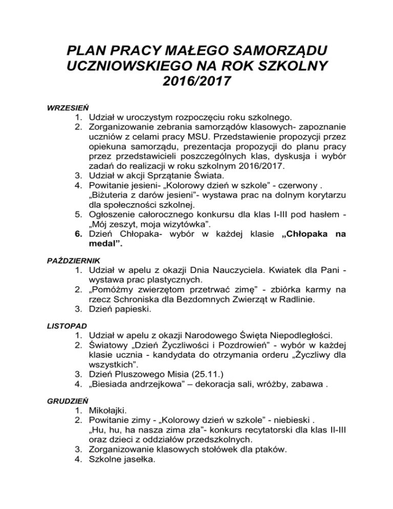 PLAN PRACY MAŁEGO SAMORZĄDU UCZNIOWSKIEGO NA ROK SZKOLNY 2016/2017 WRZESIEŃ 1. Udział w uroczystym rozpoczęciu roku szkolnego. 2. Zorganizowanie zebrania samorządów klasowych- zapoznanie uczniów z celami pracy MSU. Przedstawienie propozycji przez opiekuna samorządu, prezentacja propozycji do planu pracy przez przedstawicieli poszczególnych klas, dyskusja i wybór zadań do realizacji w roku szkolnym 2016/2017. 3. Udział w akcji Sprzątanie Świata. 4. Powitanie jesieni- „Kolorowy dzień w szkole” - czerwony . „Biżuteria z darów jesieni”- wystawa prac na dolnym korytarzu dla społeczności szkolnej. 5. Ogłoszenie całorocznego konkursu dla klas I-III pod hasłem „Mój zeszyt, moja wizytówka”. 6. Dzień Chłopaka- wybór w każdej klasie „Chłopaka na medal”. PAŹDZIERNIK 1. Udział w apelu z okazji Dnia Nauczyciela. Kwiatek dla Pani wystawa prac plastycznych. 2. „Pomóżmy zwierzętom przetrwać zimę” - zbiórka karmy na rzecz Schroniska dla Bezdomnych Zwierząt w Radlinie. 3. Dzień papieski. LISTOPAD 1. Udział w apelu z okazji Narodowego Święta Niepodległości. 2. Światowy „Dzień Życzliwości i Pozdrowień” - wybór w każdej klasie ucznia - kandydata do otrzymania orderu „Życzliwy dla wszystkich”. 3. Dzień Pluszowego Misia (25.11.) 4. „Biesiada andrzejkowa” – dekoracja sali, wróżby, zabawa . GRUDZIEŃ 1. Mikołajki. 2. Powitanie zimy - „Kolorowy dzień w szkole” - niebieski . „Hu, hu, ha nasza zima zła”- konkurs recytatorski dla klas II-III oraz dzieci z oddziałów przedszkolnych. 3. Zorganizowanie klasowych stołówek dla ptaków. 4. Szkolne jasełka. 5. Odwiedziny gwiazdora. 6. Klasowe spotkanie przy opłatku. 7. Udział w projekcie edukacyjnym pt. „I TY TEŻ MOŻESZ ZOSTAĆ ŚWIĘTYM MIKOŁAJEM’’. 8. Zabawy choinkowe. STYCZEŃ 1. Spotkanie z babciami i dziadkami z okazji Dnia Babci i Dziadka - oddziały przedszkolne. 2. Przygotowanie upominków dla naszych kochanych babć i dziadków - uczniowie edukacji wczesnoszkolnej. 3. Przeprowadzenie akcji „Bezpieczne ferie”. LUTY 1. „Walentynkowe niespodzianki”. 2. „I TY MOŻESZ ZOSTAĆ MISTRZEM ORTOGRAFII”- klasowy konkurs ortograficzny dla klas II-III. MARZEC 1. „Kolorowy dzień w szkole” - zielony. Powitanie wiosny na sportowo- rozgrywki międzyklasowe. 2. Dzień Kobiet- wybór w każdej klasie „Dziewczyny na medal”. KWIECIEŃ 1. Dzień Czekolady - „Szukanie odpowiedzi na pytanie, czy czekolada jest zdrowa?” 2. Spotkanie z „wielkanocnym zajączkiem” 3. Udział w Dniu Samorządności. 4. Udział w akcji „Dzień Ziemi”. 5. Udział w akcji „Miesiąc Kultury Zdrowotnej”. 6. Dzień Książki - „Książki w domu mamy, do czytania zachęcamy” - prezentacja w klasach swojej ulubionej książki. MAJ 1. Udział w apelu z okazji „Święta 3-Maja”. 2. Przygotowanie upominków dla mam z okazji Dnia Matki. CZERWIEC 1. Dzień Patrona. 2. Dzień Dziecka. 3. Powitanie lata - „Kolorowy dzień w szkole”- żółty. Wspólna dyskoteka. 4. Przygotowanie upominków na Dzień Ojca. 5. Przeprowadzenie akcji „Bezpieczne wakacje”. 6. Udział w uroczystym zakończeniu roku szkolnego. Opiekun MSU A. Tomaszewska