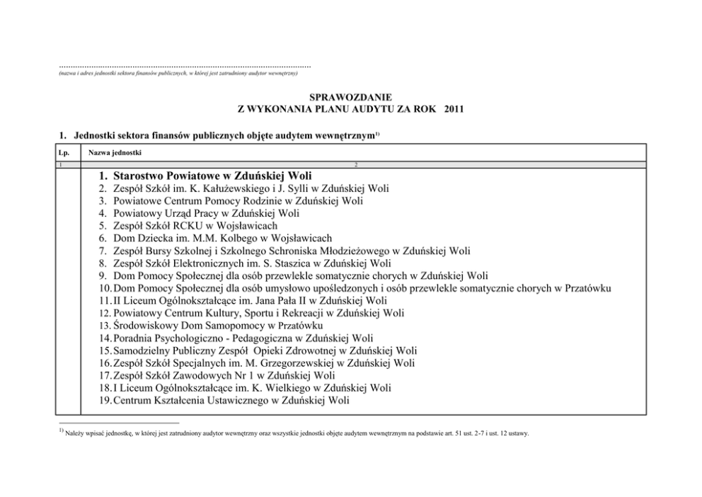 .............................................................................................................. (nazwa i adres jednostki sektora finansów publicznych, w której jest zatrudniony audytor wewnętrzny) SPRAWOZDANIE Z WYKONANIA PLANU AUDYTU ZA ROK 2011 1. Jednostki sektora finansów publicznych objęte audytem wewnętrznym1) Lp. Nazwa jednostki 1 2 1. Starostwo Powiatowe w Zduńskiej Woli 2. Zespół Szkół im. K. Kałużewskiego i J. Sylli w Zduńskiej Woli 3. Powiatowe Centrum Pomocy Rodzinie w Zduńskiej Woli 4. Powiatowy Urząd Pracy w Zduńskiej Woli 5. Zespół Szkół RCKU w Wojsławicach 6. Dom Dziecka im. M.M. Kolbego w Wojsławicach 7. Zespół Bursy Szkolnej i Szkolnego Schroniska Młodzieżowego w Zduńskiej Woli 8. Zespół Szkół Elektronicznych im. S. Staszica w Zduńskiej Woli 9. Dom Pomocy Społecznej dla osób przewlekle somatycznie chorych w Zduńskiej Woli 10. Dom Pomocy Społecznej dla osób umysłowo upośledzonych i osób przewlekle somatycznie chorych w Przatówku 11. II Liceum Ogólnokształcące im. Jana Pała II w Zduńskiej Woli 12. Powiatowy Centrum Kultury, Sportu i Rekreacji w Zduńskiej Woli 13. Środowiskowy Dom Samopomocy w Przatówku 14. Poradnia Psychologiczno - Pedagogiczna w Zduńskiej Woli 15. Samodzielny Publiczny Zespół Opieki Zdrowotnej w Zduńskiej Woli 16. Zespół Szkół Specjalnych im. M. Grzegorzewskiej w Zduńskiej Woli 17. Zespół Szkół Zawodowych Nr 1 w Zduńskiej Woli 18. I Liceum Ogólnokształcące im. K. Wielkiego w Zduńskiej Woli 19. Centrum Kształcenia Ustawicznego w Zduńskiej Woli 1) Należy wpisać jednostkę, w której jest zatrudniony audytor wewnętrzny oraz wszystkie jednostki objęte audytem wewnętrznym na podstawie art. 51 ust. 2-7 i ust. 12 ustawy. 2. Podstawowe informacje o komórce audytu wewnętrznego Lp. Imię i nazwisko2) 1 2 Romana 1. Przybylska 2) Nazwa stanowiska Numer telefonu 3 Audytor Wewnętrzny 4 (043) 823 20 79 wew. 26 Adres poczty elektronicznej 5 r.przybylska@powia tzdunskowolski.pl Wymiar czasu pracy (w etatach) Kwalifikacje zawodowe3) 6 1 etat 7 Egzamin MF Nr 1948/2006 1 2 Czy w roku sprawozdawczym dokonywano udokumentowanej samooceny audytu wewnętrznego? TAK Udział w szkoleniach w roku sprawozdawczym (w dniach) 8 4 dni Należy wpisać dane wszystkich osób zatrudnionych w komórce audytu wewnętrznego, według stanu na 31 grudnia roku sprawozdawczego. Kwalifikacje zawodowe, o których mowa w art. 58 pkt 5 ustawy z dnia 30 czerwca 2005 r. o finansach publicznych oraz art. 23 ustawy z dnia 8 grudnia 2006 r. o zmianie ustawy o finansach publicznych oraz niektórych innych ustaw (Dz. U. Nr 249, poz. 1832). Należy wpisać odpowiednio: CIA, CGAP, CISA, ACCA, CFE, CCSA, CFSA, CFA, aplikacja NIK, inspektor kontroli skarbowej, biegły rewident, egzamin MF. W przypadku braku ww. kwalifikacji zawodowych należy wpisać „–”. 4) Niepotrzebne skreślić. 3) 3. Przeprowadzone zadania audytowe w roku sprawozdawczym Lp. 1 5) Temat zadania Zadanie Audyt audytowego5) zapewniaj wewnętrzny ące (Z) zlecony albo czynność doradcza (D) 2 3 4 Typ obszaru działalności, w którym przeprowadzo no zadanie audytowe 5 Obszar działalnośc i związany z dysponowa niem środkami, o których mowa w art. 5 ust. 3 ustawy Opis obszaru działalności wspomagające j7) 6 7 Liczba audytoró w wewnętrz nych przeprow adzającyc h zadanie audytowe (w etatach) Plan8) 8 Liczba audytorów wewnętrzn ych przeprowa dzających zadanie audytowe (w etatach) Wykonani e 9 Czas przeprowa dzenia zadania audytoweg o Czas przeprow adzenia zadania audytowe go Powoł anie rzeczo znawc y (w (w dniach) dniach) Wykonan Plan8) ie 10 11 12 Należy wpisać wszystkie przeprowadzone zadania zapewniające i czynności doradcze, również te, które nie były ujęte w planie audytu wewnętrznego. Niepotrzebne skreślić. Działalność podstawowa obejmuje działalność merytoryczną, statutową charakterystyczną dla danej jednostki. Działalność wspomagająca obejmuje ogólnie rozumiany proces zarządzania jednostką; zapewnia sprawność i skuteczność działań w obszarze działalności podstaw owej, np. zamówienia publiczne, zarządzanie kadrami. 7) Kolumnę należy wypełnić tylko w przypadku wskazania w kolumnie 5 działalności wspomagającej, wpisując odpowiednio: „Gospodarka finansowa” albo „Zakupy”, albo „Zarządzanie mieniem”, albo „Bezpieczeństwo”, albo „Systemy informatyczne”, albo „Zarządzanie”. 8) W przypadku zadań audytowych, które nie były ujęte w planie audytu wewnętrznego, należy wpisać „-”. 6) 1 2. Nadzór nad zadaniami realizowanymi przez jednostki organizacyjne Powiatu zbadanie procesu przyznawania i realizacji pomocy społecznej dla osób uprawnionych wraz z realizacją rozliczeń finansowych Z Wydatki publiczne na inwestycje , pozyskiwanie i wykorzystywanie środków unijnych na działalność inwestycyjną. Zabezpieczanie bieżących potrzeb inwestycyjnych. Z Audyt Wewnętrz nyzgodnie z Planem AW na rok 2011 Audyt Wewnętrz nyzgodnie z Planem AW na rok 2011 Zarządzanie Zarządzanie jednostkami sektora pomocy społecznej + gospodarka finansowa Zarządzanie TAK + Bezpieczeńs Projekt z udziałem two środków Finansów unijnych Publicznych w ramach Zarządzanie projektami z udziałem środków unijnych Gospodarka finansowa, NIE Plus RPO woj. Łódzkiego 1 1 1 1 30 28 Nie 30 30 NIE 3. 4. Zaległości należności finansowych w jednostkach organizacyjnych powiatu Współpraca w projektowaniu systemu zarządzania ryzykiem D D Audyt wewnątrz. Poza planem AW na rok 2011 Gospodarka Finansowa – zarządzanie Finansami publicznymi Audyt Zarządzanie wewnątrz. ryzykiem Poza planem AW na rok 2011 NIE NIE zarządzanie / nadzór nad jednostkami organizacyjn ymi 1 28 NIE 1 10 NIE 4. Lp. 1 9) Wydane zalecenia lub opinie w ramach przeprowadzonych zadań audytowych Temat zadania zapewniającego lub przedmiot czynności doradczej5) 2 Zadanie Efekty przeprowadzenia zapewniają zadan
