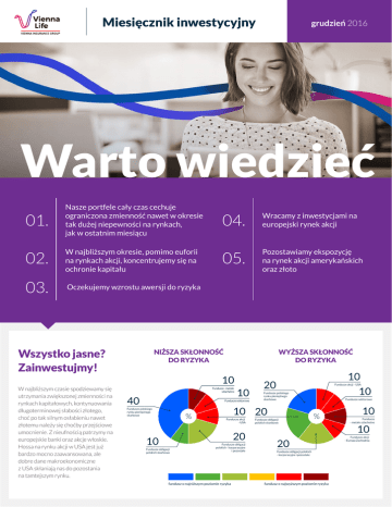 Miesięcznik inwestycyjny grudzień 2016 Warto wiedzieć 01. Nasze portfele cały czas cechuje ograniczona zmienność nawet w okresie tak dużej niepewności na rynkach, jak w ostatnim miesiącu 02. W najbliższym okresie, pomimo euforii na rynkach akcji, koncentrujemy się na ochronie kapitału 03. Oczekujemy wzrostu awersji do ryzyka Wszystko jasne? Zainwestujmy! 04. Wracamy z inwestycjami na europejski rynek akcji 05. Pozostawiamy ekspozycję na rynek akcji amerykańskich oraz złoto NIŻSZA SKŁONNOŚĆ DO RYZYKA WYŻSZA SKŁONNOŚĆ DO RYZYKA 10 W najbliższym czasie spodziewamy się utrzymania zwiększonej zmienności na rynkach kapitałowych, kontynuowania długoterminowej słabości złotego, choć po tak silnym osłabieniu nawet złotemu należy się choćby przejściowe umocnienie. Z nieufnością patrzymy na europejskie banki oraz akcje włoskie. Hossa na rynku akcji w USA jest już bardzo mocno zaawansowana, ale dobre dane makroekonomiczne z USA skłaniają nas do pozostania na tamtejszym rynku. Fundusze - metale szlachetne 40 10 Fundusze sektorowe Fundusze polskiego rynku pieniężnego skarbowe % 10 20 Fundusze obligacji polskich - korporacyjne i pozostałe fundusz o najniższym poziomie ryzyka 10 Fundusze polskiego rynku pieniężnego skarbowe 10 20 Fundusze akcji - USA 20 Fundusze obligacji polskich skarbowe 10 Fundusze akcji - USA Fundusze obligacji polskich skarbowe Fundusze sektorowe % 20 Fundusze obligacji polskich - korporacyjne i pozostałe fundusz o najwyższym poziomie ryzyka 10 Fundusze - metale szlachetne 10 Fundusze akcji - Europa Zachodnia Miesięcznik inwestycyjny grudzień 2016 Barometr rynkowy Komentarz Mocny dolar, mocne USA Michał Janik Doradca Inwestycyjny Vienna Life TU na Życie S.A. Przykładowe portfele Poniższe zestawienia obrazują przykładowy skład portfeli, stworzonych z uwzględnieniem różnego profilu ryzyka inwestora: Stabilną część wspomnianych portfeli oparliśmy głównie o rynek pieniądza oraz fundusze obligacji korporacyjnych, oczekując tutaj słabszego efektu ewentualnego wzrostu rentowności (spadku cen) obligacji, niż w przypadku funduszy obligacji skarbowych. Skok rentowności okazał się jednak tak duży, że nieznacznie traciły także fundusze obligacji korporacyjnych. Łączny wpływ części bezpiecznej na wyniki pozostał jednak ograniczony. Inwestor o niższej skłonności do ryzyka: O wiele więcej „działo się” w części dynamicznej obu portfeli. Konstruując je oczekiwaliśmy, że w okresie podwyższonej niepewności jakiej spodziewaliśmy się po wyborach w USA, uwaga inwestorów skupi się na aktywach będących tradycyjnym schronieniem dla kapitału. W grupie tej zazwyczaj znajduje się złoto, frank szwajcarski czy też dolar. Tymczasem złoto w ciągu całego miesiąca zachowywało się o wiele gorzej, niż zakładaliśmy. Sytuację ratował dolar, który mocno umacniał się po wynikach wyborów. Ponadto, efektywne rozpoczęcie ostatniego okresu rekomendacji przypadło na „dołek” bardzo zmiennego dolarowego funduszu złota. W ostatecznym rozrachunku, pomimo spadków ceny kruszcu w USD, kontrybucja wspomnianego dolarowego funduszu złota po uwzględnieniu zmian walutowych była (na dzień sporządzania tego podsumowania) mocno dodatnia. Nie obyło się jednak bez tak niepożądanego wzrostu zmienności obu portfeli – wyniki obu z nich stały się po wyborach w USA bardziej „podatne na wahania”, niż w przeszłości. 10 Fundusze - metale szlachetne 40 Fundusze akcji - USA F r s Fundus polskic 20 Fundusze obligacji polskich - korporacyjne i pozostałe Fundusze obligacji polskich skarbowe Inwestor o wyższej skłonności do ryzyka:fundusz o najniższym poziomie ryzyka 10 10 20 10 20 10 20 fundusz o najniższym poziomie ryzyka 2 10 20 % 10 W najbliższym czasie spodziewamy się utrzymania zwiększonej zmienności na rynkach kapitałowych, kontynuowania długoterminowej słabości złotego (choć po tak silnym osłabieniu nawet jemu Fundusze - metale należy się choćby przejściowe umocnienie). W związku z tym proponujemy zmniejszyć ekspozycję szlachetne Fundusze polskiego na fundusz złota, ale oczywiście nie zamykamy jej w całości. Z nieufnością patrzymy na europejskie rynku pieniężnego 10 skarbowe 40 Fundusze akcji Fundusze sektorowe banki oraz akcje włoskie. Trochę „oddechu” mogą w najbliższym czasie złapać „mocno zbite” polskie - USA Fundusze polskiego rynku pieniężnego obligacje skarbowe. Hossa na rynku akcji w USA jest już bardzo mocno zaawansowana, ale dobre 10 Fundusze polskiego skarbowe Fundusze dane makroekonomiczne z regionu skłaniają nasrynku do pieniężnego pozostania na tamtejszym rynku. Szanse na sektorowe skarbowe % Fundusze akcji Fundusze obligacji zysk w najbliższym czasie zaoferują najprawdopodobniej nie tylko akcje amerykańskie, ale także - USA % polskich skarbowe europejskie, w tym, odreagowujące wcześniejsze przeceny, akcje polskie. Jednakże, ze względu na 20 oczekiwaną zwiększoną zmienność rynków w najbliższym czasie udział aktywów ryzykownych w obu Fundusze obligacji polskich - korporacyjne portfelach proponujemy utrzymać na ograniczonym poziomie. W portfelu bezpiecznym ekspozycja na i pozostałe 20 Fundusze obligacji Europę Zachodnią odbywa się przez geograficznie zdywersyfikowany fundusz sektorowy, natomiast Fundusze obligacji polskich - korporacyjne polskich skarbowe Fundusze obligacji Fundusze obligacji polskich w agresywnym w fundusz akcji Europy Zachodniej denominowany w euro – sugerujemy skupić sięi pozostałe polskich skarbowe - korporacyjne i pozostałe na aktywach niezwiązanych z europejskimi bankami. Proponujemy także równie ostrożnie otwierać się na rynek akcji polskich, poprzez wspomniany wcześniej fundusz sektorowy skupiający się na średniej wielkości spółkach technologicznych. fundusz o najniższym poziomie ryzyka 10 10 Fundusze sektorowe Fundusze polskiego rynku pieniężnego skarbowe W