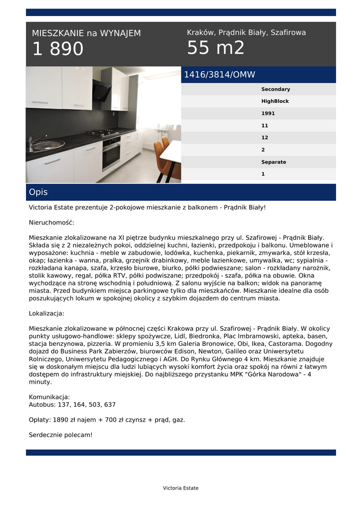 Kraków, Prądnik Biały, Szafirowa MIESZKANIE na WYNAJEM 55 m2 1 890 1416/3814/OMW Secondary HighBlock 1991 11 12 2 Separate 1 Opis Victoria Estate prezentuje 2-pokojowe mieszkanie z balkonem - Prądnik Biały! Nieruchomość: Mieszkanie zlokalizowane na XI piętrze budynku mieszkalnego przy ul. Szafirowej - Prądnik Biały. Składa się z 2 niezależnych pokoi, oddzielnej kuchni, łazienki, przedpokoju i balkonu. Umeblowane i wyposażone: kuchnia - meble w zabudowie, lodówka, kuchenka, piekarnik, zmywarka, stół krzesła, okap; łazienka - wanna, pralka, grzejnik drabinkowy, meble łazienkowe, umywalka, wc; sypialnia rozkładana kanapa, szafa, krzesło biurowe, biurko, półki podwieszane; salon - rozkładany narożnik, stolik kawowy, regał, półka RTV, półki podwiszane; przedpokój - szafa, półka na obuwie. Okna wychodzące na stronę wschodnią i południową. Z salonu wyjście na balkon; widok na panoramę miasta. Przed budynkiem miejsca parkingowe tylko dla mieszkańców. Mieszkanie idealne dla osób poszukujących lokum w spokojnej okolicy z szybkim dojazdem do centrum miasta. Lokalizacja: Mieszkanie zlokalizowane w północnej części Krakowa przy ul. Szafirowej - Prądnik Biały. W okolicy punkty usługowo-handlowe: sklepy spożywcze, Lidl, Biedronka, Plac Imbramowski, apteka, basen, stacja benzynowa, pizzeria. W promieniu 3,5 km Galeria Bronowice, Obi, Ikea, Castorama. Dogodny dojazd do Business Park Zabierzów, biurowców Edison, Newton, Galileo oraz Uniwersytetu Rolniczego, Uniwersytetu Pedagogicznego i AGH. Do Rynku Głównego 4 km. Mieszkanie znajduje się w doskonałym miejscu dla ludzi lubiących wysoki komfort życia oraz spokój na równi z łatwym dostępem do infrastruktury miejskiej. Do najbliższego przystanku MPK "Górka Narodowa" - 4 minuty. Komunikacja: Autobus: 137, 164, 503, 637 Opłaty: 1890 zł najem + 700 zł czynsz + prąd, gaz. Serdecznie polecam! Victoria Estate Natalia Sujdak tel. +48 516 547 102 email: [email protected] Victoria Estate Powered by TCPDF (www.tcpdf.org)