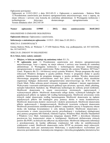 Ogłoszenie powiązane: Ogłoszenie nr 111915-2012 z dnia 2012-05-21 r. Ogłoszenie o zamówieniu - Stalowa Wola 1) Przedmiotem zamówienia jest dostawa oprogramowania antywirusowego, wraz z zaporą, na stacje robocze i serwery oraz konsolą do centralnej administracji. 2) Wymagania techniczne i technologiczne dotyczące dostarczanego oprogramowania w... Termin składania ofert: 2012-05-30 Numer ogłoszenia: 119985 - 2012; data zamieszczenia: 30.05.2012 OGŁOSZENIE O ZMIANIE OGŁOSZENIA Ogłoszenie dotyczy: Ogłoszenia o zamówieniu. Informacje o zmienianym ogłoszeniu: 111915 - 2012 data 21.05.2012 r. SEKCJA I: ZAMAWIAJĄCY Gmina Stalowa Wola, ul. Wolności 7, 37-450 Stalowa Wola, woj. podkarpackie, tel. 015 6433456, fax. 015 6433412. SEKCJA II: ZMIANY W OGŁOSZENIU II.1) Tekst, który należy zmienić: • Miejsce, w którym znajduje się zmieniany tekst: II.1.3).. • W ogłoszeniu jest: 1) Przedmiotem zamówienia jest dostawa oprogramowania antywirusowego, wraz z zaporą, na stacje robocze i serwery oraz konsolą do centralnej administracji. 2) Wymagania techniczne i technologiczne dotyczące dostarczanego oprogramowania w ramach zamówienia: Pełne wsparcie dla systemu Windows XP/Vista/7 Linux. Wsparcie dla 32- i 64-bitowej wersji systemu Windows. Wersja programu dla stacji roboczych Windows dostępna w języku polskim. Pomoc w programie (help) w języku polskim. Dokumentacja do programu dostępna w języku polskim. Wysoka skuteczność oferowanego programu potwierdzona musi być przez co najmniej dwie niezależne organizacje badające skuteczność oprogramowania antywirusowego np. ICSA labs lub Check Mark. Pełna ochrona przed wirusami, trojanami, robakami i innymi zagrożeniami. Wykrywanie i usuwanie niebezpiecznych aplikacji typu ad-aware, spyware, dialer, phishing, narzędzi hakerskich, backdoor, itp. Wbudowana technologia do ochrony przed rootkitami. Możliwość skanowania w czasie rzeczywistym otwieranych, zapisywanych i wykonywanych plików. Możliwość skanowania całego dysku, wybranych katalogów lub pojedynczych plików na żądanie lub według harmonogramu. Możliwość utworzenia wielu różnych zadań skanowania według harmonogramu Możliwość skanowania na żądanie pojedynczych plików lub katalogów przy pomocy skrótu w menu kontekstowym. Możliwość skanowania dysków sieciowych i dysków przenośnych. Możliwość skanowania plików spakowanych i skompresowanych. Możliwość tworzenia wyłączeń skanowania Możliwość przeniesienia zainfekowanych plików i załączników poczty w bezpieczny obszar dysku (do katalogu kwarantanny) w celu dalszej kontroli. Możliwość skanowania i oczyszczania w czasie rzeczywistym poczty przychodzącej i wychodzącej obsługiwanej przy pomocy programu MS Outlook, Outlook Express, Windows Mail, Mozilla Thunderbird i Windows Live Mail. Automatyczna integracja skanera POP3 z dowolnym klientem pocztowym bez konieczności zmian w konfiguracji. Możliwość definiowania różnych portów dla POP3, na których ma odbywać się skanowanie. Możliwość dołączenia informacji o przeskanowaniu do każdej odbieranej wiadomości lub tylko do zainfekowanych wiadomości e-mail. Możliwość skanowania ruchu HTTP na poziomie stacji roboczych. Zainfekowany ruch jest automatycznie blokowany, a użytkownikowi wyświetlane jest stosowne powiadomienie. Automatyczna integracja z dowolną przeglądarką internetową bez konieczności zmian w konfiguracji. Program powinien umożliwiać skanowanie ruchu sieciowego wewnątrz szyfrowanych protokołów HTTPS i POP3S. Program powinien skanować ruch HTTPS transparentnie bez potrzeby konfiguracji zewnętrznych aplikacji takich jak przeglądarki Web lub programy pocztowe. Program powinien mieć możliwość definiowania typu aktualizacji systemowych o braku których będzie informował użytkownika. Program powinien oferować funkcję, która aktywnie monitoruje i skutecznie blokuje działania wszystkich plików programu, jego procesów, usług i wpisów w rejestrze przed próbą ich modyfikacji przez aplikacje trzecie. Automatyczna przyrostowa aktualizacja baz wirusów i innych zagrożeń. Aktualizacja dostępna bezpośrednio z Internetu, z lokalnego zasobu sieciowego Możliwość określenia częstotliwości aktualizacji w odstępach 1 minutowych. Praca programu musi być transparentna dla użytkownika. Dziennik zdarzeń rejestrujący informacje na temat znalezionych zagrożeniach, dokonanych aktualizacji baz wirusów i samego oprogramowania. 3) Wymagania techniczne i technologiczne dotyczące zapory osobistej: Zapora osobista musi umożliwiać pracę w jednym z 3 trybów: a) tryb umożliwiający administratorowi zdefiniowanie wyjątków dla ruchu przychodzącego i wychodzącego w liście reguł, program pyta się o każde nowe nawiązywane połączenie i automatycznie tworzy dla niego regułę (na stałe lub tymczasowo) b) blokowanie całego ruchu sieciowego c) przepuszczanie całego ruchu sieciowego Możliwość tworzenia list sieci zaufanych. Możliwość określenia w regułach zapory osobistej kierunku ruchu, portu lub zakresu portów, protokółu, aplikacji i adresu komputera zdalnego. Wsparcie techniczne do programu świadczone w języku polskim przez polskiego dystrybutora autoryzowanego przez producenta programu. 4) Wymagania techniczne i technologiczne dotyczące Konsoli zdalnej administracji: Centralna instalacja i zarządzanie programami służącymi do ochrony stacji roboczych i serwerów plikowych Windows i Linux. Zdalna instalacja wszystkich wersji programów stacjach roboczych i serwerach XP Professional / Vista/7 Linux. Do instalacji zdalnej i zarządzania zdalnego nie jest wymagany dodatkowy agent. Na końcówkach zainstalowany jest sam program antywirusowy. Centralna konfiguracja i zarządzanie ochroną antywirusową, antyspyware, oraz zaporą osobistą (tworzenie reguł obowiązujących dla wszystkich stacji) zainstalowanymi na stacjach roboczych w sieci korporacyjnej z jednego 