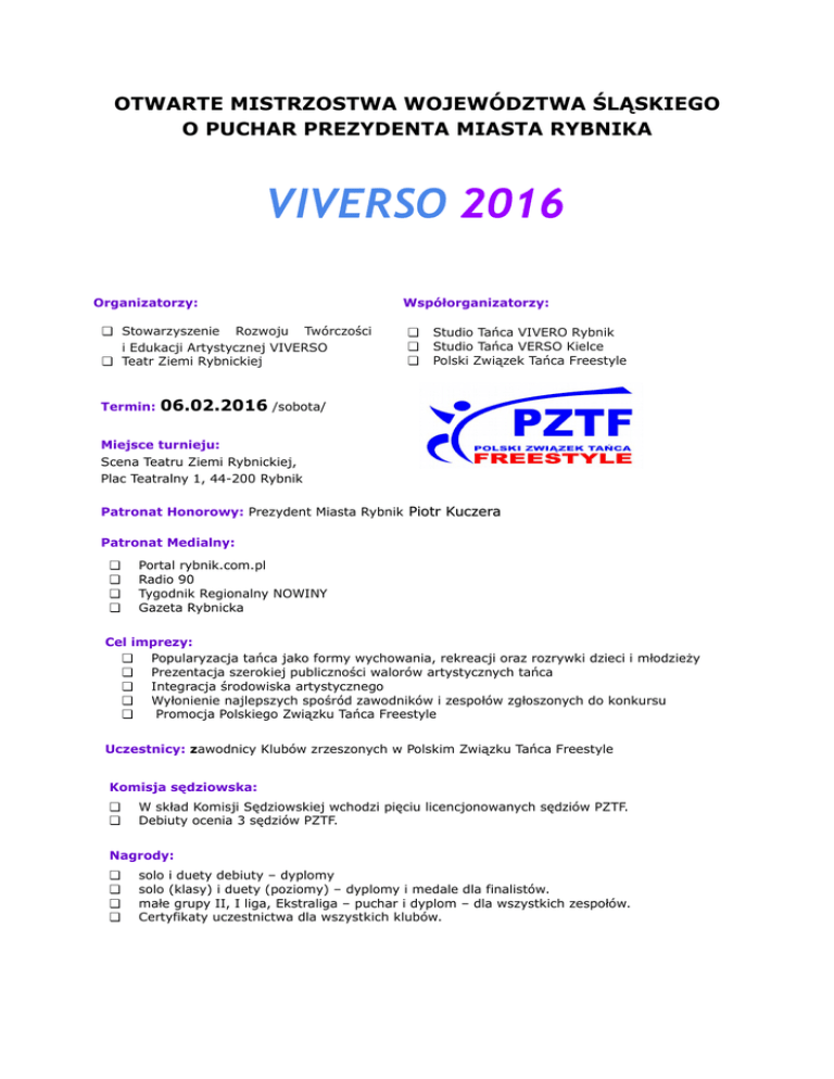 OTWARTE MISTRZOSTWA WOJEWÓDZTWA ŚLĄSKIEGO O PUCHAR PREZYDENTA MIASTA RYBNIKA VIVERSO 2016 Organizatorzy: ❏ Stowarzyszenie Rozwoju Twórczości i Edukacji Artystycznej VIVERSO ❏ Teatr Ziemi Rybnickiej Termin: Współorganizatorzy: ❏ ❏ ❏ Studio Tańca VIVERO Rybnik Studio Tańca VERSO Kielce Polski Związek Tańca Freestyle 06.02.2016 /sobota/ Miejsce turnieju: Scena Teatru Ziemi Rybnickiej, Plac Teatralny 1, 44-200 Rybnik Patronat Honorowy: Prezydent Miasta Rybnik Piotr Kuczera Patronat Medialny: ❏ ❏ ❏ ❏ Portal rybnik.com.pl Radio 90 Tygodnik Regionalny NOWINY Gazeta Rybnicka Cel imprezy: ❏ Popularyzacja tańca jako formy wychowania, rekreacji oraz rozrywki dzieci i młodzieży ❏ Prezentacja szerokiej publiczności walorów artystycznych tańca ❏ Integracja środowiska artystycznego ❏ Wyłonienie najlepszych spośród zawodników i zespołów zgłoszonych do konkursu ❏ Promocja Polskiego Związku Tańca Freestyle Uczestnicy: zawodnicy Klubów zrzeszonych w Polskim Związku Tańca Freestyle Komisja sędziowska: ❏ ❏ W skład Komisji Sędziowskiej wchodzi pięciu licencjonowanych sędziów PZTF. Debiuty ocenia 3 sędziów PZTF. Nagrody: ❏ ❏ ❏ ❏ solo i duety debiuty – dyplomy solo (klasy) i duety (poziomy) – dyplomy i medale dla finalistów. małe grupy II, I liga, Ekstraliga – puchar i dyplom – dla wszystkich zespołów. Certyfikaty uczestnictwa dla wszystkich klubów. Kategorie wiekowe: Solo / duety Dzieci: małe grupy 7 lat i młodsi 8 - 9 lat 10 - 11 lat (2009 i młodsi) (2008 – 2007) (2006 – 2005) Juniorzy: 12 - 13 lat 14 - 15 lat (2004 – 2003) (2002 – 2001) Dorośli: 16 lat i starsi (2000 i starsi) - Dzieci: 11 lat i młodsi (2005 i młodsi) Juniorzy: 12 – 15 lat (2004 – 2001) Dorośli: 16 lat i starsi (2000 i starsi) Dorośli 2 31 lat i starsi (1985 i starsi) O przynależności do danej kategorii wiekowej decyduje wiek najstarszego uczestnika organizator zastrzega sobie prawo do połączenia kategorii wiekowych (w kategorii dzieci i juniorów), jeżeli do startu zgłoszone jest 4 lub mniej podmiotów w kategorii. Dyscypliny taneczne: ❏ ❏ ❏ ❏ Jazz Dance Modern Disco Dance Hip-Hop Konkurencje taneczne: ❏ ❏ ❏ Solo - w poszczególnych dyscyplinach klasy: debiuty, E,D,C,B,A,S – wyłącznie dla tancerzy PZTF Duety - w poszczególnych dyscyplinach poziomy: debiuty, D+E, B+C, S+A– wyłącznie dla tancerzy PZTF Małe grupy: - II liga: zespoły początkujące, zespoły szkolne, bez podziału na dyscypliny taneczne. - I liga: zespoły średnio zaawansowane; uczestnicy ogólnopolskich festiwali i turniejów. Podział na Zespoły Street i Zespoły Art. - Ekstraliga: zespoły zaawansowane (uczestnicy MŚ, ME, PE, KM IDO, finaliści dużych festiwali). Podział na dyscypliny i kategorie – zgodnie z przepisami IDO. Uwaga! w zespołach mogą rywalizować tancerze niezrzeszeni, Czas oraz inne informacje dotyczące prezentacji: ❏ ❏ ❏ ❏ ❏ Disco Dance, Hip Hop Solo i duety: 1,00 min. (muzyka organizatora) Jazz Dance, Modern solo i duety - 1,00 min. (muzyka obowiązująca w sezonie 2015/2016) solo (kl. A, S)i duety (na poziomie S+A) - w eliminacjach short program 1,00 min, w finale prezentacje do muzyki własnej 1:45-2:15 min. Zespoły II liga i I liga 3 – 7 osób; czas prezentacji do 3:00 min.; muzyka własna; o przynależności do danej kategorii wiekowej decyduje wiek najstarszego uczestnika. Możliwe jest tańczenie jednej albo dwóch prezentacji przez ten sam zespół (oznacza to również, że jeden tancerz może występować w dwóch zespołach danego klubu). Zespoły Ekstra liga 3 – 7 osób; czas prezentacji do 2:30 – 3:00 min.; muzyka własna; o przynależności do danej kategorii wiekowej decyduje wiek najstarszego uczestnika. Jedna prezentacja. Warunki uczestnictwa w turnieju: ❏ ❏ ❏ ❏ Dokonanie zgłoszenia on-line – www.pztf.pl, w nieprzekraczalnym terminie do 25.01.2016r. Wpłata opłaty startowej ii przesłanie potwierdzenia przelewu na adres e-mail: [email protected] w nieprzekraczalnym terminie do dnia 25.01.2016r. Potwierdzenie uczestnictwa w dniu zawodów w Biurze Organizacyjnym Rejestracji dokonuje przedstawiciel klubu. Nie ma możliwości zgłaszania się indywidualnie. Za nieprawidłowe zgłoszenie odpowiada trener / przedstawiciel klubu. W przypadku uzasadnionego protestu nieprawidłowo zgłoszeni uczestnicy zostają zdyskwalifikowani w danej kategorii i dyscyplinie tanecznej. W tym wypadku wszelkie opłaty (w tym startowe) nie podlegają zwrotowi. Startowe wynosi: - 40 zł od osoby - w przypadku tańczenia wyłącznie w zespołach II liga i I liga (mała Grupa). - 20 zł od osoby - za każdy następne start w zespole II i I lidze (mała Grupa). - 60 zł od osoby - w przypadku tańczenia w Ekstra lidze za pierwszą konkurencję. 30 zł od osoby - za każdy następne start w zespole. Ceny promocyjne dla członków uczestników PZTF: - 30 zł od osoby - za pierwszą kategorię (solo, duety) - 10 zł od osoby - za każdy następny start. - 20 zł od osoby - debiuty za pierwszy start. 10 zł od osoby - za każdy następny start. - 10 zł od osoby - w przypadku tańczenia wyłącznie w II i I lidze (mała Grupa) za każdy start, - 30 zł odo osoby - w przypadku tańczenia w zespołach Eksta ligi (mała Grupa). 10 zł od osoby - za każdy następny start. Dla członków PFT (należy mieć ze sobą dokument potwierdzający przynależność): - 20 zł od osoby - w przypadku tańczenia wyłącznie w II i I liga (mała Grupa) - 40 zł od osoby - w przypadku tańczenia w Ekstra lidze za pierwszą konkurencję. 20 zł od osoby - za każdy następny start. Opłatę startową należy przesłać na konto: Stowarzyszenie Rozwoju Twórczości i Edukacji Artystycznej VIVERSO ul. Św. Leonarda 15/7, 25-311 Kielce konto: 24 8493 0004 0000 0063 1611 0001 z dopiskiem: [nazwa klubu] VIVERSO 2016 z opisem opłacanych startów. (np. 4xS; 2xD; 3xmG) UWAGA! 25.01.2016r. stanowi ostateczną datę wniesienia