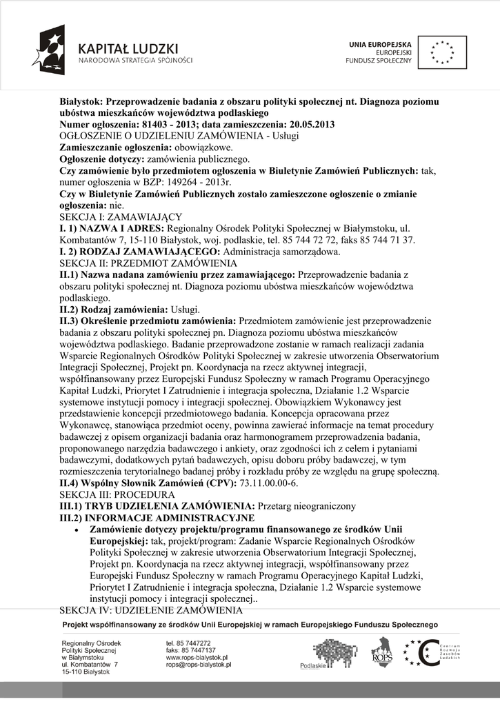 Białystok: Przeprowadzenie badania z obszaru polityki społecznej nt. Diagnoza poziomu ubóstwa mieszkańców województwa podlaskiego Numer ogłoszenia: 81403 - 2013; data zamieszczenia: 20.05.2013 OGŁOSZENIE O UDZIELENIU ZAMÓWIENIA - Usługi Zamieszczanie ogłoszenia: obowiązkowe. Ogłoszenie dotyczy: zamówienia publicznego. Czy zamówienie było przedmiotem ogłoszenia w Biuletynie Zamówień Publicznych: tak, numer ogłoszenia w BZP: 149264 - 2013r. Czy w Biuletynie Zamówień Publicznych zostało zamieszczone ogłoszenie o zmianie ogłoszenia: nie. SEKCJA I: ZAMAWIAJĄCY I. 1) NAZWA I ADRES: Regionalny Ośrodek Polityki Społecznej w Białymstoku, ul. Kombatantów 7, 15-110 Białystok, woj. podlaskie, tel. 85 744 72 72, faks 85 744 71 37. I. 2) RODZAJ ZAMAWIAJĄCEGO: Administracja samorządowa. SEKCJA II: PRZEDMIOT ZAMÓWIENIA II.1) Nazwa nadana zamówieniu przez zamawiającego: Przeprowadzenie badania z obszaru polityki społecznej nt. Diagnoza poziomu ubóstwa mieszkańców województwa podlaskiego. II.2) Rodzaj zamówienia: Usługi. II.3) Określenie przedmiotu zamówienia: Przedmiotem zamówienie jest przeprowadzenie badania z obszaru polityki społecznej pn. Diagnoza poziomu ubóstwa mieszkańców województwa podlaskiego. Badanie przeprowadzone zostanie w ramach realizacji zadania Wsparcie Regionalnych Ośrodków Polityki Społecznej w zakresie utworzenia Obserwatorium Integracji Społecznej, Projekt pn. Koordynacja na rzecz aktywnej integracji, współfinansowany przez Europejski Fundusz Społeczny w ramach Programu Operacyjnego Kapitał Ludzki, Priorytet I Zatrudnienie i integracja społeczna, Działanie 1.2 Wsparcie systemowe instytucji pomocy i integracji społecznej. Obowiązkiem Wykonawcy jest przedstawienie koncepcji przedmiotowego badania. Koncepcja opracowana przez Wykonawcę, stanowiąca przedmiot oceny, powinna zawierać informacje na temat procedury badawczej z opisem organizacji badania oraz harmonogramem przeprowadzenia badania, proponowanego narzędzia badawczego i ankiety, oraz zgodności ich z celem i pytaniami badawczymi, dodatkowych pytań badawczych, opisu doboru próby badawczej, w tym rozmieszczenia terytorialnego badanej próby i rozkładu próby ze względu na grupę społeczną. II.4) Wspólny Słownik Zamówień (CPV): 73.11.00.00-6. SEKCJA III: PROCEDURA III.1) TRYB UDZIELENIA ZAMÓWIENIA: Przetarg nieograniczony III.2) INFORMACJE ADMINISTRACYJNE Zamówienie dotyczy projektu/programu finansowanego ze środków Unii Europejskiej: tak, projekt/program: Zadanie Wsparcie Regionalnych Ośrodków Polityki Społecznej w zakresie utworzenia Obserwatorium Integracji Społecznej, Projekt pn. Koordynacja na rzecz aktywnej integracji, współfinansowany przez Europejski Fundusz Społeczny w ramach Programu Operacyjnego Kapitał Ludzki, Priorytet I Zatrudnienie i integracja społeczna, Działanie 1.2 Wsparcie systemowe instytucji pomocy i integracji społecznej.. SEKCJA IV: UDZIELENIE ZAMÓWIENIA IV.1) DATA UDZIELENIA ZAMÓWIENIA: 17.05.2013. IV.2) LICZBA OTRZYMANYCH OFERT: 6. IV.3) LICZBA ODRZUCONYCH OFERT: 4. IV.4) NAZWA I ADRES WYKONAWCY, KTÓREMU UDZIELONO ZAMÓWIENIA: General Projekt Sp. z o. o., ul. Zakole 2, 10-699 Olsztyn, kraj/woj. warmińskomazurskie. IV.5) Szacunkowa wartość zamówienia (bez VAT): 46133,33 PLN. IV.6) INFORMACJA O CENIE WYBRANEJ OFERTY ORAZ O OFERTACH Z NAJNIŻSZĄ I NAJWYŻSZĄ CENĄ Cena wybranej oferty: 49200,00 Oferta z najniższą ceną: 33000,00 / Oferta z najwyższą ceną: 150675,00 Waluta: PLN.