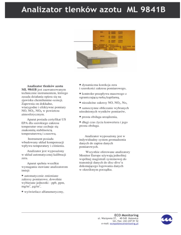Analizator tlenków azotu ML 9841B jest zaawansowanym technicznie instrumentem, którego zasada działania opiera si na zjawisku chemilumine-scencji. Zapewnia on dokładne, wiarygodne i efektywne pomiary NO, NO2, NOX w powietrzu atmosferycznym. Aparat posiada certyfikat US EPA dla szerokiego zakresu temperatur oraz cechuje si znakomit stabilno ci temperaturow i czasow . Instrument posiada wbudowany układ kompensacji wpływu temperatury i ci nienia. Analizator jest wyposa ony w układ automatycznej kalibracji zera. Aparat spełnia wszelkie wymagania stawiane analizatorom imisji: dynamiczna korekcja zera i szeroko ci zakresu pomiarowego, kontroler przepływu masowego z ograniczaj c rurk kapilarn , niezale ne zakresy NO, NO2, Nox samoczynne obliczanie wybranych u rednionych wyników pomiarów, prosta obsługa urz dzenia, długi czas ycia konwertera i jego prosta obsługa. Analizator wyposa ony jest w indywidualny system gromadzenia danych do zapisu danych pomiarowych. Wszystkie oferowane analizatory Monitor Europe u ywaj jednolitej wspólnej magistrali systemowej do transmisji danych do disc-dive’u dokonuj cego logowania danych w okre lonym porz dku. automatycznie zmieniane zakresy pomiarowe, dowolnie wybierane jednostki - ppb, ppm, mg/m3, µg/m3, wy wietlacz alfanumeryczny, ! !" # ! $" Dane techniczne analizatora ML 9841A: ZAKRESY POMIAROWE: Odczyt : Automatyczne ustawianie zakresu 0-20 ppm, rozdzielczo 0.001 ppm Wyj cie analogowe: 0pełny zakres od 0.05 ppm do 0-20 ppm z offsetem 0,5 i 10% Autoskalowanie pomi dzy dwiema wybranymi przez operatora warto ciami pełnego zakresu. Zakres, w którym analizator jest uznawany jako referencyjny przez US EPA : Ka dy zakres pełnej skali pomi dzy 0-0.05ppm i 01.0ppm SZUMY (WARTO SKUTECZNA): ZMIANA W CZASIE PUNKTU ZEROWEGO (DRYF): Zale no od temperatury 0.01% na oC. W stałej temperaturze zale na od czasu : - 24 godziny : mniej ni 0.1 ppb - 30 dni : mniej ni 0.1 ppb ZMIANA GÓRNEJ WARTO CI ZAKRESU POMIAROWEGO (DRYF): Zale na od temperatury 0.05% na oC. W stałej temperaturze zale na od czasu : - 24 godziny : 1% odczytu - 30 dni : 1% odczytu CZAS ZWŁOKI: Krótszy ni 25 sec CZAS NARASTANIA/OPADANIA: Szumy procesu pomiarowego: 0.025 ppb lub 0.1% odczytu st enia w zale no ci, która warto jest wi ksza z aktywnym filtrem Kalmana. Wyj cie analogowe : 0.025 ppb lub 0.1% pełnego zakresu wyj cia analogowego w zale no ci, która warto jest wi ksza. DOKŁADNO : 0.5 ppb lub 1% odczytu w zale no ci która warto jest wi ksza NAJNI SZE WYKRYWALNE ST ENIA: WIELKO PRZEPŁYWU PRÓBKI: 640 ml/min W procesie pomiarowym: lepiej ni 0.35 ppb lub 0.2% odczytu st enia w zale no ci, która warto jest wi ksza, z aktywnym filtrem Kalmana. Na wyj ciu analogowym : 0.5 ppb lub 0.2% pełnej skali wyj cia analogowego, w zale no ci, która warto jest wi ksza. ZALE NO ODCZYTU OD CI NIENIA: PRÓBKI: 5% zmiany ci nienia powoduje mniej ni 1% zmiany w odczycie. Do 95% ko cowego odczytu mniej ni 30 sec z aktywnym filtrem Kalmana BŁ D NIELINIOWO CI: +/- 1% pełnego zakresu TEMPERATUROWY ZAKRES PRACY: od 5oC do 40oC (Zakres zalecany przez US EPA 15oC do 35oC) ZASILANIE: pr d zmienny 99-132V, 198-264V, 47-63Hz WYMIARY: 43.2 x 17.8 x 64.8 cm (szer. x wys. x gł b.) WAGA: 27,7 kg WYJ CIA ANALOGOWE: Wybór napi cia wyj ciowego zwork spomi dzy 100mV, 1V, 5V i 10V z ustawianym w menu offsetem zera 0, 5% lub 10%. Wybierany z menu pr d wyj ciowy 0-20mA, 220mA, 4-20mA. Niezale ne wyj cia dla NO, NO2, NOX WYJ CIA CYFROWE: Wielofunkcyjny kanał RS 232 dla danych, statusu i kontroli pracy aparatu. Kanał równoległy Centronics z protokołem kompatybilnym ze standardem EPSON. Zł cze DB 50 ze statusami funkcji dyskretnych, funkcjami kontrolnymi i wyj ciem analogowym. Opcjonalnie port RS 232 na panelu czołowym.