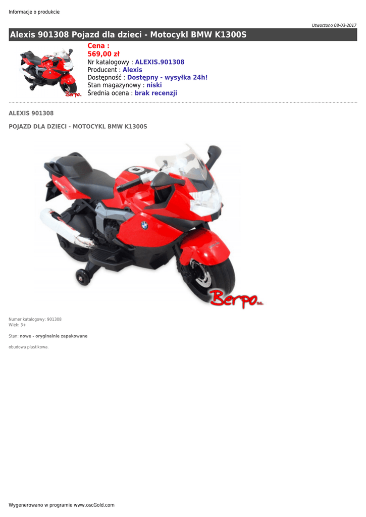 Informacje o produkcie Utworzono 08-03-2017 Alexis 901308 Pojazd dla dzieci - Motocykl BMW K1300S Cena : 569,00 zł Nr katalogowy : ALEXIS.901308 Producent : Alexis Dostępność : Dostępny - wysyłka 24h! Stan magazynowy : niski Średnia ocena : brak recenzji ALEXIS 901308 POJAZD DLA DZIECI - MOTOCYKL BMW K1300S Numer katalogowy: 901308 Wiek: 3+ Stan: nowe - oryginalnie zapakowane obudowa plastikowa. Wygenerowano w programie www.oscGold.com Dostępność w salonach: Ilość: Sklep - Złotniki: 1 Sklep - zlikwidowany: 0 Sklep - Szczepankowo: 0 Dostępne opcje Alexis 901308 Pojazd dla dzieci - Motocykl BMW K1300S » Wiek: 3 - 4 lat, 5 - 7 lat.