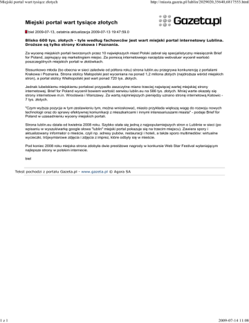 Miejski portal wart tysiące złotych 1z1 http://miasta.gazeta.pl/lublin/2029020,35640,6817553.html Miejski portal wart tysiące złotych biel 2009-07-13, ostatnia aktualizacja 2009-07-13 19:47:59.0 Blisko 600 tys. złotych - tyle według fachowców jest wart miejski portal internetowy Lublina. DroŜsze są tylko strony Krakowa i Poznania. Za wycenę miejskich portali tworzonych przez 10 największych miast Polski zabrał się specjalistyczny miesięcznik Brief for Poland, zajmujący się marketingiem miejsc. Za pomocą internetowego narzędzia webvaluer wycenił wartość poszczególnych miejskich portali w złotówkach. Stosunkowo młoda (bo obecna w sieci zaledwie od półtora roku) strona lublin.eu przegrywa konkurencję z portalami Krakowa i Poznania. Strona stolicy Małopolski jest wyceniana na ponad 1,2 miliona złotych (najdroŜsza wśród miejskich stron), a portal stolicy Wielkopolski jest wart ponad 720 tys. złotych. Jednak lubelskiemu miejskiemu portalowi przypadło zaszczytne miano trzeciej najwięcej wartej miejskiej strony internetowej. Brief for Poland wycenił bowiem wartość serwisu lublin.eu na 586 tys. złotych. Mniej warte okazały się strony internetowe m.in. Wrocławia i Warszawy. Za wartą najmniejszych pieniędzy uznano stronę internetową Katowic 7 tys. złotych. "Czym wyŜsza pozycja w tym zestawieniu tym, moŜna wnioskować, miasto przykłada większą wagę do rozwoju nowych technologii oraz do sprawy efektywnej komunikacji z mieszkańcami i innymi interesariuszami miasta" - podaje Brief for Poland w uzasadnieniu wyceny miejskich portali. Strona lublin.eu działa od kwietnia 2008 roku. Szybko stała się jedną z najpopularniejszych stron o Lublinie w sieci (po wpisaniu w wyszukiwarkę google słowa "lublin" miejski portal pokazuje się na trzecim miejscu). Zawiera spory i aktualizowany informator o mieście, czyli np. adresy pubów, restauracji i hoteli, a takŜe sporo multimediów: wirtualne wycieczki, trójwymiarowe zdjęcia i zdjęcia z imprez, które odbyły się w mieście. Pod koniec 2008 roku miejska strona zdobyła dwie prestiŜowe nagrody w konkursie Web Star Festival wyłaniającym najlepsze strony w polskim internecie. biel Tekst pochodzi z portalu Gazeta.pl - www.gazeta.pl © Agora SA 2009-07-14 11:08