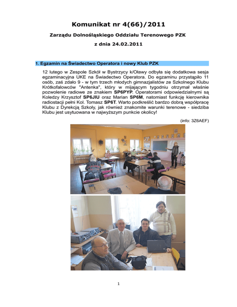 Komunikat nr 4(66)/2011 Zarządu Dolnośląskiego Oddziału Terenowego PZK z dnia 24.02.2011 1. Egzamin na Świadectwo Operatora i nowy Klub PZK 12 lutego w Zespole Szkół w Bystrzycy k/Oławy odbyła się dodatkowa sesja egzaminacyjna UKE na Świadectwo Operatora. Do egzaminu przystąpiło 11 osób, zaś zdało 9 - w tym trzech młodych gimnazjalistów ze Szkolnego Klubu Krótkofalowców "Antenka", który w mijającym tygodniu otrzymał właśnie pozwolenie radiowe ze znakiem SP6PYP. Operatorami odpowiedzialnymi są Koledzy Krzysztof SP6JIU oraz Marian SP6M, natomiast funkcję kierownika radiostacji pełni Kol. Tomasz SP6T. Warto podkreślić bardzo dobrą współpracę Klubu z Dyrekcją Szkoły, jak również znakomite warunki terenowe - siedziba Klubu jest usytuowana w najwyższym punkcie okolicy! (info: 3Z6AEF) 1 2. Współzawodnictwo sportowe DOT Uchwałą Zarządu DOT z dnia 4 lutego został przyjęty Regulamin Współzawodnictwa Sportowego DOT, zaproponowany przez Contest Managera DOT, Kol. Marka SP6NIC. Pełny tekst Regulaminu zamieszczony jest na stronie www Oddziału - zachęcamy wszystkich do zapoznania się i aktywnego uczestnictwa w krajowych zawodach! Aby wziąć udział we współzawodnictwie, nie są wymagane żadne zgłoszenia wystarczy brać udział w zawodach i oczywiście w terminie wysyłać logi do organizatorów. Zaliczane są wszystkie zawody ogłoszone w „Kalendarzu Zawodów Krajowych” ogłoszonym na Portalu PZK - za udział, potwierdzony sklasyfikowaniem przez organizatorów, uzyskuje się 1 punkt. Dodatkowo, za udział w SPDX Contest oraz w Zawodach Dolnośląskich, uzyskuje się po 3 punkty. Rozliczenie Współzawodnictwa odbędzie się po opublikowaniu wszystkich wyników zawodów. Najlepsze stacje otrzymają Puchar i dyplomy - szczegóły w Regulaminie! (info: SP6NIC) 3. Ćwiczenia SP-EmCom W sobotę 14 maja w godzinach od 15 -17 UTC (17-19 czasu lokalnego) odbędą się Ogólnopolskie Ćwiczenia Łączności Kryzysowej SP EmCom 2011. Jednym z głównych celów ćwiczeń będzie doskonalenie umiejętności nadawania, przekazywania i odbierania komunikatów kryzysowych, zgodnie z procedurami przyjętymi przez wszystkie trzy Regiony IARU. Znajomość tych standardów jest konieczna, aby wiedzieć, co należy robić, gdy w eterze słyszy się wywołanie "emergency" - będzie wiadomo jak zapisać i w jakiej formie oraz gdzie przekazać odebraną informację. Ogólnopolskie ćwiczenia łączności kryzysowej SP EmCom 2011 składają się z czterech części przy wykorzystaniu łączności w paśmie 3,7 MHz (80m) oraz 145 MHz (2m). Program tegorocznych ćwiczeń umożliwia udział również stacjom mającym dostęp tylko do pasma 2m, będącym w zasięgu okręgowej stacji sztabowej, pracującej na wyznaczonym przemienniku oraz kanale FM. Utworzenie okręgowych stacji sztabowych ma na celu symulację pracy radiostacji amatorskich działających równolegle, np. przy Centrach Zarządzania Kryzysowego (wojewódzkich, powiatowych, gminnych). Łączności między wszystkimi stacjami biorącymi udział w ćwiczeniach będą prowadzone zgodnie z procedurami łączności kryzysowej Międzynarodowej Unii Radioamatorskiej IARU. Regulamin SP EmCom 2011 jest dostępny na stronie http://emcom.pzk.org.pl. (info: SQ6IYR) 2 4. Konkurs PUK-2011 W bieżącym numerze 2/2011 miesięcznika Świat Radio opublikowany został Regulamin konkursu PUK-2011, na Przydatne Urządzenie Krótkofalarskie. Konkurs jest organizowany przez grupy SP-QRP oraz SP-HomeMade, pod patronatem redakcji „Świata Radio” i „Elektroniki Praktycznej”. Uczestnikiem konkursu może być konstruktor lub zespół konstruktorów, który zgłosi swój udział i dostarczy do oceny działające urządzenie, przydatne w praktyce krótkofalarskiej. Jest to już druga edycja tego konkursu, tym razem prace mogą być zgłaszane w jednej z czterech kategorii - przewidziano również kategorię „dla początkujących”, gdzie kryteria są bardzo liberalne, tak, aby każdy radioamator-krótkofalowiec, który buduje urządzenia na podstawie istniejących opisów, także mógł wziąć udział w konkursie. Zapraszamy wszystkich, którzy zajmują się konstrukcyjną stroną naszego hobby, do zapoznania się z warunkami Konkursu i do udziału! Do wygrania są cenne nagrody - w ubiegłym roku nagrodą główną był dobrej klasy oscyloskop cyfrowy! (info: SP6IFN) 5. Kurs przygotowawczy do egzaminu na Świadectwo Operatora Przypominamy, że od jutra, 25 lutego do 6 maja br. w klubie SP6PRT będzie odbywał się kurs przygotowujący do egzaminu na Świadectwo Operatora urządzeń radiowych w Służbie Radiokomunikacyjnej Amatorskiej. Zajęcia odbywać się będą w każdy piątek w godzinach od 17:00 do 19:00. Zgłoszenia oraz szczegółowe informacje można uzyskać u Bolka SP6CCI, jak również w siedzibie klubu SP6PRT przy ul. Pretficza 14-16 we Wrocławiu. Egzamin w Dolnośląskim OT PZK zaplanowany jest na 7 maja 2011 r. (info: SP6CCI) 6. Składki członkowskie PZK 15 stycznia upłynął termin wpłacania składek członkowskich PZK na rok 2011 (lub 1. półrocze 2011). Przypominamy wszystkim Koleżankom i Kolegom, którzy nie wpłacili składek, że zgodnie ze Statutem, po 3 miesiącach ustanie ich członkostwo w PZK. Prosimy zatem o uregulowanie zaległości składkowych. Składka członkowska PZK składa się z części przekazywanej do Zarządu Głównego oraz z części pozostającej w DOT (20 zł). Fundusze gromadzone przez Oddział przeznaczane są na cele wspólne, jak wysyłka kart QSL do Centralnego Biura, opłaty pocztowe, opłaty związane z uzyskiwaniem pozwoleń radiowych dla stacji klubowych, itp. - dokładne rozliczenie wydatków za rok 2010 było przedstawione w komunikacie Zarządu 01(63)/2011 z dnia 13 stycznia 2011, dostępnym na oddziałowej stronie www. (info: SQ6ADN) 3 7. Spotkanie-giełda w Trzech Kolorach Kolejne, comiesięczne spotkanie krótkofalowców DOT odbędzie się jak zwykle w pierw