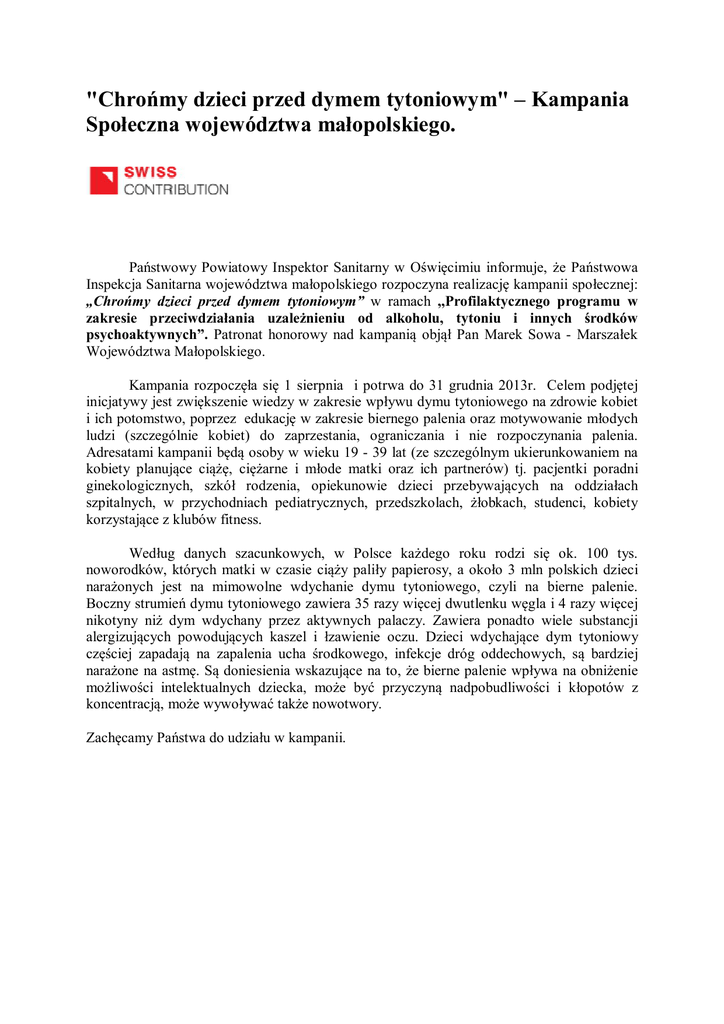 "Chrońmy dzieci przed dymem tytoniowym" – Kampania Społeczna województwa małopolskiego. Państwowy Powiatowy Inspektor Sanitarny w Oświęcimiu informuje, że Państwowa Inspekcja Sanitarna województwa małopolskiego rozpoczyna realizację kampanii społecznej: „Chrońmy dzieci przed dymem tytoniowym” w ramach ,,Profilaktycznego programu w zakresie przeciwdziałania uzależnieniu od alkoholu, tytoniu i innych środków psychoaktywnych”. Patronat honorowy nad kampanią objął Pan Marek Sowa - Marszałek Województwa Małopolskiego. Kampania rozpoczęła się 1 sierpnia i potrwa do 31 grudnia 2013r. Celem podjętej inicjatywy jest zwiększenie wiedzy w zakresie wpływu dymu tytoniowego na zdrowie kobiet i ich potomstwo, poprzez edukację w zakresie biernego palenia oraz motywowanie młodych ludzi (szczególnie kobiet) do zaprzestania, ograniczania i nie rozpoczynania palenia. Adresatami kampanii będą osoby w wieku 19 - 39 lat (ze szczególnym ukierunkowaniem na kobiety planujące ciążę, ciężarne i młode matki oraz ich partnerów) tj. pacjentki poradni ginekologicznych, szkół rodzenia, opiekunowie dzieci przebywających na oddziałach szpitalnych, w przychodniach pediatrycznych, przedszkolach, żłobkach, studenci, kobiety korzystające z klubów fitness. Według danych szacunkowych, w Polsce każdego roku rodzi się ok. 100 tys. noworodków, których matki w czasie ciąży paliły papierosy, a około 3 mln polskich dzieci narażonych jest na mimowolne wdychanie dymu tytoniowego, czyli na bierne palenie. Boczny strumień dymu tytoniowego zawiera 35 razy więcej dwutlenku węgla i 4 razy więcej nikotyny niż dym wdychany przez aktywnych palaczy. Zawiera ponadto wiele substancji alergizujących powodujących kaszel i łzawienie oczu. Dzieci wdychające dym tytoniowy częściej zapadają na zapalenia ucha środkowego, infekcje dróg oddechowych, są bardziej narażone na astmę. Są doniesienia wskazujące na to, że bierne palenie wpływa na obniżenie możliwości intelektualnych dziecka, może być przyczyną nadpobudliwości i kłopotów z koncentracją, może wywoływać także nowotwory. Zachęcamy Państwa do udziału w kampanii. Plakat: format A2- 610 x 430 mm ulotka: format A4 składana do A5 (210 x 297 mm do 148 x 210mm) Materiały kampanijne (plakat, ulotka) można otrzymać w Powiatowej Stacji SanitarnoEpidemiologicznej w Oświęcimiu, ul. Więźniów Oświęcimia 10. Bibliografia: Stańczyk Jerzy ,,Wpływ palenia tytoniu na stan zdrowia dzieci i młodzieży” [w]: Podręcznik Polskiego Forum Profilaktyki, Tom 2 ,pod red. prof. dr hab. Piotra Podolca, Kraków 2010 Mierzecki Artur, Godycki- Ćwirko Maciej, Wrzeciono Barbara, Miączyńska Magdalena ,,Palenie papierosów- profilaktyka i leczenie w praktyce lekarza rodzinnego” [w]: Podręcznik Polskiego Forum Profilaktyki, Tom 2, pod red. prof. dr hab. Piotra Podolca, Kraków 2010