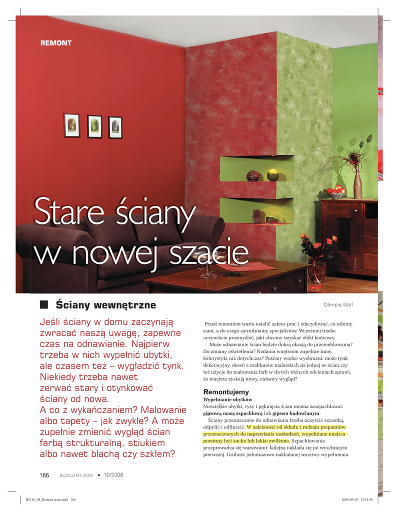 REMONT ¥ciany wewnÚtrzne JeĂli Ăciany w domu zaczynajÈ zwracaÊ naszÈ uwagÚ, zapewne czas na odnawianie. Najpierw trzeba w nich wypeïniÊ ubytki, ale czasem teĝ – wygïadziÊ tynk. Niekiedy trzeba nawet zerwaÊ stary i otynkowaÊ Ăciany od nowa. A co z wykañczaniem? Malowanie albo tapety – jak zwykle? A moĝe zupeïnie zmieniÊ wyglÈd Ăcian farbÈ strukturalnÈ, stiukiem albo nawet blachÈ czy szkïem? 166 BUDUJEMY DOM BD 10_08_Remont scian.indd 166 fot. Dulux Stare Ăciany w nowej szacie Olimpia Wolf Przed remontem warto ustaliÊ zakres prac i zdecydowaÊ, co robimy sami, a do czego zatrudniamy specjalistów. WczeĂniej trzeba oczywiĂcie przemyĂleÊ, jaki chcemy uzyskaÊ efekt koñcowy. Moĝe odnawianie Ăcian bÚdzie dobrÈ okazjÈ do przemeblowania? Do zmiany oĂwietlenia? Nadania wnÚtrzom zupeïnie innej kolorystyki niĝ dotychczas? PuĂÊmy wodze wyobraěni: moĝe tynk dekoracyjny, deseñ z szablonów malarskich na jednej ze Ăcian czy teĝ uĝycie do malowania farb w dwóch róĝnych odcieniach sprawi, ĝe wnÚtrza zyskajÈ nowy, ciekawy wyglÈd? Remontujemy Wypeïnianie ubytków Niewielkie ubytki, rysy i pÚkniÚcia Ăcian moĝna zaszpachlowaÊ gipsowÈ masÈ szpachlowÈ lub gipsem budowlanym. ¥ciany przeznaczone do odnawiania trzeba oczyĂciÊ szczotkÈ, odpyliÊ i odtïuĂciÊ. W zaleĝnoĂci od skïadu i rodzaju preparatów przeznaczonych do naprawiania uszkodzeñ, wypeïniane miejsca powinny byÊ suche lub lekko zwilĝone. Szpachlowanie przeprowadza siÚ warstwami: kolejnÈ nakïada siÚ po wyschniÚciu pierwszej. GruboĂÊ jednorazowo nakïadanej warstwy wypeïnienia 10/2008 2008-09-29 13:14:58 ¥ciany wewnÚtrzne Produkty gipsowe cieniutkich rys lub jest pokryty pleĂniÈ, trzeba go skuÊ i uïoĝyÊ nowy. Stan tynku moĝna oceniÊ, opukujÈc Ăciany – gdy wydajÈ przy tym gïuchy odgïos, Ăwiadczy to o odspojeniu wyprawy, a to znaczy, ĝe trzeba jÈ usunÈÊ. Przed spotkaniem z ekipÈ remontowÈ warto przygotowaÊ odpowiedzi na pytania: Jaki chcemy tynk – cementowo-wapienny czy gipsowy? Czy Ăciany majÈ byÊ wyrównane gïadziÈ? Czy moĝe wolimy sztablaturÚ? ¥ciany na gïadko Taki efekt moĝna uzyskaÊ, wykoñczajÈc je gïadziÈ gipsowÈ. Moĝna jÈ uïoĝyÊ na tynku Obecnie produkuje siÚ biaïe farby z minimialnym dodatkiem innego koloru, np. róĝowego fot. Alpol Gips Tynkowanie i wygïadzanie JeĂli tynk nie trzyma siÚ podïoĝa, osypuje siÚ po zarysowaniu ostrym narzÚdziem, ma siateczkÚ fot. Beckers powinna byÊ zgodna z instrukcjÈ podanÈ na opakowaniu. Uwaga! Mas gipsowych nie naleĝy stosowaÊ w pomieszczeniach o wilgotnoĂci powietrza powyĝej 70% (np. pralnie, ïaěnie). W kuchniach i ïazienkach moĝna je stosowaÊ pod warunkiem, ĝe jest tam sprawna wentylacja. ¥ciana wykoñczona standardowo ¥ciany wykañcza siÚ obecnie najczÚĂciej tynkami gipsowymi ukïadanymi na mokro. ZapewniajÈ one uzyskanie gïadkich powierzchni juĝ po naïoĝeniu jednej warstwy. Tynki te schnÈ szybko i moĝna je stosowaÊ na cegïÚ, pustaki ceramiczne lub chïonny beton. Tynki gisowe nakïada siÚ tradycyjnymi narzÚdziami lub z agregatu tynkarskiego. Na Ăcianach stosuje siÚ warstwÚ tynku gruboĂci od 8 do 25 mm. Do pomieszczeñ o podwyĝszonej wilgotnoĂci powietrza wykorzystuje siÚ tynki wapienno-gipsowe. Stosowane kiedyĂ jako ostateczne wykoñczenie wyprawy cementowo-wapienne obecnie traktuje siÚ gïównie jako podkïad pod gïadě lub sztablaturÚ. Gipsowe masy szpachlowe. Przeznaczone do wypeïniania poïÈczeñ miÚdzy pïytami gipsowo-kartonowymi. Moĝna teĝ nimi wypeïniaÊ ubytki i wygïadzaÊ powierzchniÚ Ăcian. Gips budowlany. Stosuje siÚ go do drobnych prac naprawczych: wypeïniania bruzd i pÚkniÚÊ, mocowania listew i naroĝników. Gïadzie gipsowe. Przeznaczone sÈ do wygïadzania Ăcian. Ukïada siÚ z nich cienkie powïoki gruboĂci ok. 2 mm. Zaprawy gipsowe. SïuĝÈ do tynkowania Ăcian wewnÚtrznych oraz do wyrównywania juĝ otynkowanych. W zaleĝnoĂci od potrzeby moĝna z nich ukïadaÊ powïoki gruboĂci od 8 do 25 mm. Tynki gipsowe majÈ zdolnoĂÊ pochïaniania nadmiaru wilgoci z otoczenia fot. Intermeble DziÚciÚce pokoje dobrze wyglÈdajÈ pomalowane bardziej nasyconymi kolorami cementowym, cementowo-wapiennym lub gipsowo-wapiennym – nie tylko nowym, ale teĝ na starych wyprawach, jeĂli tylko nie sÈ zniszczone. Przed naïoĝeniem gïadzi podïoĝe trzeba odpowiednio przygotowaÊ: ze starych tynków usunÈÊ szczotkÈ pyï, brud, resztki starych powïok malarskich i tïuste plamy. I stary, i nowy tynk trzeba zagruntowaÊ, aby poprawiÊ przyczepnoĂÊ warstw gïadzi. Gïadě nakïada siÚ w dwóch warstwach – ich ïÈczna gruboĂÊ ma Ărednio ok. 2 mm, wiÚc tynk pod niÈ musi byÊ równy. ¥ciany moĝna teĝ wykoñczyÊ sztablaturÈ: bÚdÈ wtedy gïadsze niĝ wykoñczone gïadziÈ gipsowÈ. SztablaturÚ – podobnie jak gïadě – moĝna ukïadaÊ na tynkach cementowo-wapiennych i gipsowych. Ukïada siÚ jÈ w dwóch warstwach, z których zewnÚtrznÈ (z gipsu modelarskiego), gruboĂci 1–2 mm, wygïadza siÚ na mokro pacÈ stalowÈ. Uwaga! Kiedy stosuje siÚ gips, trzeba pamiÚtaÊ o tym, ĝe powoduje on korozjÚ stali. Dlatego gwoědzie, dyble i kÈtowniki, BUDUJEMY DOM BD 10_08_Remont scian.indd 167 10/2008 167 2008-09-29 13:15:19 fot. Praktiker REMONT z którymi bÚdzie miaï stycznoĂÊ tynk gipsowy, powinny byÊ ocynkowane lub zabezpieczone farbÈ podkïadowÈ. PodsumowujÈc: jeĂli chcemy mieÊ Ăciany wykoñczone standardowo, wybierzmy ukïadane na mokro tynki gipsowe lub wapienno-gipsowe. JeĂli Ăciany majÈ byÊ idealnie gïadkie, moĝemy zleciÊ naïoĝenie tynku cementowo-wapiennego lub gipsowego, a potem – wygïadzenie go gïadziÈ gipsowÈ lub sztablaturÈ. Naleĝy pamiÚtaÊ, ĝe sztablatura jest duĝo droĝsza od zwyczajnych tynków czy gïadzi gipsowej: wykoñczenie Ăciany sztablaturÈ kosztuje 40–50 zï za 1m2, tynkiem gipsowym 20–30 zï za 1m2, a gïadziÈ gipsowÈ 15