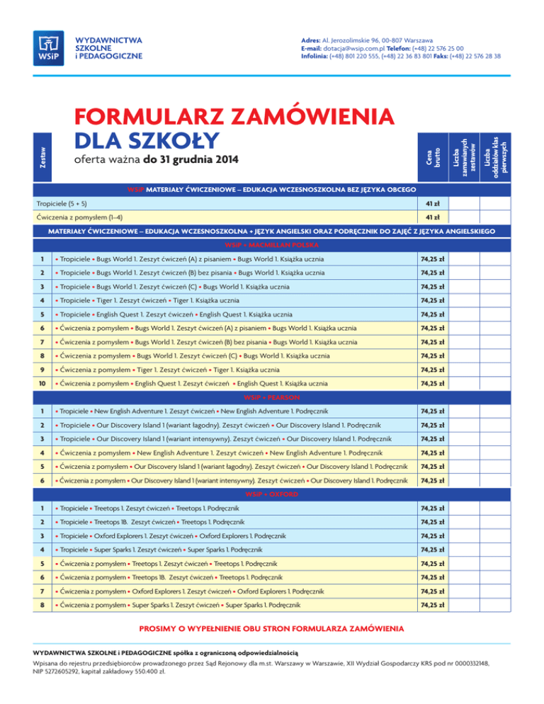 Liczba oddziałów klas pierwszych oferta ważna do 31 grudnia 2014 Liczba zamawianych zestawów FORMULARZ ZAMÓWIENIA DLA SZKOŁY Cena brutto Zestaw Adres: Al. Jerozolimskie 96, 00-807 Warszawa E-mail: [email protected] Telefon: (+48) 22 576 25 00 Infolinia: (+48) 801 220 555, (+48) 22 36 83 801 Faks: (+48) 22 576 28 38 WSiP MATERIAŁY ĆWICZENIOWE – EDUKACJA WCZESNOSZKOLNA BEZ JĘZYKA OBCEGO Tropiciele (5 + 5) 41 zł Ćwiczenia z pomysłem (1–4) 41 zł MATERIAŁY ĆWICZENIOWE – EDUKACJA WCZESNOSZKOLNA + JĘZYK ANGIELSKI ORAZ PODRĘCZNIK DO ZAJĘĆ Z JĘZYKA ANGIELSKIEGO WSiP + MACMILLAN POLSKA 1 • Tropiciele • Bugs World 1. Zeszyt ćwiczeń (A) z pisaniem • Bugs World 1. Książka ucznia 74,25 zł 2 • Tropiciele • Bugs World 1. Zeszyt ćwiczeń (B) bez pisania • Bugs World 1. Książka ucznia 74,25 zł 3 • Tropiciele • Bugs World 1. Zeszyt ćwiczeń (C) • Bugs World 1. Książka ucznia 74,25 zł 4 • Tropiciele • Tiger 1. Zeszyt ćwiczeń • Tiger 1. Książka ucznia 74,25 zł 5 • Tropiciele • English Quest 1. Zeszyt ćwiczeń • English Quest 1. Książka ucznia 74,25 zł 6 • Ćwiczenia z pomysłem • Bugs World 1. Zeszyt ćwiczeń (A) z pisaniem • Bugs World 1. Książka ucznia 74,25 zł 7 • Ćwiczenia z pomysłem • Bugs World 1. Zeszyt ćwiczeń (B) bez pisania • Bugs World 1. Książka ucznia 74,25 zł 8 • Ćwiczenia z pomysłem • Bugs World 1. Zeszyt ćwiczeń (C) • Bugs World 1. Książka ucznia 74,25 zł 9 • Ćwiczenia z pomysłem • Tiger 1. Zeszyt ćwiczeń • Tiger 1. Książka ucznia 74,25 zł 10 • Ćwiczenia z pomysłem • English Quest 1. Zeszyt ćwiczeń • English Quest 1. Książka ucznia 74,25 zł WSiP + PEARSON 1 • Tropiciele • New English Adventure 1. Zeszyt ćwiczeń • New English Adventure 1. Podręcznik 74,25 zł 2 • Tropiciele • Our Discovery Island 1 (wariant łagodny). Zeszyt ćwiczeń • Our Discovery Island 1. Podręcznik 74,25 zł 3 • Tropiciele • Our Discovery Island 1 (wariant intensywny). Zeszyt ćwiczeń • Our Discovery Island 1. Podręcznik 74,25 zł 4 • Ćwiczenia z pomysłem • New English Adventure 1. Zeszyt ćwiczeń • New English Adventure 1. Podręcznik 74,25 zł 5 • Ćwiczenia z pomysłem • Our Discovery Island 1 (wariant łagodny). Zeszyt ćwiczeń • Our Discovery Island 1. Podręcznik 74,25 zł 6 • Ćwiczenia z pomysłem • Our Discovery Island 1 (wariant intensywny). Zeszyt ćwiczeń • Our Discovery Island 1. Podręcznik 74,25 zł WSiP + OXFORD 1 • Tropiciele • Treetops 1. Zeszyt ćwiczeń • Treetops 1. Podręcznik 74,25 zł 2 • Tropiciele • Treetops 1B. Zeszyt ćwiczeń • Treetops 1. Podręcznik 74,25 zł 3 • Tropiciele • Oxford Explorers 1. Zeszyt ćwiczeń • Oxford Explorers 1. Podręcznik 74,25 zł 4 • Tropiciele • Super Sparks 1. Zeszyt ćwiczeń • Super Sparks 1. Podręcznik 74,25 zł 5 • Ćwiczenia z pomysłem • Treetops 1. Zeszyt ćwiczeń • Treetops 1. Podręcznik 74,25 zł 6 • Ćwiczenia z pomysłem • Treetops 1B. Zeszyt ćwiczeń • Treetops 1. Podręcznik 74,25 zł 7 • Ćwiczenia z pomysłem • Oxford Explorers 1. Zeszyt ćwiczeń • Oxford Explorers 1. Podręcznik 74,25 zł 8 • Ćwiczenia z pomysłem • Super Sparks 1. Zeszyt ćwiczeń • Super Sparks 1. Podręcznik 74,25 zł PROSIMY O WYPEŁNIENIE OBU STRON FORMULARZA ZAMÓWIENIA WYDAWNICTWA SZKOLNE i PEDAGOGICZNE spółka z ograniczoną odpowiedzialnością Wpisana do rejestru przedsiębiorców prowadzonego przez Sąd Rejonowy dla m.st. Warszawy w Warszawie, XII Wydział Gospodarczy KRS pod nr 0000332148, NIP 5272605292, kapitał zakładowy 550.400 zł. Adres: Al. Jerozolimskie 96, 00-807 Warszawa E-mail: [email protected] Telefon: (+48) 22 576 25 00 Infolinia: (+48) 801 220 555, (+48) 22 36 83 801 Faks: (+48) 22 576 28 38 FORMULARZ ZAMÓWIENIA DLA SZKOŁY oferta ważna do 31 grudnia 2014 DANE DO FAKTURY Nazwa................................................................................................................................................................................................................................................................................................. NIP (jeśli dotyczy).................................................................Ulica.............................................................................................................................................................................................. Miejscowość.............................................................................................................................Kod pocztowy..................................... Poczta...................................................................... Imię i nazwisko zamawiającego............................................................................................................................................................................................................................................... Telefon kontaktowy...........................................................................................................Adres e-mail................................................................................................................................ ADRES DOSTAWY (jeśli inny niż dane do faktury) Nazwa................................................................................................................................................................................................................................................................................................. Ulica.................................................................................................................................................................................................................................................................................................... Miejscowość..................................................