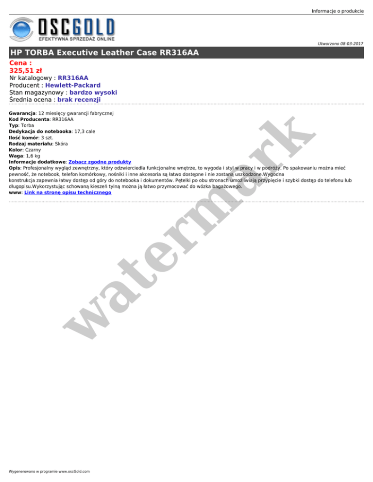 Informacje o produkcie Utworzono 08-03-2017 HP TORBA Executive Leather Case RR316AA Cena : 325,51 zł Nr katalogowy : RR316AA Producent : Hewlett-Packard Stan magazynowy : bardzo wysoki Średnia ocena : brak recenzji w at er m ar k Gwarancja: 12 miesięcy gwarancji fabrycznej Kod Producenta: RR316AA Typ: Torba Dedykacja do notebooka: 17,3 cale Ilość komór: 3 szt. Rodzaj materiału: Skóra Kolor: Czarny Waga: 1,6 kg Informacje dodatkowe: Zobacz zgodne produkty Opis: Profesjonalny wygląd zewnętrzny, który odzwierciedla funkcjonalne wnętrze, to wygoda i styl w pracy i w podróży. Po spakowaniu można mieć pewność, że notebook, telefon komórkowy, nośniki i inne akcesoria są łatwo dostępne i nie zostaną uszkodzone.Wygodna konstrukcja zapewnia łatwy dostęp od góry do notebooka i dokumentów. Pętelki po obu stronach umożliwiają przypięcie i szybki dostęp do telefonu lub długopisu.Wykorzystując schowaną kieszeń tylną można ją łatwo przymocować do wózka bagażowego. www: Link na stronę opisu technicznego Wygenerowano w programie www.oscGold.com