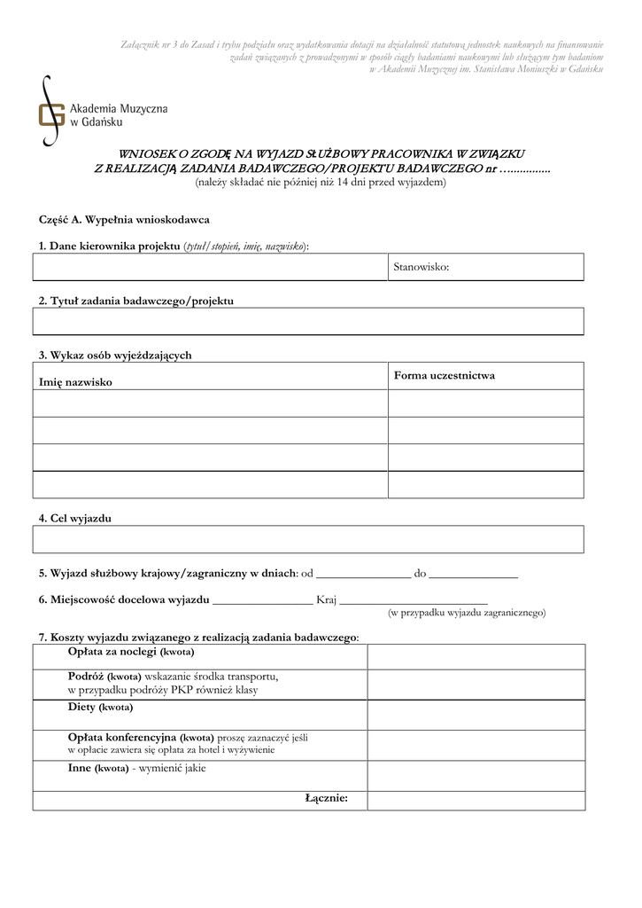 Załącznik nr 3 do Zasad i trybu podziału oraz wydatkowania dotacji na działalność statutową jednostek naukowych na finansowanie zadań związanych z prowadzonymi w sposób ciągły badaniami naukowymi lub służącym tym badaniom w Akademii Muzycznej im. Stanisława Moniuszki w Gdańsku WNIOSEK O ZGODĘ NA WYJAZD S ŁU ŻBOWY PRACOWNIKA W ZWI ĄZKU Z REALIZACJ Ą ZADANIA BADAWCZEGO/PROJEKTU BADAWCZEGO nr …............. (należy składać nie później niż 14 dni przed wyjazdem) Część A. Wypełnia wnioskodawca 1. Dane kierownika projektu (tytuł/stopień, imię, nazwisko): Stanowisko: 2. Tytuł zadania badawczego/projektu 3. Wykaz osób wyjeżdzających Forma uczestnictwa Imię nazwisko 4. Cel wyjazdu 5. Wyjazd służbowy krajowy/zagraniczny w dniach: od ________________ do _______________ 6. Miejscowość docelowa wyjazdu _________________ Kraj _________________________ (w przypadku wyjazdu zagranicznego) 7. Koszty wyjazdu związanego z realizacją zadania badawczego: Opłata za noclegi (kwota) Podróż (kwota) wskazanie środka transportu, w przypadku podróży PKP również klasy Diety (kwota) Opłata konferencyjna (kwota) proszę zaznaczyć jeśli w opłacie zawiera się opłata za hotel i wyżywienie Inne (kwota) - wymienić jakie Łącznie: Część B. Wypełnia pracownik Biura ds. Nauki i Rozwoju Kadr 1. Wyjazd służbowy wnioskowany był w ramach zgłoszonego zadania badawczego we wniosku tak /nie 2. Koszt wyjazdu pokryty będzie w wysokości …………………. zł: □ □ □ □ □ z dotacji na działalność statutową Wydziału ……… w roku ………….. (B/D) …………….……………… z rezerwy finansowej ……………………………………….) ze środków Narodowego Centrum Nauki (rodzaj konkursu i numer projektu…………………………………………………………………..……………...……..………..) ze środków MNiSW (rodzaj i numer projektu………………………………….…….………………….) inne niż wymienione źródło finansowania (jakie……………………………………………………………………………….……….……............) odmowa dofinansowania ze środków na finansowanie nauki Część C. Wypełnia Kierownik jednostki □ □ □ budżet Wydziału (nazwa wydziału)…………………………………………………………………….) budżet Rektora odmowa dofinansowania (środki własne) Data:…………………….. Podpis wyjeżdżającego* __________________________ Zgoda Kierownika Projektu (podpis i pieczęć) Zgoda pracownika Biura ds. Nauki i Rozwoju Kadr (podpis i pieczęć) Zgoda Kierownika Jednostki (podpis pieczęć)