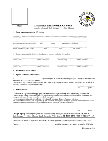 zdjęcie Deklaracja członkowska KS Korio siedziba biura: ul. Bażyńskiego 9, 10-066 Olsztyn 1. Dane personalne członka KS Korio: .................................................................................................................................................................... nazwisko i imię data i miejsce urodzenia ............................................................................................................................... ..................................... adres zamieszkania (kod, miejscowość, ulica, numer telefon domowy (lub kom.) .................................................................................................................................................................... miejsce nauki/pracy (nazwa szkoły: 2. adres, klasa, ew. telefon) Dane personalne Rodziców / Opiekunów: dotyczy osób niepełnoletnich ................................................................................, ............................................................................... nazwisko i imię nazwisko i imię telefon kontaktowy, telefon kontaktowy ................................................................................, ............................................................................... nazwisko i imię nazwisko i imię telefon kontaktowy, telefon kontaktowy 3. Kontaktowy adres e-mail: ……………………………………………………………………………. 4. Zgoda Rodziców / Opiekunów: Ja ........................................................... wyrażam zgodę na uczestniczenie mojego syna / mojej córki w zajęciach rekreacyjnych i sportowych KS Korio. Zobowiązuję się do dostarczenia zaświadczenia lekarza sportowego o stanie zdrowia pozwalającym na udział w zajęciach ogólnorozwojowo-sportowych. ........................................... data 5. podpis Zobowiązanie: Przyjmuję do wiadomości i podejmuję się przestrzegać opłat związanych z udziałem w treningach: - jednorazowa opłata wpisowa (30 zł.) jest kwotą na poczet ubezpieczenia uczestnika zajęć od ewentualnych następstw nieszczęśliwego wypadku w trakcie treningów - comiesięczna składka z tytułu udziału w treningach wpłacana do dn. 15 danego miesiąca Dni wolne od nauki szkolnej, dni świąteczne (tj. dni, w których nie odbywają się zajęcia sportowe) oraz nieobecność dziecka nie powodują zmniejszenia opłaty aż do momentu wypisania członka Klubu z listy członków ........................................... data podpis ------------------------------------------------------------------------------------------------------------------------------------------------------- Uwaga: wpłaty comiesięcznej składki członkowskiej należy dokonywać na konto: KS Korio, ul. Bażyńskiego 9, 10-066 Olsztyn: Bank Zachodni WBK S.A. nr 95 1090 2590 0000 0001 2259 4453 Potwierdzenie przyjęcia w poczet członków KS Korio (wypełnia uprawniony przedstawiciel Zarządu klubu): Z dniem………… ……………………………………… został/ła przyjęty/ta w poczet członków KS Korio Pieczątka, podpis
