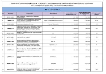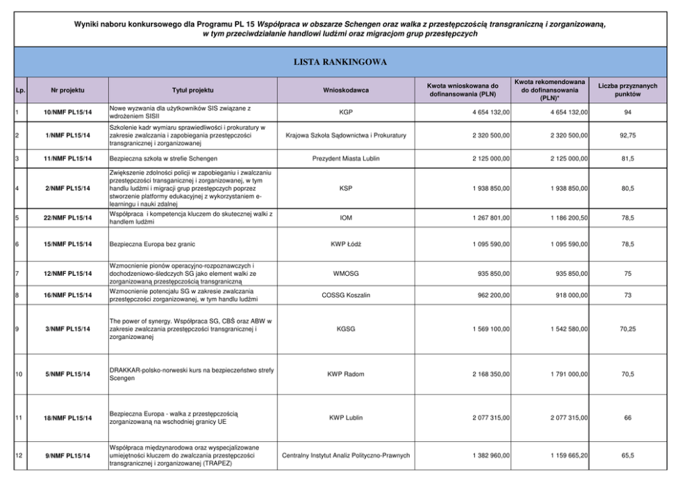 Wyniki naboru konkursowego dla Programu PL 15 Współpraca w obszarze Schengen oraz walka z przestępczością transgraniczną i zorganizowaną, w tym przeciwdziałanie handlowi ludźmi oraz migracjom grup przestępczych LISTA RANKINGOWA Lp. Nr projektu Tytuł projektu 1 10/NMF PL15/14 Nowe wyzwania dla użytkowników SIS związane z wdrożeniem SISII 2 1/NMF PL15/14 Szkolenie kadr wymiaru sprawiedliwości i prokuratury w zakresie zwalczania i zapobiegania przestępczości transgranicznej i zorganizowanej 3 11/NMF PL15/14 Bezpieczna szkoła w strefie Schengen 4 Wnioskodawca Kwota wnioskowana do dofinansowania (PLN) Kwota rekomendowana do dofinansowania (PLN)* Liczba przyznanych punktów KGP 4 654 132,00 4 654 132,00 94 Krajowa Szkoła Sądownictwa i Prokuratury 2 320 500,00 2 320 500,00 92,75 Prezydent Miasta Lublin 2 125 000,00 2 125 000,00 81,5 2/NMF PL15/14 Zwiększenie zdolności policji w zapobieganiu i zwalczaniu przestępczości transganicznej i zorganizowanej, w tym handlu ludźmi i migracji grup przestępczych poprzez stworzenie platformy edukacyjnej z wykorzystaniem elearningu i nauki zdalnej KSP 1 938 850,00 1 938 850,00 80,5 5 22/NMF PL15/14 Współpraca i kompetencja kluczem do skutecznej walki z handlem ludźmi IOM 1 267 801,00 1 186 200,50 78,5 6 15/NMF PL15/14 Bezpieczna Europa bez granic KWP Łódź 1 095 590,00 1 095 590,00 78,5 7 12/NMF PL15/14 Wzmocnienie pionów operacyjno-rozpoznawczych i dochodzeniowo-śledczych SG jako element walki ze zorganizowaną przestępczością transgraniczną WMOSG 935 850,00 935 850,00 75 8 16/NMF PL15/14 Wzmocnienie potencjału SG w zakresie zwalczania przestępczości zorganizowanej, w tym handlu ludźmi COSSG Koszalin 962 200,00 918 000,00 73 9 3/NMF PL15/14 The power of synergy. Współpraca SG, CBŚ oraz ABW w zakresie zwalczania przestępczości transgranicznej i zorganizowanej KGSG 1 569 100,00 1 542 580,00 70,25 10 5/NMF PL15/14 DRAKKAR-polsko-norweski kurs na bezpieczeństwo strefy Scengen KWP Radom 2 168 350,00 1 791 000,00 70,5 11 18/NMF PL15/14 Bezpieczna Europa - walka z przestępczością zorganizowaną na wschodniej granicy UE KWP Lublin 2 077 315,00 2 077 315,00 66 12 9/NMF PL15/14 Współpraca międzynarodowa oraz wyspecjalizowane umiejętności kluczem do zwalczania przestępczości transgranicznej i zorganizowanej (TRAPEZ) Centralny Instytut Analiz Polityczno-Prawnych 1 382 960,00 1 159 665,20 65,5 13 14 24/NMF PL15/14 Kompetencje bez granic 7/NMF PL15/14 Bezpieczeństwo w strefie Schengen - zwiększenie skuteczności działań funkcjonariuszy celnych z regionów Mazowsza i Pomorza Zachodniego w walce z przestępczością zorganizowaną Niezależny Samorządny Związek Zawodowy Policjantów Izba Celna - Warszawa 723 521,00 723 521,00 64,5 2 823 700,00 2 823 700,00 61,5 25 291 903,70 * dostępna alokacja - 34 010 185 PLN
