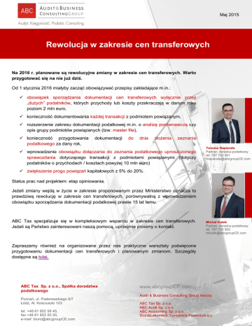 Maj 2015 Rewolucja w zakresie cen transferowych Na 2016 r. planowane są rewolucyjne zmiany w zakresie cen transferowych. Warto przygotować się na nie już dziś. Od 1 stycznia 2016 miałyby zacząć obowiązywać przepisy zakładające m.in.: obowiązek sporządzania dokumentacji cen transferowych wyłącznie przez „dużych” podatników, których przychody lub koszty przekraczają w danym roku poziom 2 mln euro, konieczność dokumentowania każdej transakcji z podmiotem powiązanym, rozszerzenie zakresu dokumentacji podatkowej m.in. o analizę porównawczą czy opis grupy podmiotów powiązanych (tzw. master file), konieczność przygotowania podatkowego za dany rok, dokumentacji do dnia złożenia zeznania wprowadzenie obowiązku dołączania do zeznania podatkowego uproszczonego sprawozdania dotyczącego transakcji z podmiotami powiązanymi (dotyczy podatników o przychodach / kosztach powyżej 10 mln euro) Tomasz Napierała Partner, doradca podatkowy tel. 797 720 901 [email protected] zwiększenie progu powiązań kapitałowych z 5% do 20%. Status prac nad projektem: etap opiniowania. Jeżeli zmiany wejdą w życie w zakresie proponowanym przez Ministerstwo oznacza to prawdziwą rewolucję w zakresie cen transferowych, porównywalną z wprowadzeniem obowiązku sporządzania dokumentacji podatkowej prawie 15 lat temu. ABC Tax specjalizuje się w kompleksowym wsparciu w zakresie cen transferowych. Jeżeli są Państwo zainteresowani naszą pomocą, uprzejmie prosimy o kontakt. Michał Kubik Partner, doradca podatkowy tel. 797 720 902 [email protected] Zapraszamy również na organizowane przez nas praktyczne warsztaty poświęcone przygotowaniu dokumentacji cen transferowych i planowanym zmianom. Szczegóły dostępne są tutaj. ABC Tax Sp. z o.o., Spółka doradztwa podatkowego Poznań, ul. Paderewskiego 6/7 Łódź, Al. Kościuszki 103 tel. +48 61 852 58 45, fax +48 61 853 50 20, e-mail: [email protected] www.abcgroupCE.com Audit & Business Consulting Group tworzą: ABC Tax Sp. z o.o. ABC Audit Sp. z o.o. ABC Accounting Sp. z o.o. Śron&Łakomecki Kancelaria Prawnicza s.c.