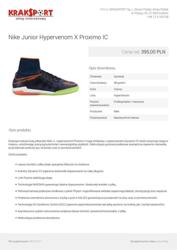 P.H.U. KRAKSPORT Sp.J. Zenon Piętak, Alicja Piętak Al.Pokoju 32, 31-564 Kraków +48 12 4140108 Nike Junior Hypervenom X Proximo IC Cena od: 395,00 PLN Opis słownikowy Cholewka Syntetyk Czas dostawy 48 godzin Kolor Czarny Linia HyperVenom Poziom zaawansowania Profesjonalne / meczowe Producent Nike Przeznaczenie Nawierzchnie halowe Opis produktu Dziecięce halowe buty piłkarskie Nike Jr. HypervenomX Proximo II mają cholewkę z wykończeniem Dynamic Fit, które utrzymuje stopę w miejscu, umożliwiając precyzyjną kontrolę i niewiarygodną szybkość. Niebrudząca gumowa podeszwa zewnętrzna zapewnia niezwykłą przyczepność podczas gry na boisku oraz w pomieszczeniach. Cechy produktu: Lepszy kontakt z piłką dzięki specjalnej fakturze na cholewce. Kołnierz Dynamic Fit zapewnia doskonałe dopasowanie na całej długości. Linki Flywire stabilizują stopę. Technologia NIKESKIN gwarantuje idealne dopasowanie i doskonały kontakt z piłką. Pełnowymiarowa podeszwa środkowa z pianki Phylon i wyprofilowana wkładka zapewniają lekkość, amortyzację oraz wsparcie. Podeszwa zewnętrzna stworzona z myślą o grze w hali (IC) gwarantuje przyczepność na ulicy oraz w pomieszczeniach. Technologia All Conditions Control (ACC) zapewnia optymalną kontrolę nad piłką zarówno na mokrej, jak i suchej nawierzchni. Asymetryczny system sznurowania zwiększa obszar kontroli i powierzchnię kontaktu z piłką. Niebrudząca podeszwa zewnętrzna. Plik wygenerowano: 08-03-2017 Oprogramowanie sklepu: AptusShop P.H.U. KRAKSPORT Sp.J. Zenon Piętak, Alicja Piętak Al.Pokoju 32, 31-564 Kraków +48 12 4140108 W odpowiednim dobraniu rozmiaru pomoże Ci tabela rozmiarów Nike. Warianty produktu 36.5 395,00 PLN 38 395,00 PLN Galeria Plik wygenerowano: 08-03-2017 Powered by TCPDF (www.tcpdf.org) Oprogramowanie sklepu: AptusShop