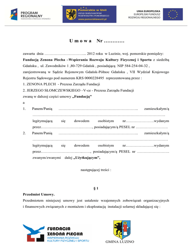 U m o w a Nr ………… zawarta dnia …………………………... 2012 roku w Luzinie, woj. pomorskie pomiędzy: Fundacją Zenona Plecha –Wspierania Rozwoju Kultury Fizycznej i Sportu z siedzibą Gdańsku , ul. Zawodników 1 ,80-729 Gdańsk , posiadającą NIP 584-254-04-32 , zarejestrowaną w Sądzie Rejonowym Gdańsk-Północ Gdańsku , VII Wydział Krajowego Rejestru Sądowego pod numerem KRS 0000228495 reprezentowaną przez : 1. ZENONA PLECH - Prezesa Zarządu Fundacji 2. JERZEGO SŁOMCZEWSKIEGO –V-ce - Prezesa Zarządu Fundacji zwaną w dalszej części umowy „Fundacją” a 1. Panem/Panią …………………………………………………….. zamieszkałym/ą …………………………………………………………………………………………. legitymującą się dowodem osobistym nr………………….wydanym przez………………………….………, posiadającym/ą PESEL nr ……………………. 2. Panem/Panią …………………………………………………….. zamieszkałym/ą …………………………………………………………………………………………… legitymującą się dowodem osobistym nr………………….wydanym przez……………………….…..……, posiadającym/ą PESEL nr ……………………. zwanym/zwanymi dalej „Użytkującym”, następującej treści : §1 Przedmiot Umowy. Przedmiotem niniejszej umowy jest ustalenie wzajemnych zobowiązań organizacyjnych i finansowych związanych z montażem i eksploatacją instalacji solarnej składającej się : GMINA LUZINO z systemu kolektorów słonecznych, podgrzewacza wody i osprzętu instalacyjnego w budynku mieszkalnym Użytkującego , wg realizowanego projektu „Czyste powietrze gminy Luzino”,- wspieranego dotacją Zarządu Województwa Pomorskiego zgodnie z uchwałą nr 1127/78/11 z dnia 15/09/2011r. ze środków Unii Europejskiej w ramach Regionalnego Programu Operacyjnego dla Województwa Pomorskiego na lata 2007-2013 działanie 5.4. Rozwój energetyki opartej na źródłach odnawialnych. §2 Określenie warunków organizacyjnych i wykonawczych. 1. Użytkujący oświadcza, że posiada prawo własności/współwłasności lub posiada inny tytuł prawny do dysponowania nieruchomością zabudowaną / budynkiem mieszkalnym położoną w obrębie geodezyjnym …………………………, działka nr………………….w miejscowości …………………….. gmina Luzino, opisanej w Księdze Wieczystej prowadzonej przez Sąd Rejonowy Wydział Ksiąg Wieczystych w Wejherowie pod nr …………………………………………… . 2. Użytkujący wyraża zgodę na zajęcie przez Fundację części dachu budynku mieszkalnego położonego na nieruchomości określonej w ust.1 z przeznaczeniem na zakup i zainstalowanie instalacji solarnej oraz część wewnętrzną budynku niezbędną do zainstalowania pozostałej części zestawu - koniecznej dla prawidłowego funkcjonowania całości. 3. Zestaw, o którym mowa w ust.2 będzie się składał z następujących elementów: 1) kolektorów słonecznych - ………………….. szt., 2) uchwytów dachowych, 3) zestawu przyłączeniowego kolektora, 4) podgrzewacza pojemnościowego - ………………, 5) zespołu pompowo - sterowniczego, 6) naczynia przeponowego z glikolem 7) naczynia przeponowego CWU, 8) armatury odcinającej, 9) rur łączących i izolacji, skompletowanego ilościowo wg projektu technicznego dla obiektu opisanego w pkt.1. GMINA LUZINO 4. Użytkujący oświadcza, że budynek o którym mowa w ust.1 posiada warunki techniczne umożliwiające montaż zestawu solarnego, a w szczególności: 1) instalację zimnej wody, 2) instalację elektryczną, 3) wolną powierzchnię wewnątrz budynku umożliwiającą montaż wymiennika cieplnego i urządzeń sterujących. 5. Użytkujący oświadcza, że jest w pełni świadomy możliwych utrudnień i niedogodności związanych z prowadzeniem prac w budynku, o którym mowa w ust.1 i nie będzie dochodził żadnych roszczeń z tego tytułu. 6. W ramach wewnętrznych prac instalacyjnych przewiduje się uzupełnienie odbitych tynków wewnętrznych, uszczelnienie otworów przejść rurowych oraz uzupełnienie brakującej powłoki malarskiej w obrębie przebić. Prace odtworzeniowe w budynku nie są przedmiotem zadania realizowanego przez Fundację. W szczególności montaż instalacji solarnej kończy się na podłączeniu do instalacji wewnętrznej Użytkownika, w sposób zapewniający prawidłowe funkcjonowanie całego systemu . 7. Użytkujący zobowiązuje się, we własnym zakresie i na własny koszt, do wykonania prac wykończeniowo-estetycznych, wymaganych w następstwie prac montażowych zestawu solarnego takich jak: malowanie, drobne prace kosmetyczne, przywracające estetykę budynku w zakresie nieobjętym ust.6. 8. Fundacja zobowiązuje się do przeprowadzenia prac montażowych instalacji solarnych będących przedmiotem niniejszej umowy z jak najmniejszym, możliwym przy tego rodzaju pracach - uszkodzeniem dachu i budynku wewnątrz 9. Użytkujący ponadto wyraża zgodę na udostępnianie nieruchomości określonej w ust.1 w celu przeprowadzenia niezbędnych prac budowlanych związanych z montażem, ale także w trakcie eksploatacji instalacji solarnej przez okres trwania umowy. 10. Fundacja, w imieniu Użytkującego, zobowiązuje się do prowadzenia niezbędnych spraw związanych z realizacją umowy o dofinansowanie z Urzędem Marszałkowskim wg. wniosku WND-RPPM.05.04.00-00-012/10 - jej promocją, monitoringiem i rozliczeniem. GMINA LUZINO §3 Określenie warunków własnościowych i eksploatacyjnych. 1. Fundacja, wraz z Partnerem projektu - Gminą Luzino, zabezpieczy realizację celu projektu tj. zgodnie z przepisami Ustawy Prawo Zamówień Publicznych, wyłoni Firmę Zarządzającą Projektem, wyłoni dostawcę i wykonawcę montażu instalacji solarnych, ustali harmonogram prac montażowych, będzie
