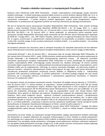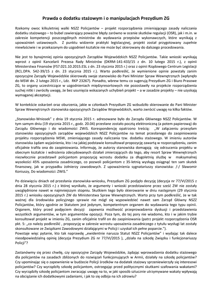 Prawda o dodatku stażowym i o manipulacjach Prezydium ZG Rzekomy owoc kilkuletniej walki NSZZ Policjantów – projekt rozporządzenia zmieniającego zasady naliczania dodatku stażowego – to bubel zawierający poważne błędy zarówno w ocenie skutków regulacji (OSR), jak i m.in. w zakresie kompetencji poszczególnych ministrów do wydawania przepisów wykonawczych, które wynikają z upoważnień ustawowych. Z punktu widzenie praktyki legislacyjnej, projekt został przygotowany zupełnie niewłaściwie i w przekazanym do uzgodnień kształcie nie może być skierowany do dalszego procedowania. Nie jest to bynajmniej opinia opozycyjnych Zarządów Wojewódzkich NSZZ Policjantów. Takie wnioski wynikają wprost z opinii Kancelarii Prezesa Rady Ministrów (DKRM-141-433/15 z dn. 10 lutego 2015 r.), z opinii Ministerstwa Finansów (FS7.021.10.2015.ESL z dn. 23 stycznia 2015 r.) oraz z opinii Rządowego Centrum Legislacji (RCL.DPA. 542-39/15 z dn. 23 stycznia 2015 r.). Warto podkreślić, że wymienione opinie powstały zanim opozycyjne Zarządy Wojewódzkie skierowały swoje stanowisko do Pani Minister Spraw Wewnętrznych (wpłynęło do MSW dn. 2 lutego 2015 r., Ldz. RKP 23267). Ponadto, wbrew temu co sugerują Prezydium ZG i Biuro Prasowe ZG, to organy uczestniczące w uzgodnieniach międzyresortowych nie pozostawiły na projekcie rozporządzenia suchej nitki i zwróciły uwagę, że bez usunięcia wskazanych uchybień projekt – a w zasadzie projekty – nie uzyskają wymaganej akceptacji. W kontekście oskarżeń oraz oburzenia, jakie w członkach Prezydium ZG wzbudziło skierowanie do Pani Minister Spraw Wewnętrznych stanowiska opozycyjnych Zarządów Wojewódzkich, warto zwrócić uwagę na kilka faktów. „Stanowisko-Wniosek” z dnia 19 stycznia 2015 r. adresowane było do Zarządu Głównego NSZZ Policjantów. W tym samym dniu (19 stycznia 2015 r., godz. 20.04) przesłane zostało pocztą elektroniczną (a potem papierową) do Zarządu Głównego i do wiadomości ZWiS. Korespondencję opatrzono treścią: „W załączeniu przesyłam stanowisko opozycyjnych zarządów wojewódzkich NSZZ Policjantów na temat przesłanego do zaopiniowania projektu rozporządzenia MSW, zmieniającego zasady naliczania tzw. dodatku stażowego. W imieniu autorów stanowiska żądam wyjaśnienia, kto i na jakiej podstawie konsultował propozycję zawartą w rozporządzeniu, zanim oficjalnie trafiła ona do zaopiniowania. Informuję, że autorzy stanowiska domagają się odrzucenia projektu w obecnym kształcie i wdrożenia zdecydowanych działań zmierzających do tego, aby resort Spraw Wewnętrznych niezwłocznie przedstawił policjantom propozycję wzrostu dodatku za długoletnią służbę w maksymalnej wysokości 45% uposażenia zasadniczego, co pozwoli policjantom z 35-letnią wysługą osiągnąć ten sam skutek finansowy, jak w przypadku żołnierzy zawodowych. Z upoważnienia sygnatariuszy stanowiska: /-/ Sławomir Koniuszy, Do wiadomości: ZWiS.” Po dziewięciu dniach od przesłania stanowiska-wniosku, Prezydium ZG podjęło decyzję (decyzja nr 77/VI/2015 z dnia 28 stycznia 2015 r.) z której wynikało, że argumenty i wnioski przedstawione przez sześć ZW nie zostały uwzględnione nawet w najmniejszym stopniu. Skutkiem tego było skierowanie w dniu następnym (29 stycznia 2015 r.) wniosku opozycyjnych ZW do Ministerstwa Spraw Wewnętrznych. Warto przy tym podkreślić, że w tak ważnej dla środowiska policyjnego sprawie nie mógł się wypowiedzieć nawet sam Zarząd Główny NSZZ Policjantów, który zgodnie ze Statutem jest jedynym, kompetentnym organem do wydawania tego typu opinii. Organem, który przed podjęciem decyzji zapewnia możliwość przeprowadzenia dyskusji i przedstawienia wszystkich argumentów, w tym argumentów opozycji. Poza tym, do tej pory nie wiadomo, kto i w jakim trybie konsultował projekt w imieniu ZG, zanim oficjalnie trafił on do zaopiniowania (patrz projekt rozporządzenia OSR pkt. 5: „co należy podkreślić , propozycję w zakresie wzrostu uposażenia zasadniczego z tytułu wysługi lat zostały skonsultowane ze Związkami Zawodowymi działającymi w Policji i uzyskał ich pełne poparcie.”). Powstaje więc pytanie, kto tak naprawdę „ewidentnie narusza Statut NSZZ Policjantów” i wydając tak dalece nieodpowiedzialną opinię (decyzja Prezydium ZG nr 77/VI/2015 ), „działa na szkodę Związku i funkcjonariuszy Policji”? Zastanówmy się przez chwilę, czy opozycyjne Zarządy Wojewódzkie, żądając wprowadzenia dodatku stażowego dla policjantów na zasadach zbliżonych do rozwiązań funkcjonujących w Armii, działały na szkodę policjantów? Czy upominając się o zapewnienie w budżecie Policji środków na dodatek stażowy sprzeniewierzyły się interesowi policjantów? Czy wyrządziły szkodę policjantom, ostrzegając przed politycznymi skutkami szafowania wakatami? Czy wyrządziły szkodę policjantom zwracając uwagę na to, w jaki sposób sztucznie utrzymywane wakaty wpływają na obciążanie ich dodatkowymi zadaniami, i jak to się odbija na ich zdrowiu? Zastanówmy się również nad tym, co mają robić opozycyjne Zarządy Wojewódzkie, reprezentujące interes blisko 40 tys. polskich policjantów w sytuacji, kiedy ich opinie są ignorowane i kiedy w sprawach ważnych dla środowiska nie są zwoływane posiedzenia ZG? Tryb administracyjny, na podstawie którego skierowano wniosek do Pani Minister Piotrowskiej w żadnym stopniu nie koliduje ze Statutem NSZZ Policjantów. Trzeba nie lada hipokryzji, żeby mając tyle na sumieniu, wytykać opozycyjnym ZW łamanie Statutu i działanie na szkodę policjantów. Równie zaskakujące jest to, w jaki sposób Pan Przewodniczący i jego ekipa usiłowali przestraszyć policjantów wizją dramatycznych konsekwencji skierowania przez opozycjonistów wniosku do Pani Minister Piotrowskiej. Na całe szczęście Biuro Prasowe ZG w ostatnim akapicie (patrz „Prowokacja czy sabotaż”) 