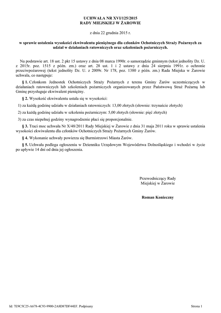 UCHWAŁA NR XVI/125/2015 RADY MIEJSKIEJ W ŻAROWIE z dnia 22 grudnia 2015 r. w sprawie ustalenia wysokości ekwiwalentu pieniężnego dla członków Ochotniczych Straży Pożarnych za udział w działaniach ratowniczych oraz szkoleniach pożarniczych. Na podstawie art. 18 ust. 2 pkt 15 ustawy z dnia 08 marca 1990r. o samorządzie gminnym (tekst jednolity Dz. U. z 2015r. poz. 1515 z późn. zm.) oraz art. 28 ust. 1 i 2 ustawy z dnia 24 sierpnia 1991r. o ochronie przeciwpożarowej (tekst jednolity Dz. U. z 2009r. Nr 178, poz. 1380 z późn. zm.) Rada Miejska w Żarowie uchwala, co następuje: § 1. Członkom Jednostek Ochotniczych Straży Pożarnych z terenu Gminy Żarów uczestniczących w działaniach ratowniczych lub szkoleniach pożarniczych organizowanych przez Państwową Straż Pożarną lub Gminę przysługuje ekwiwalent pieniężny. § 2. Wysokość ekwiwalentu ustala się w wysokości: 1) za każdą godzinę udziału w działaniach ratowniczych: 13,00 złotych (słownie: trzynaście złotych) 2) za każdą godzinę udziału w szkoleniu pożarniczym: 5,00 złotych (słownie: pięć złotych) 3) za czas niepełnej godziny wynagrodzenie płaci się proporcjonalnie. § 3. Traci moc uchwała Nr X/48/2011 Rady Miejskiej w Żarowie z dnia 31 maja 2011 roku w sprawie ustalenia wysokości ekwiwalentu dla członków Ochotniczych Straży Pożarnych Gminy Żarów. § 4. Wykonanie uchwały powierza się Burmistrzowi Miasta Żarów. § 5. Uchwała podlega ogłoszeniu w Dzienniku Urzędowym Województwa Dolnośląskiego i wchodzi w życie po upływie 14 dni od dnia jej ogłoszenia. Przewodniczący Rady Miejskiej w Żarowie Roman Konieczny Id: 7E9C5C25-A678-4C93-9900-2A8D87DF44EF. Podpisany Strona 1 Uzasadnienie Na podstawie art. 28 ust. 1 i 2 ustawy z dnia 24 sierpnia 1991 roku o ochronie przeciwpożarowej (tekst jednolity Dz. U. z 2009r. Nr 178, poz. 1380 z późn. zm.) członek Ochotniczej Straży Pożarnej, który uczestniczył w działaniu ratowniczym lub szkoleniu pożarniczym organizowanym przez Państwową Straż Pożarną lub Gminę otrzymuje ekwiwalent pieniężny. Wysokość ekwiwalentu ustala rada w drodze uchwały. Wysokość ekwiwalentu nie może przekroczyć 1/175 przeciętnego wynagrodzenia ogoszonego przez Prezesa GUS, przed dniem ustalenia ekwiwalentu, za każdą godzinę udziału w działaniu ratowniczym lub szkoleniu pożarniczym. Ekwiwalent jest wypłacany z budżetu gminy. Ponadto Zarząd Oddziału Miejsko - Gminnego Związku OSP RP w Żarowie zwrócił się z prośbą do Burmistrza Miasta Żarów o podwyższenie do 13,00 złotych ekwiwalentu dla członków OSP za każdą godzinę udziału w działaniach ratowniczych. Natomiast wysokość ekwiwalentu za udział strażaków ochotników w szkoleniach pożarniczych pozostaje na tym samym poziomie tj. 5,00 złotych. W związku z powyższym zasadne jest podjęcie przedmiotpowej uchwały ustalającej wysokość ekwiwalentu pieniężnego dla członków Ochotniczych Straży Pożarnych w Gminie Żarów. Sporządził: Michał Domański Inspektor ds. wojskowości, obrony cywilnej, bezpieczeństwa i porządku publicznego. Id: 7E9C5C25-A678-4C93-9900-2A8D87DF44EF. Podpisany Strona 1