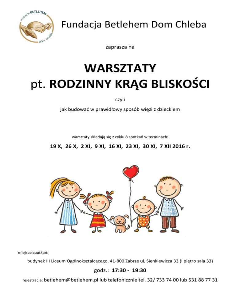 Fundacja Betlehem Dom Chleba zaprasza na WARSZTATY pt. RODZINNY KRĄG BLISKOŚCI czyli jak budować w prawidłowy sposób więzi z dzieckiem warsztaty składają się z cyklu 8 spotkań w terminach: 19 X, 26 X, 2 XI, 9 XI, 16 XI, 23 XI, 30 XI, 7 XII 2016 r. miejsce spotkań: budynek III Liceum Ogólnokształcącego, 41-800 Zabrze ul. Sienkiewicza 33 (I piętro sala 33) godz.: 17:30 - 19:30 rejestracja: [email protected] lub telefonicznie tel. 32/ 733 74 00 lub 531 88 77 31