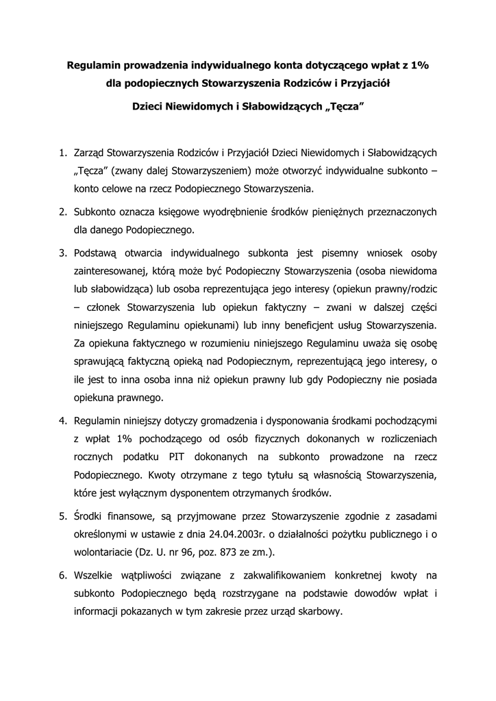 Regulamin prowadzenia indywidualnego konta dotyczącego wpłat z 1% dla podopiecznych Stowarzyszenia Rodziców i Przyjaciół Dzieci Niewidomych i Słabowidzących „Tęcza” 1. Zarząd Stowarzyszenia Rodziców i Przyjaciół Dzieci Niewidomych i Słabowidzących „Tęcza” (zwany dalej Stowarzyszeniem) może otworzyć indywidualne subkonto – konto celowe na rzecz Podopiecznego Stowarzyszenia. 2. Subkonto oznacza księgowe wyodrębnienie środków pieniężnych przeznaczonych dla danego Podopiecznego. 3. Podstawą otwarcia indywidualnego subkonta jest pisemny wniosek osoby zainteresowanej, którą może być Podopieczny Stowarzyszenia (osoba niewidoma lub słabowidząca) lub osoba reprezentująca jego interesy (opiekun prawny/rodzic – członek Stowarzyszenia lub opiekun faktyczny – zwani w dalszej części niniejszego Regulaminu opiekunami) lub inny beneficjent usług Stowarzyszenia. Za opiekuna faktycznego w rozumieniu niniejszego Regulaminu uważa się osobę sprawującą faktyczną opieką nad Podopiecznym, reprezentującą jego interesy, o ile jest to inna osoba inna niż opiekun prawny lub gdy Podopieczny nie posiada opiekuna prawnego. 4. Regulamin niniejszy dotyczy gromadzenia i dysponowania środkami pochodzącymi z wpłat 1% pochodzącego od osób fizycznych dokonanych w rozliczeniach rocznych podatku PIT dokonanych na subkonto prowadzone na rzecz Podopiecznego. Kwoty otrzymane z tego tytułu są własnością Stowarzyszenia, które jest wyłącznym dysponentem otrzymanych środków. 5. Środki finansowe, są przyjmowane przez Stowarzyszenie zgodnie z zasadami określonymi w ustawie z dnia 24.04.2003r. o działalności pożytku publicznego i o wolontariacie (Dz. U. nr 96, poz. 873 ze zm.). 6. Wszelkie wątpliwości związane z zakwalifikowaniem konkretnej kwoty na subkonto Podopiecznego będą rozstrzygane na podstawie dowodów wpłat i informacji pokazanych w tym zakresie przez urząd skarbowy. 7. Środki finansowe zgromadzone na subkoncie mogą być wykorzystane wyłącznie na cele działalności pożytku publicznego, w tym na następujące cele: a. leczenie Podopiecznego, zgodnie z celami statutowymi Stowarzyszenia, w tym: zakup leków, opiekę medyczną, usługi medyczne, pielęgnacyjne; b. rehabilitację Podopiecznego, w tym: usługi rehabilitacyjne, zakup sprzętu rehabilitacyjnego; c. dojazd Podopiecznego na rehabilitację do ośrodków prowadzonych przez Stowarzyszenie; d. pobyt Podopiecznego w ośrodkach rehabilitacyjno-edukacyjno-leczniczych prowadzonych przez Stowarzyszenie, w tym: koszt posiłków, koszt usług pielęgnacyjnych oraz innych form pomocy/opieki oferowanych w w/w placówkach związanych z leczeniem, rehabilitacją, edukacją i opieką nad Podopiecznym; e. udział Podopiecznego w turnusach rehabilitacyjnych organizowanych przez Stowarzyszenie; f. inne świadczenia i usługi, które wynikają z treści ustawy o z dnia 12.03.2004r. o pomocy społecznej, a które może lub powinien otrzymywać Podopieczny w związku ze swoją chorobą/niepełnosprawnością, będących jednocześnie celem działania Stowarzyszenia, a których poniesienie zaakceptuje Zarząd Stowarzyszenia. 8. Do założenia subkonta dla wpłat 1% konieczne jest złożenie następujących dokumentów: a. wniosku o otwarcie subkonta (wzór wniosku stanowi Załącznik nr 1 do niniejszego Regulaminu), b. zaświadczenia lekarskiego potwierdzającego chorobę/niepełnosprawność Podopiecznego, dla którego zakładane jest subkonto, o ile takie zaświadczenie nie znajduje się a aktach Stowarzyszenia, c. pisemnej zgody na przetwarzanie danych osobowych, konieczne do prowadzenia subkonta, d. podpisanego Regulaminu - co oznacza zobowiązanie Podopiecznego lub jego opiekuna do jego przestrzegania. 9. Otwarcie subkonta następuje po otrzymaniu przez Stowarzyszenie dokumentów opisanych powyżej. 10. Stowarzyszenia prowadzi subkonto wg poniższych zasad: a. imiennie - pod imieniem i nazwiskiem Podopiecznego, b. jawnie - wpisuje i udostępnia Podopiecznemu lub jego opiekunowi informacje: o darczyńcach, kwotach przekazanych, datach wpłat oraz kwotach faktur dokumentujących wypływ środków z subkonta, c. bez oprocentowania. 11. Stowarzyszenie przeznacza 10% sumy uzyskanej z wpłat 1% dotyczących konkretnego Podopiecznego na działalność pożytku publicznego wspólną wszystkim podopiecznym. 12. Informację o stanie subkonta Podopieczny lub jego opiekun może otrzymać po złożeniu pisemnego wniosku w terminie 5 dni roboczych od dnia jego złożenia. 13. Zgromadzone na subkoncie środki finansowe są dostępne dla Podopiecznego lub jego opiekuna na podstawie następujących dokumentów dostarczonych do Stowarzyszenia: a. oryginału faktury (rachunku) obejmującej wyłącznie wydatki podlegające finansowaniu z subkonta, zgodnie z punktem 6, wystawionej na Stowarzyszenie, która w uwagach musi mieć zamieszczone imię i nazwisko Podopiecznego. Faktura (rachunek) musi być opisana przez Podopiecznego lub jego opiekuna (np. „środki medyczne z tej faktury odebrałam i przeznaczyłam na leczenie - imię i nazwisko Podopiecznego”), b. oryginału innego dokumentu niż opisany w ust. a) (np. biletu za przejazd komunikacyjny, itp.) potwierdzającego poniesienie wyłącznie wydatku podlegającego finansowaniu z subkonta, zgodnie z punktem 6. Dokument powinien być opisany przez Podopiecznego lub jego opiekuna. c. pisemnego wniosku o wypłatę środków z subkonta w oparciu o dokumenty wymienione pod lit. a i b (wzór wniosku o wypłatę środków z subkonta stanowi Załącznik nr 2 do niniejszego Regulaminu); 14. Wypłata środków z subkonta następuje po dokonanej przez Stowarzyszenie weryfikacji złożonych dokumentów. Stowarzyszenie jest uprawnione, przed wypłatą środków, do zażądania od Podopiecznego lub jego opiekuna dodatkowych dokumentów lub wyjaśnień umożliwiających sprawdzenie, czy wydatkowane środki objęte wnioskiem o refundację z subkonta zostały przeznaczone na cel
