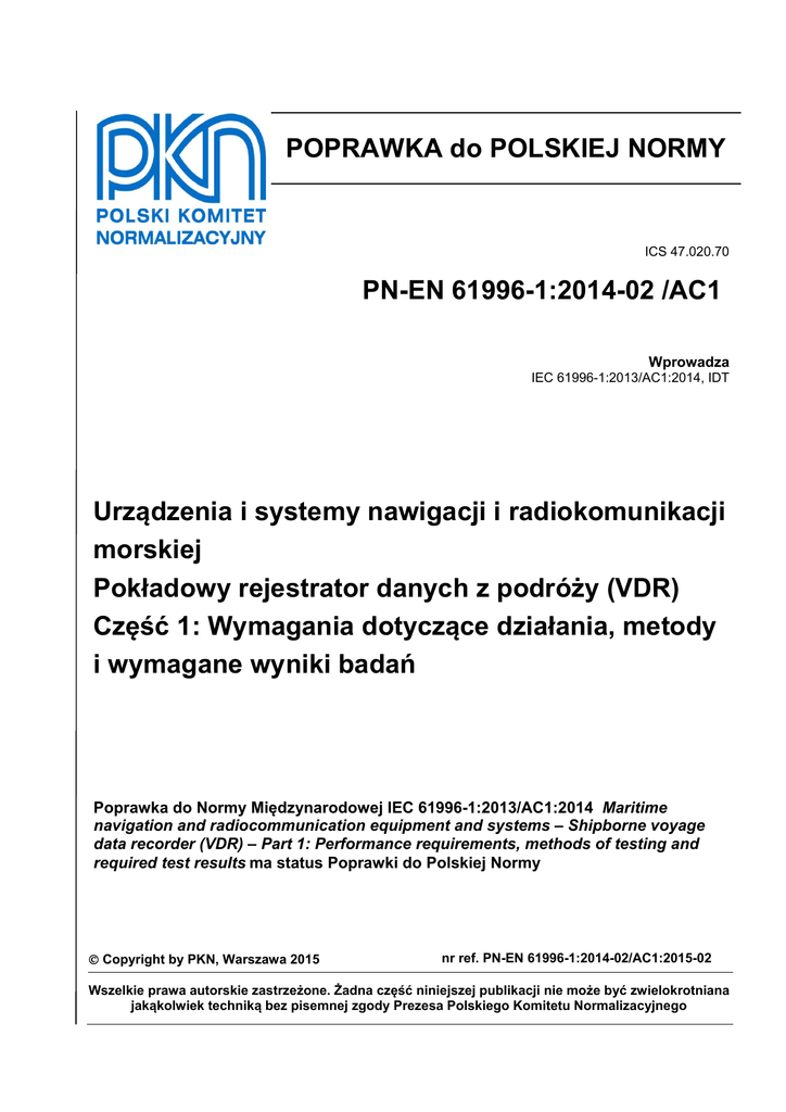 POPRAWKA do POLSKIEJ NORMY ICS 47.020.70 PN-EN 61996-1:2014-02 /AC1 Wprowadza IEC 61996-1:2013/AC1:2014, IDT Urządzenia i systemy nawigacji i radiokomunikacji morskiej Pokładowy rejestrator danych z podróży (VDR) Część 1: Wymagania dotyczące działania, metody i wymagane wyniki badań Poprawka do Normy Międzynarodowej IEC 61996-1:2013/AC1:2014 Maritime navigation and radiocommunication equipment and systems – Shipborne voyage data recorder (VDR) – Part 1: Performance requirements, methods of testing and required test results ma status Poprawki do Polskiej Normy Copyright by PKN, Warszawa 2015 nr ref. PN-EN 61996-1:2014-02/AC1:2015-02 Wszelkie prawa autorskie zastrzeżone. Żadna część niniejszej publikacji nie może być zwielokrotniana jakąkolwiek techniką bez pisemnej zgody Prezesa Polskiego Komitetu Normalizacyjnego PN-EN 61996-1:2014-02/AC1:2015-02 Przedmowa krajowa Niniejsza poprawka została zatwierdzona przez Prezesa PKN dnia 23 lutego 2015 r. Komitetem krajowym odpowiedzialnym za poprawkę jest KT nr 177 ds. Projektowania i Produkcji Uzbrojenia i Sprzętu Wojskowego. Istnieje możliwość przetłumaczenia poprawki na język polski na wniosek zainteresowanych środowisk. Decyzję podejmuje właściwy Komitet Techniczny. W sprawach merytorycznych dotyczących treści normy można zwracać się do właściwego Komitetu Technicznego lub właściwej Rady Sektorowej PKN, kontakt: www.pkn.pl Nota uznaniowa Poprawka do Normy Międzynarodowej IEC 61996-1:2013/AC1:2014, przyjęta przez CENELEC decyzją Rady Technicznej, została uznana przez PKN za Poprawkę do Polskiej Normy PN-EN 61996-1:2014-02/AC1:2015-02. 2 IEC 61996-1 (Second edition – 2013) Maritime navigation and radiocommunication equipment and systems – Shipborne voyage data recorder (VDR) – Part 1: Performance requirements, methods of testing and required test results CORRIGENDUM 1 Annex A IEC 61162 sentence formats th Replace, in Table A.1, 8 row, in the last column "ACMa" by "ACNa". February 2014