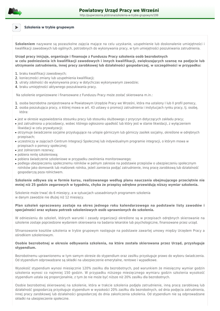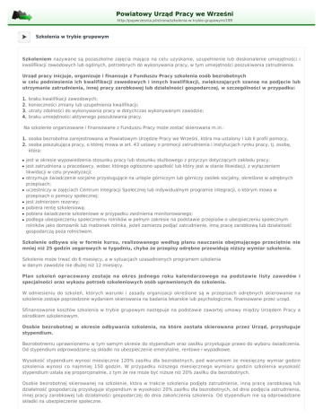 Powiatowy Urząd Pracy we Wrześni http://pupwrzesnia.pl/strona/szkolenia-w-trybie-grupowym/199 Szkolenia w trybie grupowym Szkoleniem nazywane są pozaszkolne zajęcia mające na celu uzyskanie, uzupełnienie lub doskonalenie umiejętności i kwalifikacji zawodowych lub ogólnych, potrzebnych do wykonywania pracy, w tym umiejętności poszukiwania zatrudnienia. Urząd pracy inicjuje, organizuje i finansuje z Funduszu Pracy szkolenia osób bezrobotnych w celu podniesienia ich kwalifikacji zawodowych i innych kwalifikacji, zwiększających szansę na podjęcie lub utrzymanie zatrudnienia, innej pracy zarobkowej lub działalności gospodarczej, w szczególności w przypadku: 1. 2. 3. 4. braku kwalifikacji zawodowych; konieczności zmiany lub uzupełnienia kwalifikacji; utraty zdolności do wykonywania pracy w dotychczas wykonywanym zawodzie; braku umiejętności aktywnego poszukiwania pracy. Na szkolenie organizowane i finansowane z Funduszu Pracy może zostać skierowana m.in.: 1. osoba bezrobotna zarejestrowana w Powiatowym Urzędzie Pracy we Wrześni, która ma ustalony I lub II profil pomocy, 2. osoba poszukująca pracy, o której mowa w art. 43 ustawy o promocji zatrudnienia i instytucjach rynku pracy, tj. osobę, która: ● ● ● ● ● ● ● ● jest w okresie wypowiedzenia stosunku pracy lub stosunku służbowego z przyczyn dotyczących zakładu pracy; jest zatrudniona u pracodawcy, wobec którego ogłoszono upadłość lub który jest w stanie likwidacji, z wyłączeniem likwidacji w celu prywatyzacji; otrzymuje świadczenie socjalne przysługujące na urlopie górniczym lub górniczy zasiłek socjalny, określone w odrębnych przepisach; uczestniczy w zajęciach Centrum Integracji Społecznej lub indywidualnym programie integracji, o którym mowa w przepisach o pomocy społecznej; jest żołnierzem rezerwy; pobiera rentę szkoleniową; pobiera świadczenie szkoleniowe w przypadku zwolnienia monitorowanego; podlega ubezpieczeniu społecznemu rolników w pełnym zakresie na podstawie przepisów o ubezpieczeniu społecznym rolników jako domownik lub małżonek rolnika, jeżeli zamierza podjąć zatrudnienie, inną pracę zarobkową lub działalność gospodarczą poza rolnictwem. Szkolenie odbywa się w formie kursu, realizowanego według planu nauczania obejmującego przeciętnie nie mniej niż 25 godzin zegarowych w tygodniu, chyba że przepisy odrębne przewidują niższy wymiar szkolenia. Szkolenie może trwać do 6 miesięcy, a w sytuacjach uzasadnionych programem szkolenia w danym zawodzie nie dłużej niż 12 miesięcy. Plan szkoleń opracowany zostaje na okres jednego roku kalendarzowego na podstawie listy zawodów i specjalności oraz wykazu potrzeb szkoleniowych osób uprawnionych do szkolenia. W odniesieniu do szkoleń, których warunki i zasady organizacji określone są w przepisach odrębnych skierowanie na szkolenie zostaje poprzedzone wydaniem skierowania na badania lekarskie lub psychologiczne, finansowane przez urząd. Sfinansowanie kosztów szkolenia w trybie grupowym następuje na podstawie zawartej umowy między Urzędem Pracy a ośrodkiem szkoleniowym. Osobie bezrobotnej w okresie odbywania szkolenia, na które została skierowana przez Urząd, przysługuje stypendium. Bezrobotnemu uprawnionemu w tym samym okresie do stypendium oraz zasiłku przysługuje prawo do wyboru świadczenia. Od stypendium odprowadzane są składki na ubezpieczenie emerytalne, rentowe i wypadkowe. Wysokość stypendium wynosi miesięcznie 120% zasiłku dla bezrobotnych, pod warunkiem że miesięczny wymiar godzin szkolenia wynosi co najmniej 150 godzin. W przypadku niższego miesięcznego wymiaru godzin szkolenia wysokość stypendium ustala się proporcjonalnie, z tym że nie może być niższe niż 20% zasiłku dla bezrobotnych. Osobie bezrobotnej skierowanej na szkolenie, która w trakcie szkolenia podjęła zatrudnienie, inną pracę zarobkową lub działalność gospodarczą przysługuje stypendium w wysokości 20% zasiłku dla bezrobotnych, od dnia podjęcia zatrudnienia, innej pracy zarobkowej lub działalności gospodarczej do dnia zakończenia szkolenia. Od stypendium nie są odprowadzane składki na ubezpieczenie społeczne. Osobie poszukującej pracy w okresie odbywania szkolenia, na które została skierowana przez urząd nie przysługuje stypendium. W okresie odbywania szkolenia osoba zobowiązuje się do regularnego uczęszczania na zajęcia szkoleniowe, systematycznego realizowania programu szkolenia, przestrzegania regulaminu obowiązującego w instytucji szkoleniowej oraz ukończenia szkolenia w terminie wskazanym w programie szkolenia. W przypadku nieobecności na zajęciach szkoleniowych osoba uczestnicząca w szkoleniu zobowiązana jest do każdorazowego usprawiedliwienia nieobecności na zajęciach szkoleniowych poprzez przedkładanie dokumentu usprawiedliwiającego nieobecność na obowiązującym druku ZUS ZLA. W przypadku nieobecności na zajęciach szkoleniowych osoba uczestnicząca w szkoleniu zobowiązana jest do zawiadomienia Urzędu o niezdolności do pracy w terminie 2 dni od dnia wystawienia zaświadczenia na obowiązującym druku ZUS ZLA oraz dostarczenia tego zaświadczenia w terminie 7 dni od dnia jego wystawienia. Osoba bezrobotna zachowuje prawo do stypendium za okres udokumentowanej niezdolności do pracy wskutek choroby, pod warunkiem przedstawienia zaświadczenia lekarskiego wystawionego na druku ZUS ZLA. Kontakt telefoniczny: (61) 640-35-47, 55 Podstawa prawna: 1. Art. 40, 41, 43 ustawy z dnia 20 kwietnia 2004 r. o promocji zatrudnienia i instytucjach rynku pracy (Dz. U. z 2015 r. poz 149) 2. Rozporządzenie Ministra Pracy i Polityki Społecznej z dnia 18 sierpnia 2009 r. w sprawie szczegółowego trybu przyznawania zasiłku dla bezrobotnych, stypendium i dodatku aktywizacyjnego (Dz. U. z 2009r., Nr 136, poz. 1118 z późn. zmianami).