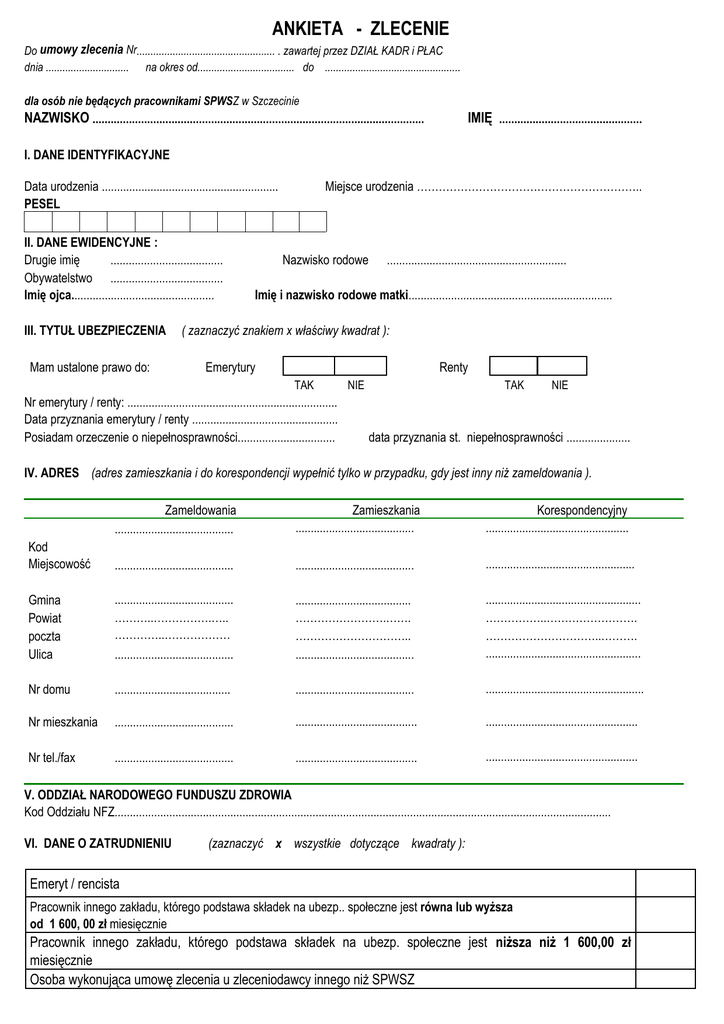 ANKIETA - ZLECENIE Do umowy zlecenia Nr.................................................. . zawartej przez DZIAŁ KADR i PŁAC dnia .............................. na okres od................................... do ................................................. dla osób nie będących pracownikami SPWSZ w Szczecinie NAZWISKO ............................................................................................................. IMIĘ ............................................... I. DANE IDENTYFIKACYJNE Data urodzenia .......................................................... PESEL II. DANE EWIDENCYJNE : Drugie imię ..................................... Obywatelstwo ..................................... Imię ojca............................................... III. TYTUŁ UBEZPIECZENIA Mam ustalone prawo do: Miejsce urodzenia …………………………………………………….. Nazwisko rodowe ........................................................... Imię i nazwisko rodowe matki................................................................... ( zaznaczyć znakiem x właściwy kwadrat ): Emerytury Renty TAK Nr emerytury / renty: ..................................................................... Data przyznania emerytury / renty ................................................ Posiadam orzeczenie o niepełnosprawności................................ NIE TAK NIE data przyznania st. niepełnosprawności ..................... IV. ADRES (adres zamieszkania i do korespondencji wypełnić tylko w przypadku, gdy jest inny niż zameldowania ). Zameldowania ....................................... Zamieszkania ....................................... Korespondencyjny ............................................... Kod Miejscowość ....................................... ....................................... ................................................. Gmina Powiat poczta Ulica ....................................... ………..…………….….. …………..……………… ....................................... ...................................... …………………….……. ………………………….. ....................................... ................................................... ……………..……………………. …………………………..………. ................................................... Nr domu ...................................... ....................................... .................................................... Nr mieszkania ....................................... ........................................ .................................................. Nr tel./fax ....................................... ........................................ .................................................. V. ODDZIAŁ NARODOWEGO FUNDUSZU ZDROWIA Kod Oddziału NFZ................................................................................................................................................................... VI. DANE O ZATRUDNIENIU (zaznaczyć x wszystkie dotyczące kwadraty ): Emeryt / rencista Pracownik innego zakładu, którego podstawa składek na ubezp.. społeczne jest równa lub wyższa od 1 600, 00 zł miesięcznie Pracownik innego zakładu, którego podstawa składek na ubezp. społeczne jest niższa niż 1 600,00 zł miesięcznie Osoba wykonująca umowę zlecenia u zleceniodawcy innego niż SPWSZ Student lub uczeń szkoły ponadpodstawowej nie mający 26 lat Student lub uczeń szkoły ponadpodstawowej mający ponad 26 lat opłacająca składki na ubezp. emerytalne i rentowe nie opłacająca składek na ubezp. emerytalne i rentowe zarejestrowany w Urzędzie Pracy nie zarejestrowany w Urzędzie Pracy Osoba prowadząca pozarol. dział. gospodarczą Bezrobotny(a) Osoba przebywająca na urlopie wychowawczym Osoba pobierająca zasiłek macierzyński Inny (wpisać jaki): ................................................................................................................................ Uwaga : osoby, których łączna podstawa składek na ubezpieczenie emer.-rent. nie przekracza 1.600 zł. proszone są o kontakt ze Specjalistą ds. Płac, tel. 091- 8139052 VII. UBEZPIECZENIA DOBROWOLNE ( zaznaczyć znakiem x właściwy kwadrat ): Wnoszę o dobrowolne ubezpieczenie emerytalno-rentowe Wnoszę o dobrowolne ubezpieczenie chorobowe TAK NIE VIII. MIEJSCE WYKONYWANIA UMOWY (zaznaczyć znakiem x właściwy kwadrat ) : Praca wykonywana w siedzibie lub miejscu prowadzenia działalności zleceniodawcy Praca wykonywana poza siedzibą lub miejscem prowadzenia działalności zleceniodawcy IX. OŚWIADCZENIE ZLECENIOBIORCY : Oświadczam, że dane zawarte w formularzu są zgodne ze stanem prawnym i faktycznym. Jestem świadomy/a odpowiedzialności karnej za zeznanie nieprawdy lub zatajenie prawdy. Zobowiązuję się powiadomić zleceniodawcę o wszelkich zmianach do ww. ankiety. .......................................... miejscowość i data ...................................................................... podpis zleceniobiorcy X. UPOWAŻNIENIE Upoważniam pracownika Działu Kadr i Płac SPWSZ do podpisania w moim imieniu dokumentów związanych z zarejestrowaniem i wyrejestrowaniem z ubezpieczeń społecznych i/lub zdrowotnych. ............................................................................. podpis osoby upoważniającej UWAGA: należy wypełnić czytelnie wszystkie kolejne punkty ankiety. Nie wypełnienie choćby jednego spowoduje zwrot ankiety i przesunięcie terminu zawarcia umowy. Wszelkie zmiany mające wpływ na ubezpieczenie należy niezwłocznie zgłosić w Dziale Kadr i Płac. _____________________________________________________________________________ Wypełnia Dział Kadr i Płac SPWSZ: Na podstawie ankiety zgłoszono do ubezpieczenia: Rodzaj ubezpieczenia: Emerytalne Rentowe Chorobowe Wypadkowe Zdrowotne Kod tytułu ubezpieczenia: Data i podpis pracownika D