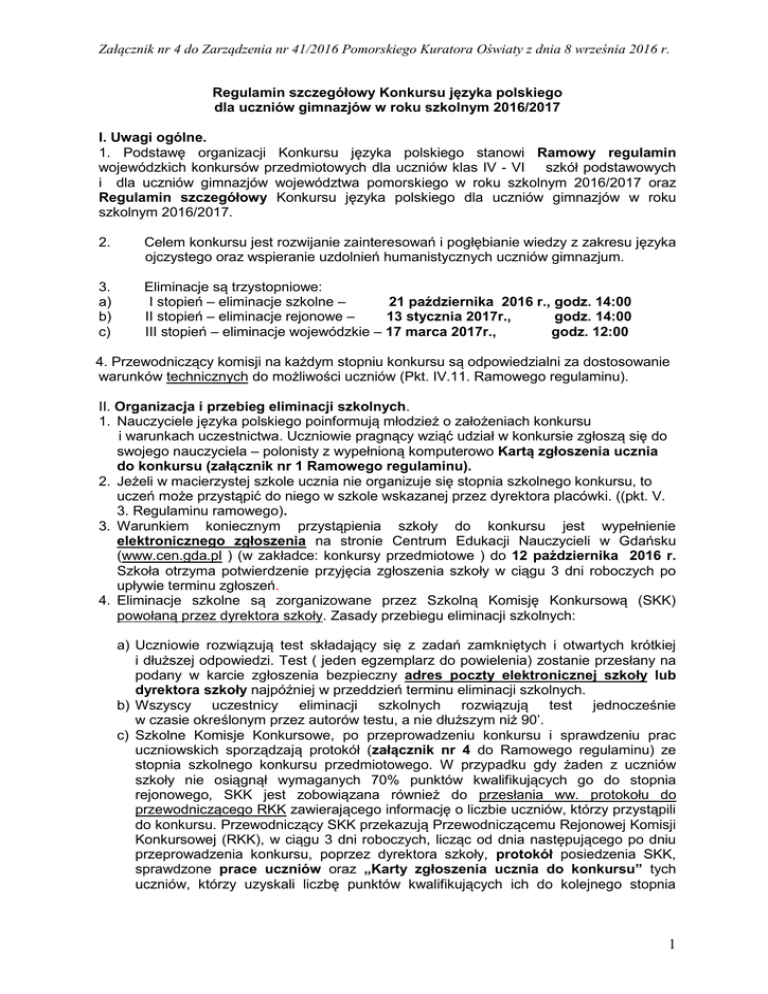 Załącznik nr 4 do Zarządzenia nr 41/2016 Pomorskiego Kuratora Oświaty z dnia 8 września 2016 r. Regulamin szczegółowy Konkursu języka polskiego dla uczniów gimnazjów w roku szkolnym 2016/2017 I. Uwagi ogólne. 1. Podstawę organizacji Konkursu języka polskiego stanowi Ramowy regulamin wojewódzkich konkursów przedmiotowych dla uczniów klas IV - VI szkół podstawowych i dla uczniów gimnazjów województwa pomorskiego w roku szkolnym 2016/2017 oraz Regulamin szczegółowy Konkursu języka polskiego dla uczniów gimnazjów w roku szkolnym 2016/2017. 2. Celem konkursu jest rozwijanie zainteresowań i pogłębianie wiedzy z zakresu języka ojczystego oraz wspieranie uzdolnień humanistycznych uczniów gimnazjum. 3. a) b) c) Eliminacje są trzystopniowe: I stopień – eliminacje szkolne – 21 października 2016 r., godz. 14:00 II stopień – eliminacje rejonowe – 13 stycznia 2017r., godz. 14:00 III stopień – eliminacje wojewódzkie – 17 marca 2017r., godz. 12:00 4. Przewodniczący komisji na każdym stopniu konkursu są odpowiedzialni za dostosowanie warunków technicznych do możliwości uczniów (Pkt. IV.11. Ramowego regulaminu). II. Organizacja i przebieg eliminacji szkolnych. 1. Nauczyciele języka polskiego poinformują młodzież o założeniach konkursu i warunkach uczestnictwa. Uczniowie pragnący wziąć udział w konkursie zgłoszą się do swojego nauczyciela – polonisty z wypełnioną komputerowo Kartą zgłoszenia ucznia do konkursu (załącznik nr 1 Ramowego regulaminu). 2. Jeżeli w macierzystej szkole ucznia nie organizuje się stopnia szkolnego konkursu, to uczeń może przystąpić do niego w szkole wskazanej przez dyrektora placówki. ((pkt. V. 3. Regulaminu ramowego). 3. Warunkiem koniecznym przystąpienia szkoły do konkursu jest wypełnienie elektronicznego zgłoszenia na stronie Centrum Edukacji Nauczycieli w Gdańsku (www.cen.gda.pl ) (w zakładce: konkursy przedmiotowe ) do 12 października 2016 r. Szkoła otrzyma potwierdzenie przyjęcia zgłoszenia szkoły w ciągu 3 dni roboczych po upływie terminu zgłoszeń. 4. Eliminacje szkolne są zorganizowane przez Szkolną Komisję Konkursową (SKK) powołaną przez dyrektora szkoły. Zasady przebiegu eliminacji szkolnych: a) Uczniowie rozwiązują test składający się z zadań zamkniętych i otwartych krótkiej i dłuższej odpowiedzi. Test ( jeden egzemplarz do powielenia) zostanie przesłany na podany w karcie zgłoszenia bezpieczny adres poczty elektronicznej szkoły lub dyrektora szkoły najpóźniej w przeddzień terminu eliminacji szkolnych. b) Wszyscy uczestnicy eliminacji szkolnych rozwiązują test jednocześnie w czasie określonym przez autorów testu, a nie dłuższym niż 90’. c) Szkolne Komisje Konkursowe, po przeprowadzeniu konkursu i sprawdzeniu prac uczniowskich sporządzają protokół (załącznik nr 4 do Ramowego regulaminu) ze stopnia szkolnego konkursu przedmiotowego. W przypadku gdy żaden z uczniów szkoły nie osiągnął wymaganych 70% punktów kwalifikujących go do stopnia rejonowego, SKK jest zobowiązana również do przesłania ww. protokołu do przewodniczącego RKK zawierającego informację o liczbie uczniów, którzy przystąpili do konkursu. Przewodniczący SKK przekazują Przewodniczącemu Rejonowej Komisji Konkursowej (RKK), w ciągu 3 dni roboczych, licząc od dnia następującego po dniu przeprowadzenia konkursu, poprzez dyrektora szkoły, protokół posiedzenia SKK, sprawdzone prace uczniów oraz „Karty zgłoszenia ucznia do konkursu” tych uczniów, którzy uzyskali liczbę punktów kwalifikujących ich do kolejnego stopnia 1 Załącznik nr 4 do Zarządzenia nr 41/2016 Pomorskiego Kuratora Oświaty z dnia 8 września 2016 r. konkursu. Kopie protokołu przesłanego do RKK, SKK pozostawia w swojej dokumentacji. 5. Przewodniczący SKK przesyła protokół pocztą elektroniczną na adres przewodniczącej RKK), a testy uczniów zakwalifikowanych do stopnia rejonowego na adres Rejonowej Komisji Konkursowej niezwłocznie, najpóźniej do 26 października 2016 r. (Adresy 10 komisji rejonowych wraz z nazwiskami przewodniczących RKK w załączeniu). 6. Rejonowa Komisja Konkursu języka polskiego po zweryfikowaniu prac uczniowskich kwalifikuje do II stopnia eliminacji uczniów (70%zdobytych punktów) na podstawie protokołu z odbytych eliminacji szkolnych oraz wyników dołączonych testów uczniów kwalifikowanych przez SKK. 7. Rejonowa Komisja Konkursowa (RKK) ustala listę uczestników II stopnia konkursu i umieszcza ją na stronie internetowej szkoły będącej siedzibą stopnia rejonowego Konkursu języka polskiego najpóźniej 7 listopada 2016 r. 8. Po upływie wyznaczonego terminu nie ulega zmianom lista uczestników stopnia rejonowego . 9. Wykaz komisji rejonowych Konkursu języka polskiego dla uczniów gimnazjum województwa pomorskiego: Lp. Rejon Nazwa i adres szkoły Imię i nazwisko Adres internetowy obejmuje przewodniczącej RKK strony szkolnej – siedziby RKK 1. Miasto Gdańsk Gimnazjum nr 27 Elżbieta Kowalik www.gim27gdansk. gimnazja w Gdańsku – Morenie, 58-345-82-78 edu.pl nr: 2, 3, 4, 5, 6, ul. P. Gojawiczyńskiej e-mail: 7, 8, 9, 10, 11, 10 [email protected] 27, 28, 29, 30, Tel: 58-341-01-67 31, 32, 33, 38, 48, powiat kartuski Miasto Gdańsk (gimnazja nr: 1,12,13,14,15, 16,17,18,19, 20, 21, 23,24, 25, 26,30, 31, 33, 34; gimnazja niepubliczne Gdynia Sopot Gimnazjum nr 1 w Gdańsku -Wrzeszczu ul. płk. Wilka Krzyżanowskiego Tel: 58=341-09-29 Dorota Kosek 58- 341-09-29 e-mail: [email protected] l www.gim1.internet dsl.pl Gimnazjum nr 24 (ZSO nr 1) w Gdyni, ul. Legionów 27 58- 622-18-33 www.lo3.gdynia.pl 4. Powiat: wejherowski; Rumia, Reda 5. Miasto Słupsk, powiaty: słupski ziemski, lęborski Gimnazjum nr 1 w Wejherowie ul. Sobieskiego 300 58-672-25-49 Gimnazjum nr 4 w Słupsku ul. Banacha 0-59-841-79-50 Brygida Maciejewska 58- 622-18-33 e-mail: brygida.maciejewska@gm ail.com Jolanta Eisner e-mail: [email protected] om Beata Moćko 59-