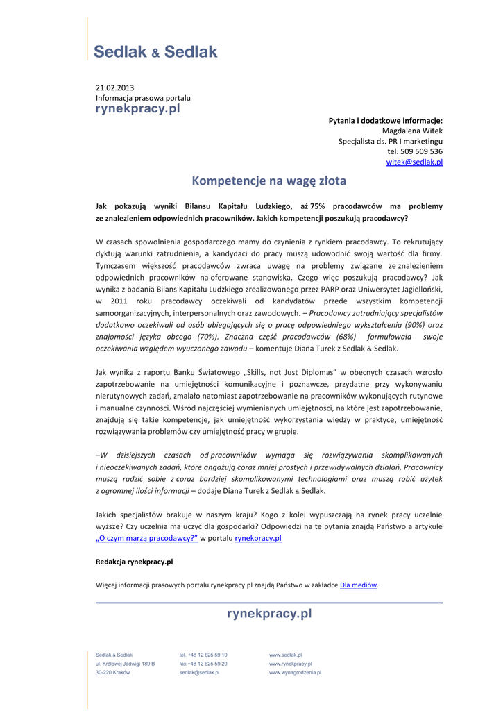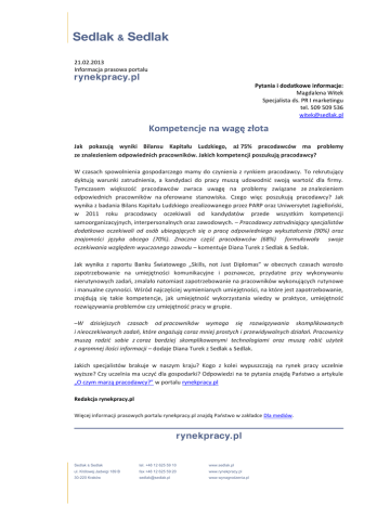 21.02.2013 Informacja prasowa portalu Pytania i dodatkowe informacje: Magdalena Witek Specjalista ds. PR I marketingu tel. 509 509 536 [email protected] Kompetencje na wagę złota Jak pokazują wyniki Bilansu Kapitału Ludzkiego, aż 75% pracodawców ma problemy ze znalezieniem odpowiednich pracowników. Jakich kompetencji poszukują pracodawcy? W czasach spowolnienia gospodarczego mamy do czynienia z rynkiem pracodawcy. To rekrutujący dyktują warunki zatrudnienia, a kandydaci do pracy muszą udowodnić swoją wartość dla firmy. Tymczasem większość pracodawców zwraca uwagę na problemy związane ze znalezieniem odpowiednich pracowników na oferowane stanowiska. Czego więc poszukują pracodawcy? Jak wynika z badania Bilans Kapitału Ludzkiego zrealizowanego przez PARP oraz Uniwersytet Jagielloński, w 2011 roku pracodawcy oczekiwali od kandydatów przede wszystkim kompetencji samoorganizacyjnych, interpersonalnych oraz zawodowych. – Pracodawcy zatrudniający specjalistów dodatkowo oczekiwali od osób ubiegających się o pracę odpowiedniego wykształcenia (90%) oraz znajomości języka obcego (70%). Znaczna część pracodawców (68%) formułowała swoje oczekiwania względem wyuczonego zawodu – komentuje Diana Turek z Sedlak & Sedlak. Jak wynika z raportu Banku Światowego „Skills, not Just Diplomas” w obecnych czasach wzrosło zapotrzebowanie na umiejętności komunikacyjne i poznawcze, przydatne przy wykonywaniu nierutynowych zadań, zmalało natomiast zapotrzebowanie na pracowników wykonujących rutynowe i manualne czynności. Wśród najczęściej wymienianych umiejętności, na które jest zapotrzebowanie, znajdują się takie kompetencje, jak umiejętność wykorzystania wiedzy w praktyce, umiejętność rozwiązywania problemów czy umiejętność pracy w grupie. –W dzisiejszych czasach od pracowników wymaga się rozwiązywania skomplikowanych i nieoczekiwanych zadań, które angażują coraz mniej prostych i przewidywalnych działań. Pracownicy muszą radzić sobie z coraz bardziej skomplikowanymi technologiami oraz muszą robić użytek z ogromnej ilości informacji – dodaje Diana Turek z Sedlak & Sedlak. Jakich specjalistów brakuje w naszym kraju? Kogo z kolei wypuszczają na rynek pracy uczelnie wyższe? Czy uczelnia ma uczyć dla gospodarki? Odpowiedzi na te pytania znajdą Państwo a artykule „O czym marzą pracodawcy?” w portalu rynekpracy.pl Redakcja rynekpracy.pl Więcej informacji prasowych portalu rynekpracy.pl znajdą Państwo w zakładce Dla mediów. Sedlak & Sedlak tel. +48 12 625 59 10 www.sedlak.pl ul. Królowej Jadwigi 189 B fax +48 12 625 59 20 www.rynekpracy.pl 30-220 Kraków [email protected] www.wynagrodzenia.pl