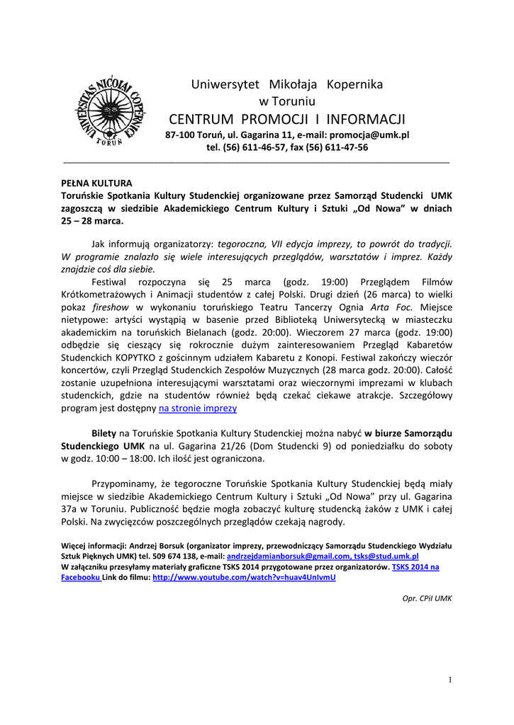 Uniwersytet Mikołaja Kopernika w Toruniu CENTRUM PROMOCJI I INFORMACJI 87-100 Toruń, ul. Gagarina 11, e-mail: [email protected] tel. (56) 611-46-57, fax (56) 611-47-56 __________________________________________________________________________________________ PEŁNA KULTURA Toruńskie Spotkania Kultury Studenckiej organizowane przez Samorząd Studencki UMK zagoszczą w siedzibie Akademickiego Centrum Kultury i Sztuki „Od Nowa” w dniach 25 – 28 marca. Jak informują organizatorzy: tegoroczna, VII edycja imprezy, to powrót do tradycji. W programie znalazło się wiele interesujących przeglądów, warsztatów i imprez. Każdy znajdzie coś dla siebie. Festiwal rozpoczyna się 25 marca (godz. 19:00) Przeglądem Filmów Krótkometrażowych i Animacji studentów z całej Polski. Drugi dzień (26 marca) to wielki pokaz fireshow w wykonaniu toruńskiego Teatru Tancerzy Ognia Arta Foc. Miejsce nietypowe: artyści wystąpią w basenie przed Biblioteką Uniwersytecką w miasteczku akademickim na toruńskich Bielanach (godz. 20:00). Wieczorem 27 marca (godz. 19:00) odbędzie się cieszący się rokrocznie dużym zainteresowaniem Przegląd Kabaretów Studenckich KOPYTKO z gościnnym udziałem Kabaretu z Konopi. Festiwal zakończy wieczór koncertów, czyli Przegląd Studenckich Zespołów Muzycznych (28 marca godz. 20:00). Całość zostanie uzupełniona interesującymi warsztatami oraz wieczornymi imprezami w klubach studenckich, gdzie na studentów również będą czekać ciekawe atrakcje. Szczegółowy program jest dostępny na stronie imprezy Bilety na Toruńskie Spotkania Kultury Studenckiej można nabyć w biurze Samorządu Studenckiego UMK na ul. Gagarina 21/26 (Dom Studencki 9) od poniedziałku do soboty w godz. 10:00 – 18:00. Ich ilość jest ograniczona. Przypominamy, że tegoroczne Toruńskie Spotkania Kultury Studenckiej będą miały miejsce w siedzibie Akademickiego Centrum Kultury i Sztuki „Od Nowa” przy ul. Gagarina 37a w Toruniu. Publiczność będzie mogła zobaczyć kulturę studencką żaków z UMK i całej Polski. Na zwycięzców poszczególnych przeglądów czekają nagrody. Więcej informacji: Andrzej Borsuk (organizator imprezy, przewodniczący Samorządu Studenckiego Wydziału Sztuk Pięknych UMK) tel. 509 674 138, e-mail: [email protected], [email protected] W załączniku przesyłamy materiały graficzne TSKS 2014 przygotowane przez organizatorów. TSKS 2014 na Facebooku Link do filmu: http://www.youtube.com/watch?v=huav4UnIvmU Opr. CPiI UMK 1