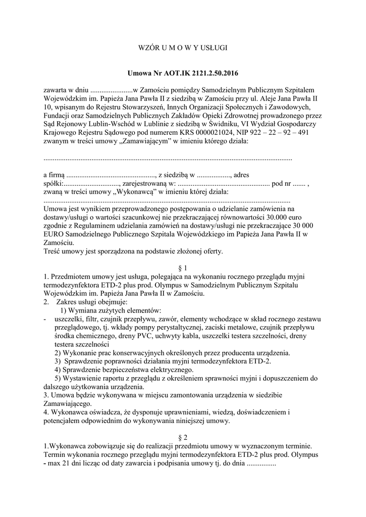 WZÓR U M O W Y USŁUGI Umowa Nr AOT.IK 2121.2.50.2016 zawarta w dniu .......................w Zamościu pomiędzy Samodzielnym Publicznym Szpitalem Wojewódzkim im. Papieża Jana Pawła II z siedzibą w Zamościu przy ul. Aleje Jana Pawła II 10, wpisanym do Rejestru Stowarzyszeń, Innych Organizacji Społecznych i Zawodowych, Fundacji oraz Samodzielnych Publicznych Zakładów Opieki Zdrowotnej prowadzonego przez Sąd Rejonowy Lublin-Wschód w Lublinie z siedzibą w Świdniku, VI Wydział Gospodarczy Krajowego Rejestru Sądowego pod numerem KRS 0000021024, NIP 922 – 22 – 92 – 491 zwanym w treści umowy „Zamawiającym” w imieniu którego działa: ....................................................................................................................................... a firmą ................................................, z siedzibą w .................., adres spółki:.............................., zarejestrowaną w: .................................................. pod nr ....... , zwaną w treści umowy „Wykonawcą” w imieniu której działa: ...................................................................................................................................... Umowa jest wynikiem przeprowadzonego postępowania o udzielanie zamówienia na dostawy/usługi o wartości szacunkowej nie przekraczającej równowartości 30.000 euro zgodnie z Regulaminem udzielania zamówień na dostawy/usługi nie przekraczające 30 000 EURO Samodzielnego Publicznego Szpitala Wojewódzkiego im Papieża Jana Pawła II w Zamościu. Treść umowy jest sporządzona na podstawie złożonej oferty. §1 1. Przedmiotem umowy jest usługa, polegająca na wykonaniu rocznego przeglądu myjni termodezynfektora ETD-2 plus prod. Olympus w Samodzielnym Publicznym Szpitalu Wojewódzkim im. Papieża Jana Pawła II w Zamościu. 2. Zakres usługi obejmuje: 1) Wymiana zużytych elementów: - uszczelki, filtr, czujnik przepływu, zawór, elementy wchodzące w skład rocznego zestawu przeglądowego, tj. wkłady pompy perystaltycznej, zaciski metalowe, czujnik przepływu środka chemicznego, dreny PVC, uchwyty kabla, uszczelki testera szczelności, dreny testera szczelności 2) Wykonanie prac konserwacyjnych określonych przez producenta urządzenia. 3) Sprawdzenie poprawności działania myjni termodezynfektora ETD-2. 4) Sprawdzenie bezpieczeństwa elektrycznego. 5) Wystawienie raportu z przeglądu z określeniem sprawności myjni i dopuszczeniem do dalszego użytkowania urządzenia. 3. Umowa będzie wykonywana w miejscu zamontowania urządzenia w siedzibie Zamawiającego. 4. Wykonawca oświadcza, że dysponuje uprawnieniami, wiedzą, doświadczeniem i potencjałem odpowiednim do wykonywania niniejszej umowy. §2 1.Wykonawca zobowiązuje się do realizacji przedmiotu umowy w wyznaczonym terminie. Termin wykonania rocznego przeglądu myjni termodezynfektora ETD-2 plus prod. Olympus - max 21 dni licząc od daty zawarcia i podpisania umowy tj. do dnia ................ 2. Za prawidłowo wykonaną usługę Zamawiający uzna wykonanie czynności określonych w § 1 zakończonych dostarczeniem raportu z przeglądu. §3 1. Wartość umowy wynosi ……………zł brutto (słownie złotych: ………………………………… ) tj. …………….. zł netto wraz z podatkiem VAT. 2. Wykaz cen jednostkowych za wykonanie przeglądu zawiera formularz cenowy stanowiący załącznik nr 1do niniejszej umowy. Ceny jednostkowe są stałe i nie podlegają żadnej zmianie w czasie trwania niniejszej umowy. 2.Cena brutto umowy obejmuje wszystkie koszty i opłaty dodatkowe z podatkiem VAT Jednostkowe ceny brutto nie mogą ulec podwyższeniu do czasu wykonania przedmiotu umowy. §4 1.Płatności za wykonaną usługę Zamawiający będzie regulował przelewem na konto Wykonawcy podane w fakturze za usługę w ciągu ....... dni od daty otrzymania prawidłowo wystawionej faktury VAT. 2.Podstawą do wystawienia faktury VAT przez Wykonawcę jest podpisany obustronnie raport wykonania przeglądu. Jako datę zapłaty przyjmuje się datę obciążenia rachunku bankowego Zamawiającego. §5 1.Za zwłokę w wykonaniu przedmiotu umowy Zamawiającemu należą się od Wykonawcy kary umowne w wysokości 0,2% całkowitej ceny (brutto) za każdy roboczy dzień zwłoki . 2. W przypadku odstąpienia od umowy, z winy Wykonawcy, przez którąkolwiek ze stron, należy się Zamawiającemu od Wykonawcy kara umowna w wysokości 5% łącznej ceny (brutto) umowy zgodnie z § 3 ust. 1 §6 1.Wykonawca nie może powierzyć wykonania umowy innej osobie lub jednostce. 2.W razie zwłoki w wykonaniu przedmiotu umowy Zamawiający ma prawo odstąpić od umowy po udzieleniu Wykonawcy dodatkowego terminu. Wyznaczenie przez Zamawiającego nowego terminu nie zwalnia Wykonawcy od obowiązku uiszczenia kary umownej określonej w § 5 ust.1 a dokonane odstąpienie nie zwalnia Wykonawcy z zapłaty tej kary. 3. Czynność prawna mająca na celu zmianę wierzyciela Zamawiającego może nastąpić wyłącznie po wyrażeniu zgody przez podmiot, który utworzył Zamawiającego. §7 1. Wykonawca udziela gwarancji na: - wymienione podzespoły na okres ...............(min. 6 miesięcy) licząc od dnia podpisania raportu z przeglądu. - usługę serwisową na okres ............( min. 3 miesięcy ) licząc od dnia podpisania raportu z przeglądu. 2. Do udzielonej gwarancji odpowiednie zastosowanie ma art. 580 i 581 KC. §8 W razie wystąpienia istotnej okoliczności powodującej, że wykonanie umowy nie leży w interesie publicznym, czego nie można było przewidzieć w chwili zawarcia umowy, Zamawiający może odstąpić od umowy w terminie 30 dni od powzięcia wiadomości o powyższych okolicznościach §9 1.W sprawach nieuregulowanych niniejszą umową zastosowanie mają przepisy Kodeksu Cywilnego oraz ogólnie obowiązujące przepisy prawne. 2.Ewentualne spory wynikłe na tle realizacji umowy rozstrzygane będą przez sąd powszechny w miejscu s