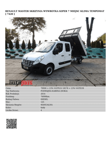 RENAULT MASTER SKRZYNIA WYWROTKA KIPER 7 MIEJSC KLIMA TEMPOMAT [ 7420 ] Cena: Typ Nadwozia: Rok Produkcji: Przebieg: Rodzaj Paliwa: Moc: Skrzynia Biegów: Kolor: Liczba Drzwi: 79900 + 23% VATPLN 18578 + 23% VATEUR PODWãJNA KABINA (DOKA) 2014 74990km. DIESEL 125 MANUALNA biały 4 INFORMACJE DODATKOWE ● ● ● bezwypadkowy sprowadzony zarejestrowany w polsce WYPOSAŻENIE ● ● ● ● ● ● ● ● ● ● ● ABS centralny zamek elektryczne lusterka immobiliser klimatyzacja komputer kontrola trakcji radio / cd tempomat wspomaganie kierownicy elektryczne szyby OPIS NUMER OFERTY– 7420 Oferta godna uwagi. Wzorowo utrzymany Renault Master wywrotka doka 7 miejsc. Auto sprowadzone z Francji w idealnym stanie. Bardzo mały przebieg. Rok produkcji 2014, kolor biały. Master jest bezwypadkowy w pełni sprawny. Wygląda i jeździ rewelacyjnie. Wnętrze czyste i zadbane. Silnik 2.3 dCi o mocy 125KM pracuje równo i cicho. Skrzynia biegów działa lekko i precyzyjnie. Auto jest gotowe do pracy. Wyposażone w tempomat i klimatyzację. Wyposażenie: - ABS, ASR - poduszka powietrzna kierowcy i pasażera - klimatyzacja - tempomat - elektryczne szyby i lusterka - wspomaganie kierownicy - kierownica wielofunkcyjna - immobiliser - centralny zamek - radio MP3 - 6 biegów - 7 miejsc - podłokietnik - wymiary powierzchni ładunkowej: długość / 320 cm / szerokość / 200 cm / - Podana cena jest CENĄ NETTO!!. Wystawiamy Fakturę VAT. - MOŻLIWOŚĆ KREDYTOWANIA LUB LEASINGOWANIA, 100% WARTOŚCI AUTA, PROCEDURA UPROSZCZONA, WYMAGANE DOKUMENTY NIP, REGON, WPIS DO EWIDENCJI, DOWÓD OSOBISTY. - WIĘCEJ INFORMACJI NA STRONIE www.auto-plus.com.pl - NINIEJSZE OGŁOSZENIE JEST WYŁĄCZNIE INFORMACJĄ HANDLOWĄ I NIE STANOWI OFERTY W MYŚL art. 66, § 1. KODEKSU CYWILNEGO. SPRZEDAJĄCY NIE ODPOWIADA ZA EWENTUALNE BŁĘDY LUB NIEAKTUALNOŚĆ OGŁOSZENIA.