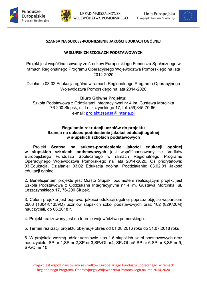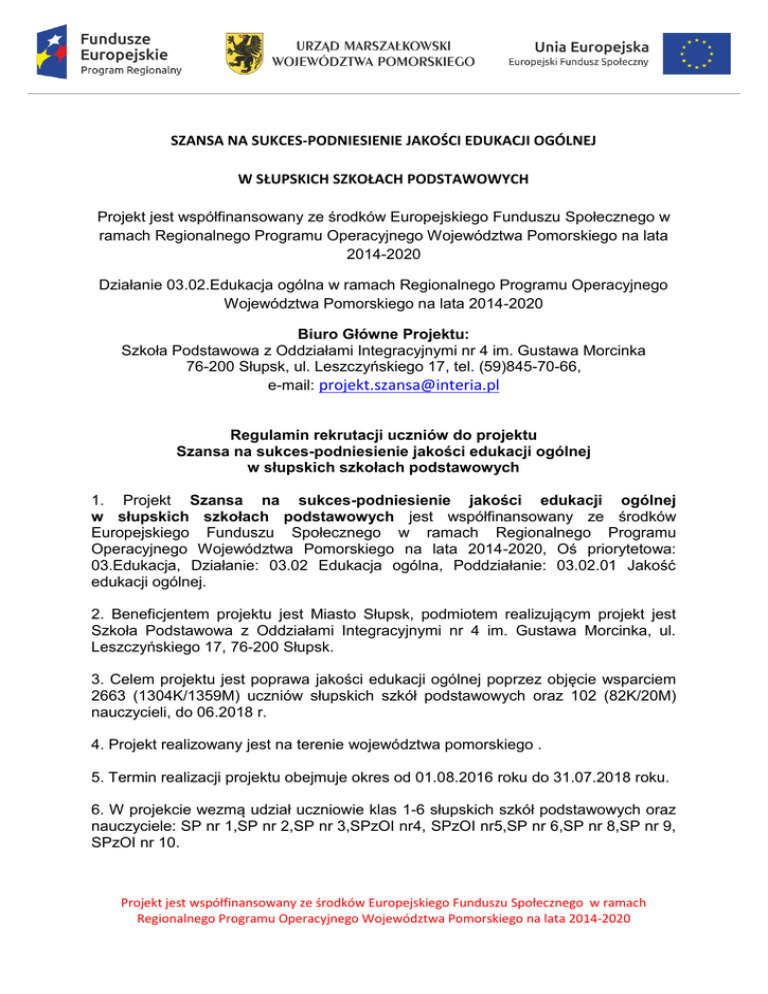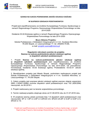 SZANSA NA SUKCES-PODNIESIENIE JAKOŚCI EDUKACJI OGÓLNEJ W SŁUPSKICH SZKOŁACH PODSTAWOWYCH Projekt jest współfinansowany ze środków Europejskiego Funduszu Społecznego w ramach Regionalnego Programu Operacyjnego Województwa Pomorskiego na lata 2014-2020 Działanie 03.02.Edukacja ogólna w ramach Regionalnego Programu Operacyjnego Województwa Pomorskiego na lata 2014-2020 Biuro Główne Projektu: Szkoła Podstawowa z Oddziałami Integracyjnymi nr 4 im. Gustawa Morcinka 76-200 Słupsk, ul. Leszczyńskiego 17, tel. (59)845-70-66, e-mail: [email protected] Regulamin rekrutacji uczniów do projektu Szansa na sukces-podniesienie jakości edukacji ogólnej w słupskich szkołach podstawowych 1. Projekt Szansa na sukces-podniesienie jakości edukacji ogólnej w słupskich szkołach podstawowych jest współfinansowany ze środków Europejskiego Funduszu Społecznego w ramach Regionalnego Programu Operacyjnego Województwa Pomorskiego na lata 2014-2020, Oś priorytetowa: 03.Edukacja, Działanie: 03.02 Edukacja ogólna, Poddziałanie: 03.02.01 Jakość edukacji ogólnej. 2. Beneficjentem projektu jest Miasto Słupsk, podmiotem realizującym projekt jest Szkoła Podstawowa z Oddziałami Integracyjnymi nr 4 im. Gustawa Morcinka, ul. Leszczyńskiego 17, 76-200 Słupsk. 3. Celem projektu jest poprawa jakości edukacji ogólnej poprzez objęcie wsparciem 2663 (1304K/1359M) uczniów słupskich szkół podstawowych oraz 102 (82K/20M) nauczycieli, do 06.2018 r. 4. Projekt realizowany jest na terenie województwa pomorskiego . 5. Termin realizacji projektu obejmuje okres od 01.08.2016 roku do 31.07.2018 roku. 6. W projekcie wezmą udział uczniowie klas 1-6 słupskich szkół podstawowych oraz nauczyciele: SP nr 1,SP nr 2,SP nr 3,SPzOI nr4, SPzOI nr5,SP nr 6,SP nr 8,SP nr 9, SPzOI nr 10. Projekt jest współfinansowany ze środków Europejskiego Funduszu Społecznego w ramach Regionalnego Programu Operacyjnego Województwa Pomorskiego na lata 2014-2020 7. Do projektu zakwalifikowanych zostanie co najmniej 2663 uczniów i 102 nauczycieli. 8. Na wypadek rezygnacji ucznia w wyniku choroby lub z przyczyn losowych z udziału w projekcie, utworzona zostanie lista rezerwowa obejmująca co najmniej 2 uczniów z każdej szkoły. 9. Po dokonaniu rekrutacji uczniów do projektu, z ich rodzicami/opiekunami prawnymi wypełnione i podpisane zostaną dokumenty: deklaracja uczestnictwa w projekcie, dane uczestników projektu, którzy otrzymują wsparcie w ramach RPO WP 20142020, oświadczenie-zgoda na przetwarzanie danych osobowych, zgoda na wykorzystanie wizerunku dziecka. 10.Nauczyciele przystępujący do projektu również wypełnią dokumenty: deklaracja uczestnictwa w projekcie, dane uczestników projektu, którzy otrzymują wsparcie w ramach RPO WP 2014-2020, oświadczenie-zgoda na przetwarzanie danych osobowych, zgoda na wykorzystanie wizerunku. Etapy rekrutacji: 1. W słupskich szkołach podstawowych zostaną zorganizowane spotkania informacyjne dla uczniów klas 1-6, rodziców i nauczycieli, w trakcie których zostaną przedstawione założenia projektu. Regulamin rekrutacji, kryteria i zasady uczestnictwa w projekcie zostaną umieszczone na stronach internetowych szkół. Uczniowie otrzymają informacje od wychowawców, nauczyciele na Radach Pedagogicznych, rodzice na pierwszych spotkaniach z wychowawcą i przez edziennik. 2. Wychowawcy przekażą karty zgłoszenia do projektu uczniom. Dokumenty będą do pobrania również w sekretariatach szkół, na ich stronach www i biurze głównym projektu. 3. Wypełnione i podpisane dokumenty zgłoszeniowe będą przyjmowane przez wychowawców do 18 października 2016 r. od daty ogłoszenia rekrutacji. Zgłoszenia, które nie będą spełniały powyższych wymogów, nie będą rozpatrywane. 4. Weryfikacji dokumentów pod kątem formalnym dokonają Komisje Rekrutacyjne w poszczególnych szkołach składające się z: Dyrektora Szkoły, szkolnego koordynatora oraz specjalisty ds. monitoringu i promocji. 5. Komisje Rekrutacyjne sporządzą protokół oraz listę osób zakwalifikowanych do udziału w projekcie. 6. O zakwalifikowaniu ucznia do projektu poinformowani zostaną rodzice przez edziennik w ciągu 3 dni roboczych od zakończenia przyjmowania kart zgłoszenia Projekt jest współfinansowany ze środków Europejskiego Funduszu Społecznego w ramach Regionalnego Programu Operacyjnego Województwa Pomorskiego na lata 2014-2020 udziału w projekcie Szansa na sukces - podniesienie jakości edukacji ogólnej w słupskich szkołach podstawowych 7. Koordynator projektu zastrzega sobie prawo do decydowania w sprawach nieobjętych regulaminem rekrutacji oraz w sytuacjach spornych. Warunki przyjęcia uczniów do projektu: 1. Projekt adresowany jest do uczniów klas 1-6 słupskich szkół podstawowych. 2. Kryteria rekrutacji : a) Interaktywne warsztaty matematyczne -kl. IV-VI -uczniowie z ocena dst i poniżej z matematyki, średnia 3,0 i poniżej -kl.I-III na podstawie oceny opisowej nauczyciela b) Magia matematyki -zajęcia dla uczniów uzdolnionych i zainteresowanych przedmiotami ścisłymi -Warsztaty matematyczno-przyrodnicze z elementami fotografii z zastosowaniem TIK (kl.IV-VI) -Matematyka w praktyce-gry i zabawy logiczne (kl.I-VI) -Szachy (kl.I-VI) -Mały olimpijczyk (kl.V-VI) -Robotyka (kl.I-VI) -Kodowanie ( Kl.I-VI) -kl.IV-VI- uczniowie ze średnią 4,0 i powyżej -kl.I-III – uczniowie wskazani przez nauczyciela c) Rozszerzenie oferty edukacyjno-terapeutycznej dla uczniów o specjalnych potrzebach edukacyjnych -Terapia pedagogiczna -Terapia Si -Biofeedbek -Gimnastyka korekcyjna -Logopedia - kl.I-VI na podstawie opinii PPP lub orzeczenia o kształceniu specjalnym, niepełnosprawności oraz uczeń młodszy. d) Angielski teatrzyk -kl.I-VI – uczniowie wyrażający chęć udziału w zajęciach, pragnący rozwijać kompetencje językowe. e)Organizacja zajęć z doradztwa zawodowego-obligatoryjnie wszyscy uczniowie klas VI f) Kształcenie nauczycieli-studia podyplom