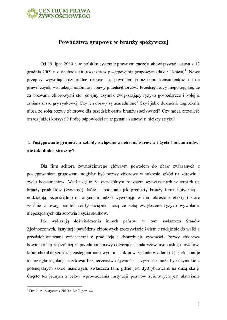 Powództwa grupowe w branży spożywczej Od 19 lipca 2010 r. w polskim systemie prawnym zaczęła obowiązywać ustawa z 17 grudnia 2009 r. o dochodzeniu roszczeń w postępowaniu grupowym (dalej: Ustawa)1. Nowe przepisy wywołują różnorodne reakcje: są powodem entuzjazmu konsumentów i firm prawniczych, wzbudzają natomiast obawy przedsiębiorców. Przedsiębiorcy niepokoją się, że za pozwami zbiorowymi stoi kolejny czynnik zwiększający ryzyko gospodarcze i kolejna zmiana zasad gry rynkowej. Czy ich obawy są uzasadnione? Czy i jakie dokładnie zagrożenia niosą ze sobą pozwy zbiorowe dla przedsiębiorstw branży spożywczej? Czy mogą przynieść im też jakieś korzyści? Próbę odpowiedzi na te pytania stanowi niniejszy artykuł. 1. Postępowanie grupowe a szkody związane z ochroną zdrowia i życia konsumentów: nie taki diabeł straszny? Dla firm sektora żywnościowego głównym powodem do obaw związanych z postępowaniem grupowym mogłyby być pozwy zbiorowe w zakresie szkód na zdrowiu i życiu konsumentów. Wiąże się to ze szczególnym rodzajem wytwarzanych w ramach tej branży produktów (żywność), które – podobnie jak produkty branży farmaceutycznej – oddziałują bezpośrednio na organizm ludzki wywołując w nim określone efekty i które właśnie z uwagi na ten ścisły związek niosą ze sobą zwiększone ryzyko wywołania niepożądanych dla zdrowia i życia skutków. Jak wykazują doświadczenia innych państw, w tym zwłaszcza Stanów Zjednoczonych, instytucja powództw zbiorowych rzeczywiście świetnie nadaje się do walki z przedsiębiorstwami związanymi z produkcją i dystrybucją żywności. Pozwy zbiorowe bowiem mają najczęściej za przedmiot sprawy dotyczące standaryzowanych usług i towarów, które charakteryzują się zasięgiem masowym a – jak powszechnie wiadomo i jak eksponuje to rozległa regulacja z zakresu bezpieczeństwa żywności – żywność może być czynnikiem potencjalnych szkód masowych, zwłaszcza tam, gdzie jest dystrybuowana na dużą skalę. Często też jednym z celów wprowadzania instytucji pozwów zbiorowych jest ułatwianie 1 Dz. U. z 18 stycznia 2010 r. Nr 7, poz. 44 1 możliwości skorzystania z drogi sądowej w sytuacji, gdy roszczenie dotyczy małej kwoty. Zazwyczaj w takich przypadkach koszty postępowania są niewspółmiernie wysokie w stosunku do wysokości dochodzonego roszenia i wytaczanie indywidualnego powództwa staje się po prostu nieopłacalne2. Taka sytuacja ma często miejsce właśnie w przypadku konsumentów żywności, kiedy to szkoda polega na krótkotrwałych dolegliwościach spowodowanych spożyciem produktu żywnościowego. Pozwy zbiorowe pozwalają na podzielenie kosztów pomiędzy wszystkimi podmiotami występującymi po stronie powodowej. W przypadku polskiej Ustawy są one także niższe niż koszty postępowania indywidualnego (np. opłata stosunkowa wynosi 2% a nie 5% wartości przedmiotu sporu lub zaskarżenia). Warto też dodać, że - jak wskazują badania - ponad 70% ankietowanych obywateli państw członkowskich Unii Europejskiej deklaruje, że skorzystałoby z ochrony sądowej w drobnych sprawach, jeżeli mogłyby być one wytaczane wspólnie z innymi osobami3. Na tym tle wydawałoby się, że wprowadzenie do polskiego porządku prawnego instytucji powództw zbiorowych może nieść za sobą realną możliwość zwiększenia się ilości spraw dotyczących ochrony zdrowia i życia wnoszonych do sądu przez konsumentów żywności przeciwko podmiotom działającym na rynku spożywczym (producentom, przetwórcom, dystrybutorom, restauratorom)4. Tymczasem w świetle ostatecznej wersji Ustawy, która jest wersją obowiązującą, możliwość ta nie wydaje się być wcale taka oczywista. Art. 1 ust. 2 Ustawy stanowi bowiem, że ma ona „zastosowanie w sprawach o roszczenia o ochronę konsumentów, z tytułu odpowiedzialności za szkodę wyrządzoną przez produkt niebezpieczny oraz z tytułu czynów niedozwolonych, z wyjątkiem roszczeń o ochronę dóbr osobistych”. Z przepisu tego zdaje się dość jasno wynikać, że przewidziany w nim wyjątek dotyczy ochrony wszystkich dóbr osobistych. Dotyczy to zatem także zdrowia, które 2 Taki cel przyświecał też polskiemu ustawodawcy, który w uzasadnieniu do projektu stwierdzał, że „Postępowanie grupowe ułatwia dostęp do sądu w sytuacjach, w których dochodzenie roszczenia w takim postępowaniu jest korzystniejsze dla zainteresowanego niż indywidualne występowanie z własnym roszczeniem (np. w przypadku dochodzenia bardzo małych kwotowo roszczeń od jednego sprawcy szkody) i dzięki temu zwiększa efektywność ochrony sądowej)”. Zob. Uzasadnienie do Rządowego projektu ustawy o dochodzeniu roszczeń w postępowaniu grupowym (druk 1829) dostępne na stronie http://orka.sejm.gov.pl/Druki6ka.nsf/wgdruku/1829 3 Badania cytowane za Uzasadnieniem projektu ustawy o dochodzeniu roszczeń w postępowaniu grupowym z dnia 11.06.2008 r. Dostępne na stronie www.ms.gov.pl 4 Warto jednak w tym kontekście wskazać, że powyższa okoliczność raczej zaprzecza niż potwierdza inną deklarowaną przez ustawodawcę zaletę nowej ustawy jaką jest ekonomia wymiaru sprawiedliwości. Możliwość wnoszenia pozwów grupowych będzie bowiem raczej mnożyć liczbę spraw, zastępując wiele często tylko potencjalnych spraw indywidualnych, jednym, ale za to bardziej prawdopodobnym, pozwem zbiorowym. 2 – w myśl art. 23 kodeksu cywilnego – jest zaliczane w poczet dóbr osobistych5. Redakcja tego przepisu wskazuje ponadto, że wyjątek ten obejmuje wszystkie przewidziane w nim rodzaje roszczeń (o ochronę konsumenta, z tytułu odpowiedzialności za produkt oraz z tytułu czynów niedozwolonych), a nie tylko - jakby sugerowały niektóre komentarze – samych czynów niedozwolonych. Potwierdza to także intencja ustawodawcy wyrażona w uzasadnieniu do poprawek zaproponowanych przez Senat, gdzie wyraźnie stwierdza się, 