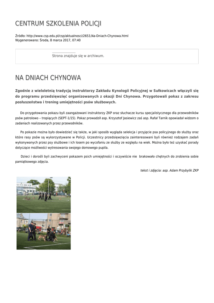 CENTRUM SZKOLENIA POLICJI Źródło: http://www.csp.edu.pl/csp/aktualnosci/2653,Na-Dniach-Chynowa.html Wygenerowano: Środa, 8 marca 2017, 07:40 Strona znajduje się w archiwum. NA DNIACH CHYNOWA Zgodnie z wieloletnią tradycją instruktorzy Zakładu Kynologii Policyjnej w Sułkowicach włączyli się do programu przedsięwzięć organizowanych z okazji Dni Chynowa. Przygotowali pokaz z zakresu posłuszeństwa i trening umiejętności psów służbowych. Do przygotowania pokazu byli zaangażowani instruktorzy ZKP oraz słuchacze kursu specjalistycznego dla przewodników psów patrolowo – tropiących (SEPT-1/15). Pokaz prowadził asp. Krzysztof Jasiewicz zaś asp. Rafał Tarnik opowiadał widzom o zadaniach realizowanych przez przewodników. Po pokazie można było dowiedzieć się także, w jaki sposób wygląda selekcja i przyjęcie psa policyjnego do służby oraz które rasy psów są wykorzystywane w Policji. Uczestnicy przedsięwzięcia zainteresowani byli również rodzajem zadań wykonywanych przez psy służbowe i ich losem po wycofaniu ze służby ze względu na wiek. Można było też uzyskać porady dotyczące możliwości wytresowania swojego domowego pupila. Dzieci i dorośli byli zachwyceni pokazem psich umiejętności i oczywiście nie brakowało chętnych do zrobienia sobie pamiątkowego zdjęcia. tekst i zdjęcia: asp. Adam Przybylik ZKP Ocena: 5/5 (1) Tweetnij