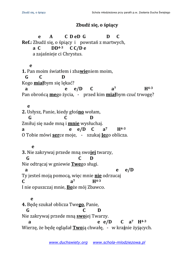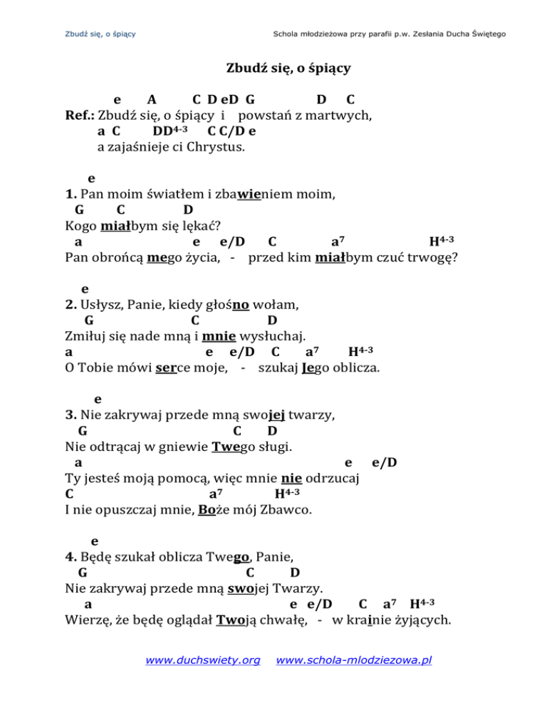 Zbudź się, o śpiący Schola młodzieżowa przy parafii p.w. Zesłania Ducha Świętego Zbudź się, o śpiący e A C D eD G D C Ref.: Zbudź się, o śpiący i powstań z martwych, a C DD4-3 C C/D e a zajaśnieje ci Chrystus. e 1. Pan moim światłem i zbawieniem moim, G C D Kogo miałbym się lękać? a e e/D C a7 H4-3 Pan obrońcą mego życia, - przed kim miałbym czuć trwogę? e 2. Usłysz, Panie, kiedy głośno wołam, G C D Zmiłuj się nade mną i mnie wysłuchaj. a e e/D C a7 H4-3 O Tobie mówi serce moje, - szukaj Jego oblicza. e 3. Nie zakrywaj przede mną swojej twarzy, G C D Nie odtrącaj w gniewie Twego sługi. a e e/D Ty jesteś moją pomocą, więc mnie nie odrzucaj C a7 H4-3 I nie opuszczaj mnie, Boże mój Zbawco. e 4. Będę szukał oblicza Twego, Panie, G C D Nie zakrywaj przede mną swojej Twarzy. a e e/D C a7 H4-3 Wierzę, że będę oglądał Twoją chwałę, - w krainie żyjących. www.duchswiety.org www.schola-mlodziezowa.pl