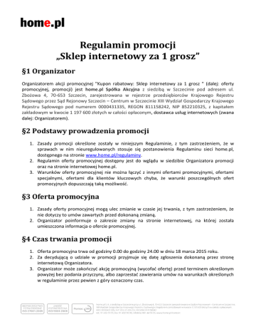 Regulamin promocji „Sklep internetowy za 1 grosz” §1 Organizator Organizatorem akcji promocyjnej "Kupon rabatowy: Sklep internetowy za 1 grosz " (dalej: oferty promocyjnej, promocji) jest home.pl Spółka Akcyjna z siedzibą w Szczecinie pod adresem ul. Zbożowa 4, 70-653 Szczecin, zarejestrowana w rejestrze przedsiębiorców Krajowego Rejestru Sądowego przez Sąd Rejonowy Szczecin – Centrum w Szczecinie XIII Wydział Gospodarczy Krajowego Rejestru Sądowego pod numerem 0000431335, REGON 811158242, NIP 852210325, z kapitałem zakładowym w kwocie 1 197 600 złotych w całości opłaconym, dostawca usług internetowych (zwana dalej: Organizatorem). §2 Podstawy prowadzenia promocji 1. Zasady promocji określone zostały w niniejszym Regulaminie, z tym zastrzeżeniem, że w sprawach w nim nieuregulowanych stosuje się postanowienia Regulaminu sieci home.pl, dostępnego na stronie www.home.pl/regulaminy. 2. Regulamin oferty promocyjnej dostępny jest do wglądu w siedzibie Organizatora promocji oraz na stronie internetowej home.pl. 3. Warunków oferty promocyjnej nie można łączyć z innymi ofertami promocyjnymi, ofertami specjalnymi, ofertami dla klientów kluczowych chyba, że warunki poszczególnych ofert promocyjnych dopuszczają taką możliwość. §3 Oferta promocyjna 1. Zasady oferty promocyjnej mogą ulec zmianie w czasie jej trwania, z tym zastrzeżeniem, że nie dotyczy to umów zawartych przed dokonaną zmianą. 2. Organizator poinformuje o zakresie zmiany na stronie internetowej, na której została umieszczona informacja o ofercie promocyjnej. §4 Czas trwania promocji 1. Oferta promocyjna trwa od godziny 0.00 do godziny 24.00 w dniu 18 marca 2015 roku. 2. Za decydującą o udziale w promocji przyjmuje się datę zgłoszenia dokonaną przez stronę internetową Organizatora. 3. Organizator może zakończyć akcję promocyjną (wycofać ofertę) przed terminem określonym powyżej bez podania przyczyny, albo zaprzestać zawierania umów na warunkach określonych w regulaminie przez pewien z góry oznaczony czas. 4. W przypadku wprowadzenia nowej oferty promocyjnej w takim samym lub podobnym zakresie, dotychczasowa oferta promocyjna przestaje wiązać Organizatora chyba, że ten postanowi inaczej. §5 Uczestnicy 1. Oferta promocyjna skierowana jest do osób fizycznych posiadających pełną zdolność do czynności prawnych, osób prawnych i jednostek organizacyjnych posiadających zdolność prawną, które w trakcie promocji: a. zaakceptowały niniejszy Regulamin, oraz b. zaakceptowały Regulamin wskazany w § 2 pkt 1, oraz c. w trakcie trwania promocji zarejestrują usługi w pakietach wskazanych w § 6 pkt 1, oraz d. dokonają płatności za usługi wskazane w lit c powyżej w kwocie podanej w tabeli zawartej w § 6 pkt 1, nie później jednak, jak do dnia zakończenia promocji, oraz e. zamawiając nową usługę na warunkach promocji, w chwili rozpoczęcia akcji nie posiadały w systemie Organizatora aktywnej i opłaconej usługi o takim samym typie, jak wymienione w lit c powyżej. Ponadto przyjmuje się, iż w przypadku oferty sklepów internetowych tożsamymi są jest para usług: Click Shop oraz Click Shop Premium. 2. Z udziału w akcji wyłączeni są pracownicy Organizatora, członkowie ich rodzin. 3. Z warunków oferty promocyjnej nie mogą korzystać uczestnicy, którzy nie dokonali płatności za usługi lub opóźnili się z płatnością za usługi oferowane przez Organizatora, albo dotychczas zawarte umowy wykonywali w sposób nienależyty chyba, że Organizator postanowi inaczej. §6 Zasady promocji 1. Uczestnik, który spełnił warunki opisane w § 5 jest uprawniony do dokonania zamówienia za pomocą strony internetowej, na której Organizator umieszcza informację o ofercie promocyjnej usługi opisanej w tabeli poniżej w pakietach wskazanych w tabeli poniżej na pierwszy okres abonamentowy obejmujący okres 12 miesięcy kalendarzowych za zapłatą promocyjnej ceny wskazanej w tabeli poniżej: Tabela nr 1 Typ usługi Cena promocyjna Click Shop Premium 4,49 zł *Podane ceny są cenami brutto 2. Promocja dotyczy wyłącznie usług: o zarejestrowanych w czasie trwania promocji, w pierwszym okresie abonamentowym, o które nie biorą udziału w innych promocjach, ofertach promocyjnych i akcjach specjalnych, o opłaconych jednorazowo za pierwszy okres abonamentowy obejmujący okres 12 miesięcy kalendarzowych. 3. Prolongata ważności usługi, wniesienie opłaty rocznej za konto zarejestrowane w ramach niniejszej promocji, odbywa się na warunkach ogólnych obowiązujących w momencie odnowienia usługi i wynikających z cennika Organizatora, bez uwzględniania jakichkolwiek promocji, rabatów, czy też upustów cenowych, bez względu na ich charakter, chyba że Organizator postanowi inaczej. 4. Użytkowanie usług zarejestrowanych w trakcie trwania promocji podlega ogólnym zasadom korzystania z usług, zawartym w Regulaminie wskazanym w § 2 pkt 1. 5. Uczestnik promocji zobowiązuje się nie wypowiadać umowy w zakresie usługi wskazanej w pkt 1 powyżej, zarejestrowanej na warunkach promocji przed upływem 12 miesięcy kalendarzowych od dnia zawarcia umowy. W przypadku wypowiedzenia umowy przez uczestnika promocji przed upływem ww. okresu, bez wskazania przyczyny lub z przyczyn niezależnych od Organizatora, uczestnik promocji będzie zobowiązany zapłacić Organizatorowi, na wezwanie Organizatora, karę umowną w kwocie stanowiącej różnicę pomiędzy wynagrodzeniem cennikowym za usługę wskazaną w pkt 1 powyżej, wynikającym z cennika obowiązującego w dniu zawarcia umowy, a promocyjną kwotą wynagrodzenia Organizatora, ustalonej proporcjonalnie do okresu trwania umowy na zasadach promocyjnych. 6. W przypadku wypowiedzenia umowy zawartej z konsumentem przez Organizatora w zakresie usługi wskazanej w pkt 1 powyżej, zarejestrowanych na warunkach promocji przed upływem okresu 12 miesięcy kalendarzowych od dnia zawarcia umowy z przyczyn za